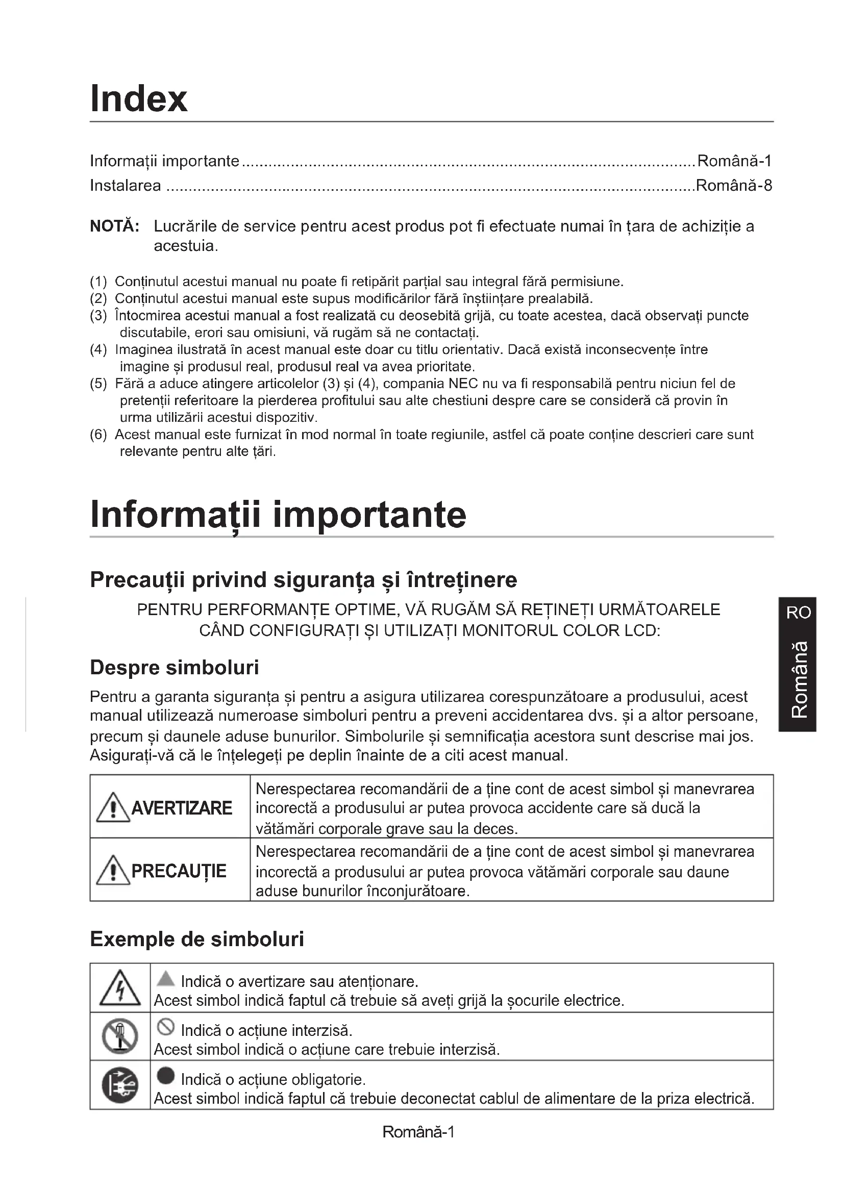 Română Informații importante ......................................................................................................Română-1 Instalarea .......................................................................................................................Română-8 Index NOTĂ: Lucrările de service pentru acest produs pot efectuate numai în țara de achiziție a acestuia.(1) Conținutul acestui manual nu poate retipărit parțial sau integral fără permisiune.(2) Conținutul acestui manual este supus modicărilor fără înștiințare prealabilă.(3) Întocmirea acestui manual a fost realizată cu deosebită grijă, cu toate acestea, dacă observați puncte discutabile, erori sau omisiuni, vă rugăm să ne contactați.(4) Imaginea ilustrată în acest manual este doar cu titlu orientativ. Dacă există inconsecvențe între imagine și produsul real, produsul real va avea prioritate.(5) Fără a aduce atingere articolelor (3) și (4), compania NEC nu va responsabilă pentru niciun fel de pretenții referitoare la pierderea protului sau alte chestiuni despre care se consideră că provin în urma utilizării acestui dispozitiv.(6) Acest manual este furnizat în mod normal în toate regiunile, astfel că poate conține descrieri care sunt relevante pentru alte țări. Informații importante Precauții privind siguranța și întreținere PENTRU PERFORMANȚE OPTIME, VĂ RUGĂM SĂ REȚINEȚI URMĂTOARELE CÂND CONFIGURAȚI ȘI UTILIZAȚI MONITORUL COLOR LCD: Despre simboluri Pentru a garanta siguranța și pentru a asigura utilizarea corespunzătoare a produsului, acest manual utilizează numeroase simboluri pentru a preveni accidentarea dvs. și a altor persoane, precum și daunele aduse bunurilor. Simbolurile și semnicația acestora sunt descrise mai jos. Asigurați-vă că le înțelegeți pe deplin înainte de a citi acest manual. AVERTIZARE Nerespectarea recomandării de a ține cont de acest simbol și manevrarea incorectă a produsului ar putea provoca accidente care să ducă la vătămări corporale grave sau la deces. PRECAUȚIE Nerespectarea recomandării de a ține cont de acest simbol și manevrarea incorectă a produsului ar putea provoca vătămări corporale sau daune aduse bunurilor înconjurătoare. Exemple de simboluri Indică o avertizare sau atenționare. Acest simbol indică faptul că trebuie să aveți grijă la șocurile electrice. Indică o acțiune interzisă. Acest simbol indică o acțiune care trebuie interzisă. Indică o acțiune obligatorie. Acest simbol indică faptul că trebuie deconectat cablul de alimentare de la priza electrică.Română-2 AVERTIZARE