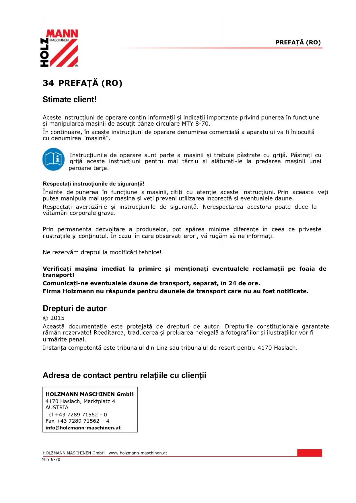Laat storingen of defecten welke de veiligheid van de machine kunnen benadelen onmiddellijk verhelpen. De complete en regelmatige reiniging van de machine garandeert een lange gebruiksduur en is een veiligheidsvoorwaarde. Gebruik uitsluitend milde reinigingsmiddelen, dat betekent geen benzine, petroleum, soda, etc... Controleer regelmatig of de waarschuwings- en veiligheidsindicaties aan de machine voorhanden en in een perfect leesbare toestand zijn. Controleer de perfecte toestand van de veiligheidsvoorzieningen vóór elk bedrijf. De machine mag niet in een vochtige ruimte worden opgeslagen en moet tegen de invloed van weersomstandigheden worden beschermd. Controleer tenminste één keer per week alle schroefverbindingen op vaste zitting. Het verhelpen van defecten gebeurt door uw specialist. Reparatiewerkzaamheden mogen slechts door vakpersoneel worden uitgevoerd.PREFAȚĂ (RO) HOLZMANN MASCHINEN GmbH www.holzmann-maschinen.at 53 MTY 8-70 34 PREFAȚĂ (RO) Stimate client! Aceste instrucțiuni de operare conțin informații și indicații importante privind punerea în funcțiune și manipularea mașinii de ascuțit pânze circulare MTY 8-70. În continuare, în aceste instrucțiuni de operare denumirea comercială a aparatului va fi înlocuită cu denumirea ”mașină”. Instrucțiunile de operare sunt parte a mașinii și trebuie păstrate cu grijă. Păstrați cu grijă aceste instrucțiuni pentru mai târziu și alăturați-le la predarea mașinii unei peroane terțe. Respectați instrucțiunile de siguranță! Înainte de punerea în funcțiune a mașinii, citiți cu atenție aceste instrucțiuni. Prin aceasta veți putea manipula mai ușor mașina și veți preveni utilizarea incorectă și eventualele daune. Respectați avertizările și instrucțiunile de siguranță. Nerespectarea acestora poate duce la vătămări corporale grave. Prin permanenta dezvoltare a produselor, pot apărea minime diferențe în ceea ce privește ilustrațiile și conținutul. În cazul în care observați erori, vă rugăm să ne informați. Ne rezervăm dreptul la modificări tehnice! Verificați mașina imediat la primire și menționați eventualele reclamații pe foaia de transport! Comunicați-ne eventualele daune de transport, separat, în 24 de ore. Firma Holzmann nu răspunde pentru daunele de transport care nu au fost notificate. Drepturi de autor © 2015 Această documentație este protejată de drepturi de autor. Drepturile constituționale garantate rămân rezervate! Reeditarea, traducerea și preluarea nelegală a fotografiilor și ilustrațiilor vor fi urmărite penal. Instanța competentă este tribunalul din Linz sau tribunalul de resort pentru 4170 Haslach.