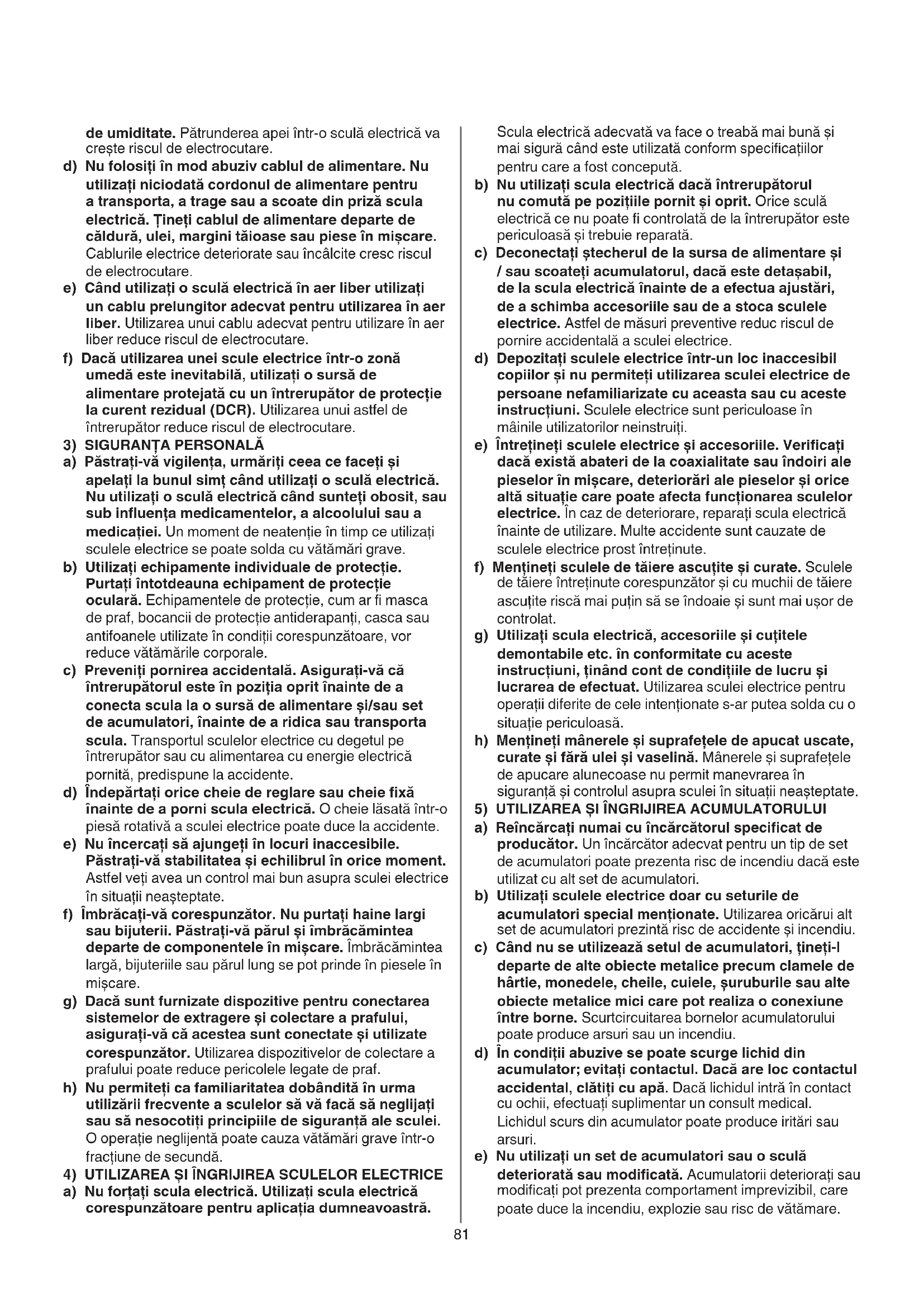 - Citiţi și păstraţi acest manual de instrucţiuni.381 Scula electrică adecvată va face o treabă mai bună și mai sigură când este utilizată conform specicaţiilor pentru care a fost concepută. b) Nu utilizaţi scula electrică dacă întrerupătorul nu comută pe poziţiile pornit și oprit. Orice sculă electrică ce nu poate controlată de la întrerupător este periculoasă și trebuie reparată. c) Deconectaţi ștecherul de la sursa de alimentare și / sau scoateţi acumulatorul, dacă este detașabil, de la scula electrică înainte de a efectua ajustări, de a schimba accesoriile sau de a stoca sculele electrice. Astfel de măsuri preventive reduc riscul de pornire accidentală a sculei electrice. d) Depozitaţi sculele electrice într-un loc inaccesibil copiilor și nu permiteţi utilizarea sculei electrice de persoane nefamiliarizate cu aceasta sau cu aceste instrucţiuni. Sculele electrice sunt periculoase în mâinile utilizatorilor neinstruiţi. e) Întreţineţi sculele electrice și accesoriile. Vericaţi dacă există abateri de la coaxialitate sau îndoiri ale pieselor în mișcare, deteriorări ale pieselor și orice altă situaţie care poate afecta funcţionarea sculelor electrice. În caz de deteriorare, reparaţi scula electrică înainte de utilizare. Multe accidente sunt cauzate de sculele electrice prost întreţinute. f) Menţineţi sculele de tăiere ascuţite și curate. Sculele de tăiere întreţinute corespunzător și cu muchii de tăiere ascuţite riscă mai puţin să se îndoaie și sunt mai ușor de controlat. g) Utilizaţi scula electrică, accesoriile și cuţitele demontabile etc. în conformitate cu aceste instrucţiuni, ţinând cont de condiţiile de lucru și lucrarea de efectuat. Utilizarea sculei electrice pentru operaţii diferite de cele intenţionate s-ar putea solda cu o situaţie periculoasă. h) Menţineţi mânerele și suprafeţele de apucat uscate, curate și fără ulei și vaselină. Mânerele și suprafeţele de apucare alunecoase nu permit manevrarea în siguranţă și controlul asupra sculei în situaţii neașteptate.