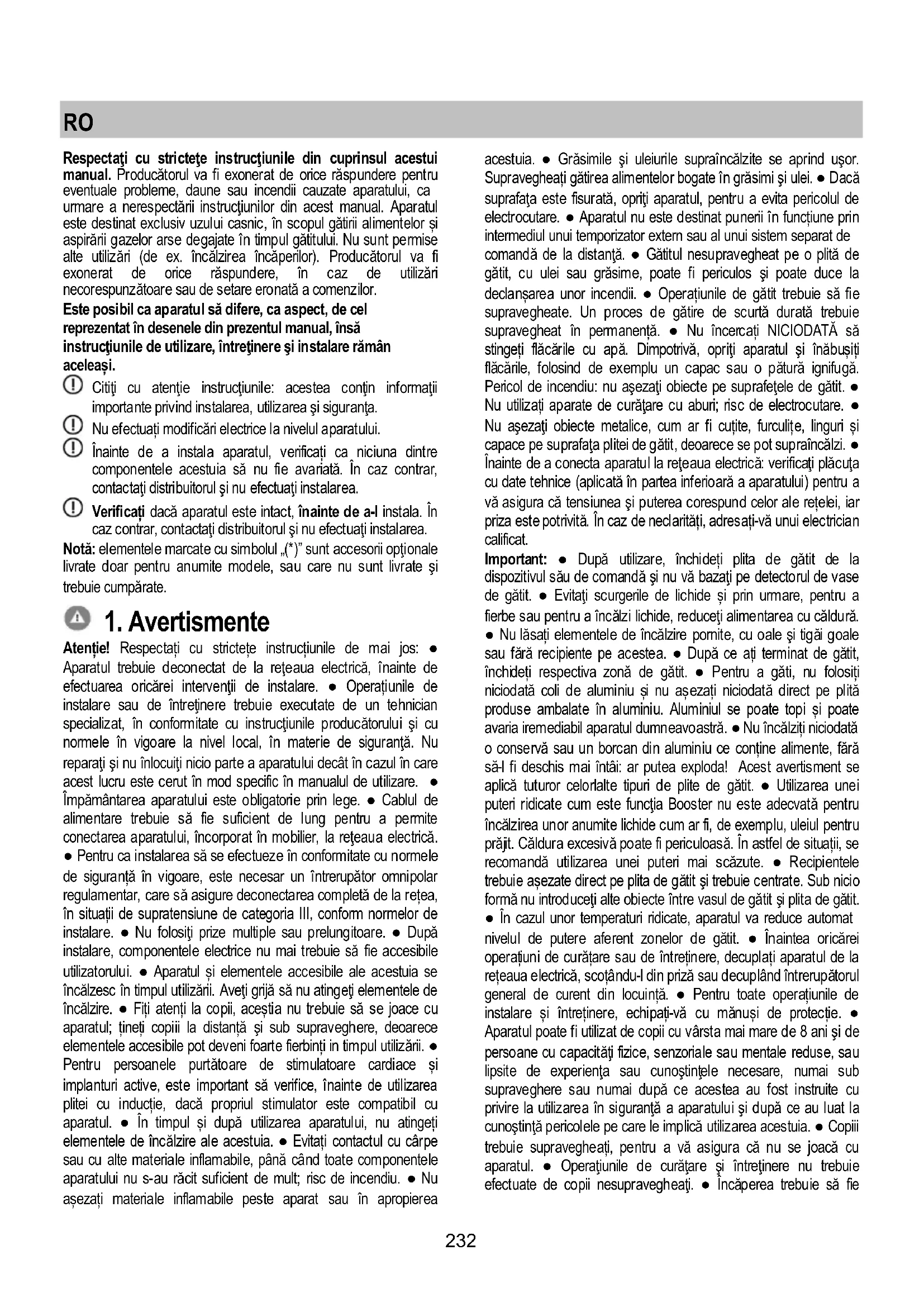 Atenție! Respectați cu strictețe instrucțiunile de mai jos: ● Aparatul trebuie deconectat de la reţeaua electrică, înainte de efectuarea oricărei intervenţii de instalare. ● Operațiunile de instalare sau de întreţinere trebuie executate de un tehnician specializat, în conformitate cu instrucţiunile producătorului şi cu normele în vigoare la nivel local, în materie de siguranţă. Nu reparaţi şi nu înlocuiţi nicio parte a aparatului decât în cazul în care acest lucru este cerut în mod specific în manualul de utilizare. ● Împământarea aparatului este obligatorie prin lege. ● Cablul de alimentare trebuie să fie suficient de lung pentru a permite conectarea aparatului, încorporat în mobilier, la reţeaua electrică. ● Pentru ca instalarea să se efectueze în conformitate cu normele de siguranță în vigoare, este necesar un întrerupător omnipolar regulamentar, care să asigure deconectarea completă de la rețea, în situații de supratensiune de categoria III, conform normelor de instalare. ● Nu folosiţi prize multiple sau prelungitoare. ● După instalare, componentele electrice nu mai trebuie să fie accesibile utilizatorului. ● Aparatul și elementele accesibile ale acestuia se încălzesc în timpul utilizării. Aveţi grijă să nu atingeţi elementele de încălzire. ● Fiți atenți la copii, aceștia nu trebuie să se joace cu aparatul; țineți copiii la distanță şi sub supraveghere, deoarece elementele accesibile pot deveni foarte fierbinți in timpul utilizării. ● Pentru persoanele purtătoare de stimulatoare cardiace și implanturi active, este important să verifice, înainte de utilizarea plitei cu inducție, dacă propriul stimulator este compatibil cu aparatul. ● În timpul și după utilizarea aparatului, nu atingeți elementele de încălzire ale acestuia. ● Evitați contactul cu cârpe sau cu alte materiale inflamabile, până când toate componentele aparatului nu s-au răcit suficient de mult; risc de incendiu. ● Nu așezați materiale inflamabile peste aparat sau în apropierea acestuia. ● Grăsimile şi uleiurile supraîncălzite se aprind uşor. Supravegheați gătirea alimentelor bogate în grăsimi şi ulei. ● Dacă suprafaţa este fisurată, opriţi aparatul, pentru a evita pericolul de electrocutare. ● Aparatul nu este destinat punerii în funcțiune prin intermediul unui temporizator extern sau al unui sistem separat de comandă de la distanţă. ● Gătitul nesupravegheat pe o plită de gătit, cu ulei sau grăsime, poate fi periculos şi poate duce la declanșarea unor incendii. ● Operațiunile de gătit trebuie să fie supravegheate. Un proces de gătire de scurtă durată trebuie supravegheat în permanență. ● Nu încercați NICIODATĂ să stingeți flăcările cu apă. Dimpotrivă, opriţi aparatul şi înăbușiți flăcările, folosind de exemplu un capac sau o pătură ignifugă. Pericol de incendiu: nu aşezaţi obiecte pe suprafeţele de gătit. ● Nu utilizați aparate de curăţare cu aburi; risc de electrocutare. ● Nu aşezaţi obiecte metalice, cum ar fi cuțite, furculițe, linguri și capace pe suprafaţa plitei de gătit, deoarece se pot supraîncălzi. ● Înainte de a conecta aparatul la reţeaua electrică: verificaţi plăcuţa cu date tehnice (aplicată în partea inferioară a aparatului) pentru a vă asigura că tensiunea şi puterea corespund celor ale rețelei, iar priza este potrivită. În caz de neclarități, adresați-vă unui electrician calificat. Important: ● După utilizare, închideți plita de gătit de la dispozitivul său de comandă şi nu vă bazaţi pe detectorul de vase de gătit. ● Evitaţi scurgerile de lichide și prin urmare, pentru a fierbe sau pentru a încălzi lichide, reduceţi alimentarea cu căldură. ● Nu lăsați elementele de încălzire pornite, cu oale şi tigăi goale sau fără recipiente pe acestea. ● După ce ați terminat de gătit, închideți respectiva zonă de gătit. ● Pentru a găti, nu folosiți niciodată coli de aluminiu și nu așezați niciodată direct pe plită produse ambalate în aluminiu. Aluminiul se poate topi și poate avaria iremediabil aparatul dumneavoastră. ● Nu încălzi ți niciodată o conservă sau un borcan din aluminiu ce conține alimente, fără să-l fi deschis mai întâi: ar putea exploda! Acest avertisment se aplică tuturor celorlalte tipuri de plite de gătit. ● Utilizarea unei puteri ridicate cum este funcţia Booster nu este adecvată pentru încălzirea unor anumite lichide cum ar fi, de exemplu, uleiul pentru prăjit. Căldura excesivă poate fi periculoasă. În astfel de situații, se recomandă utilizarea unei puteri mai scăzute. ● Recipientele trebuie așezate direct pe plita de gătit şi trebuie centrate. Sub nicio formă nu introduceţi alte obiecte între vasul de gătit şi plita de gătit. ● În cazul unor temperaturi ridicate, aparatul va reduce automat nivelul de putere aferent zonelor de gătit. ● Înaintea oricărei operațiuni de curățare sau de întreținere, decuplați aparatul de la rețeaua electrică, scoțându-l din priză sau decuplând întrerupătorul general de curent din locuință. ● Pentru toate opera țiunile de instalare și întreținere, echipați-vă cu mănuși de protecție. ● Aparatul poate fi utilizat de copii cu vârsta mai mare de 8 ani şi de persoane cu capacităţi fizice, senzoriale sau mentale reduse, sau lipsite de experienţa sau cunoştinţele necesare, numai sub supraveghere sau numai după ce acestea au fost instruite cu privire la utilizarea în siguranţă a aparatului şi după ce au luat la cunoştinţă pericolele pe care le implică utilizarea acestuia. ● Copiii trebuie supravegheați, pentru a vă asigura că nu se joacă cu aparatul. ● Operaţiunile de curăţare şi întreţinere nu trebuie efectuate de copii nesupravegheaţi. ● Încăperea trebuie să fie233 suficient de bine ventilat