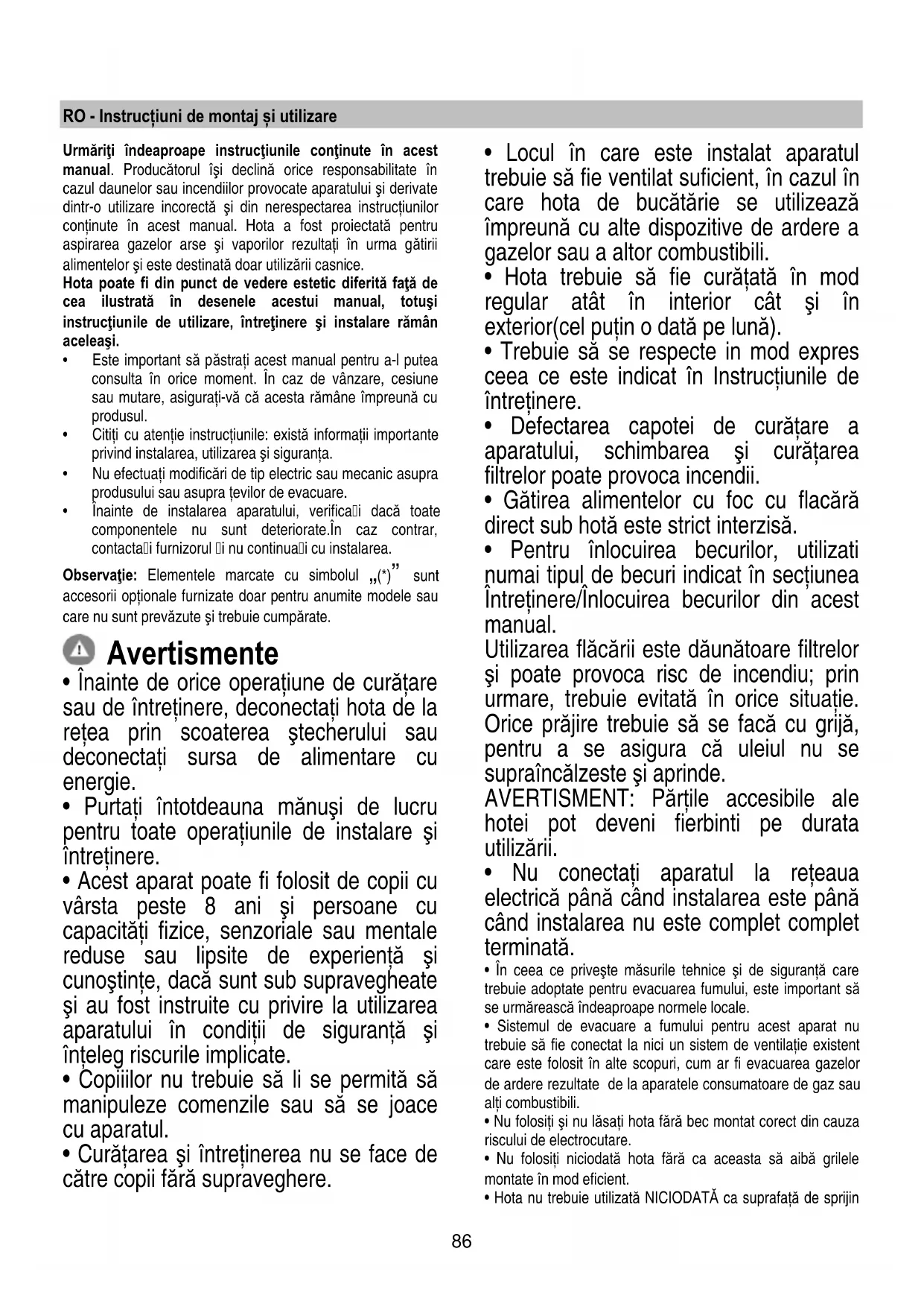 - Nu folosiţi niciodată hota fără ca aceasta să aibă grilele montate în mod eficient.