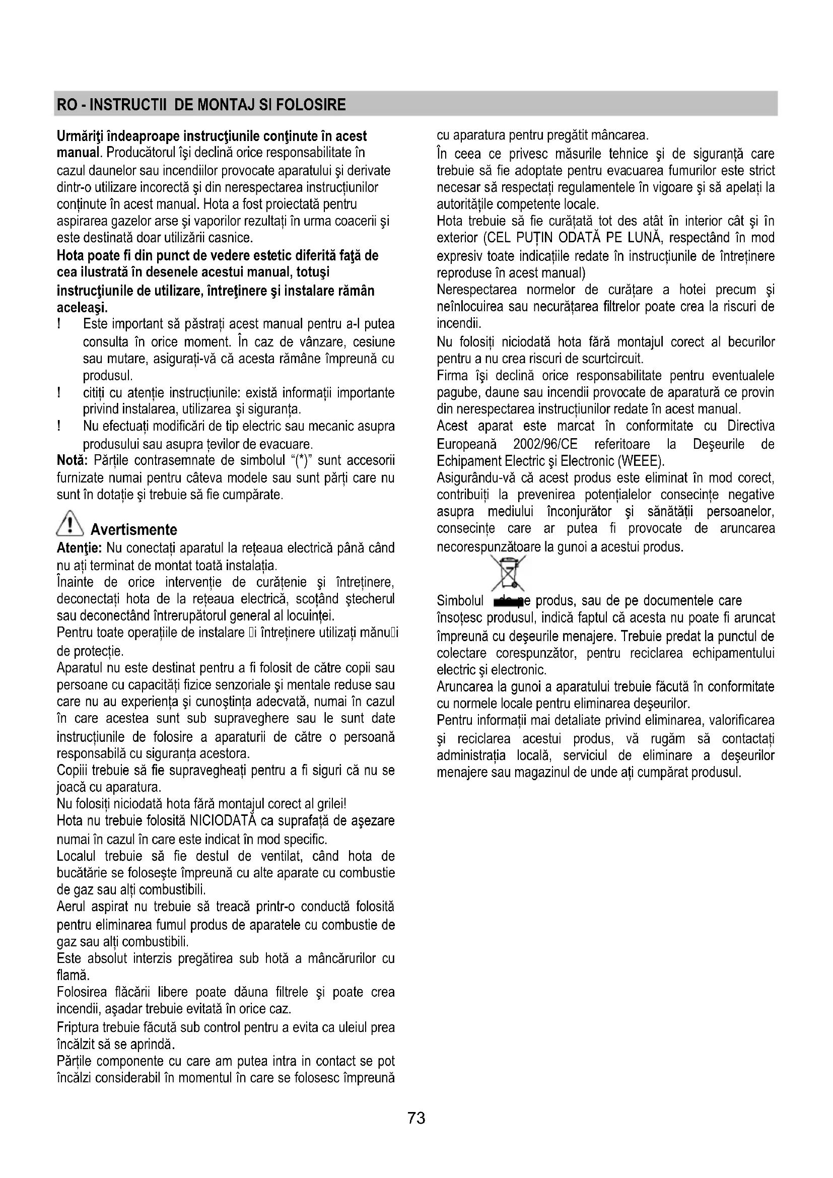 Подмяна на ел. крушки Аспираторът разполага с осветителна система със СВЕТОДИОДИ. СВЕТОДИОДИТЕ гарантират оптимално осветление, до 10 пъти по-силно от традиционните лампи и позволяват 90% икономия на електроенергия. За подмяна се обърнете към сервиза за техническо обслужване.73 RO - INSTRUCTII DE MONTAJ SI FOLOSIRE Urmăriţi îndeaproape instrucţiunile conţinute în acest manual. Producătorul îşi declină orice responsabilitate în cazul daunelor sau incendiilor provocate aparatului şi derivate dintr-o utilizare incorectă şi din nerespectarea instrucţiunilor conţinute în acest manual. Hota a fost proiectată pentru aspirarea gazelor arse şi vaporilor rezultaţi în urma coacerii şi este destinată doar utilizării casnice. Hota poate fi din punct de vedere estetic diferită faţă de cea ilustrată în desenele acestui manual, totuşi instrucţiunile de utilizare, întreţinere şi instalare rămân aceleaşi. ! Este important să păstraţi acest manual pentru a-l putea consulta în orice moment. În caz de vânzare, cesiune sau mutare, asiguraţi-vă că acesta rămâne împreună cu produsul. ! citiţi cu atenţie instrucţiunile: există informaţii importante privind instalarea, utilizarea şi siguranţa. ! Nu efectuaţi modificări de tip electric sau mecanic asupra produsului sau asupra ţevilor de evacuare. Notă: Părţile contrasemnate de simbolul “(*)” sunt accesorii furnizate numai pentru câteva modele sau sunt părţi care nu sunt în dotaţie şi trebuie să fie cumpărate. Avertismente Atenţie: Nu conectaţi aparatul la reţeaua electrică până când nu aţi terminat de montat toată instalaţia. Înainte de orice intervenţie de curăţenie şi întreţinere, deconectaţi hota de la reţeaua electrică, scoţând ştecherul sau deconectând întrerupătorul general al locuinţei. Pentru toate operaţiile de instalare i întreţinere utilizaţi mănui de protecţie. Aparatul nu este destinat pentru a fi folosit de către copii sau persoane cu capacităţi fizice senzoriale şi mentale reduse sau care nu au experienţa şi cunoştinţa adecvată, numai în cazul în care acestea sunt sub supraveghere sau le sunt date instrucţiunile de folosire a aparaturii de către o persoană responsabilă cu siguranţa acestora. Copiii trebuie să fie supravegheaţi pentru a fi siguri că nu se joacă cu aparatura. Nu folosiţi niciodată hota fără montajul corect al grilei! Hota nu trebuie folosită NICIODATĂ ca suprafaţă de aşezare numai în cazul în care este indicat în mod specific. Localul trebuie să fie destul de ventilat, când hota de bucătărie se foloseşte împreună cu alte aparate cu combustie de gaz sau alţi combustibili. Aerul aspirat nu trebuie să treacă printr-o conductă folosită pentru eliminarea fumul produs de aparatele cu combustie de gaz sau alţi combustibili. Este absolut interzis pregătirea sub hotă a mâncărurilor cu flamă. Folosirea flăcării libere poate dăuna filtrele şi poate crea incendii, aşadar trebuie evitată în orice caz. Friptura trebuie făcută sub control pentru a evita ca uleiul prea încălzit să se aprindă. Părţile componente cu care am putea intra in contact se pot încălzi considerabil în momentul în care se folosesc împreună cu aparatura pentru pregătit mâncarea. În ceea ce privesc măsurile tehnice şi de siguranţă care trebuie să fie adoptate pentru evacuarea fumurilor este strict necesar s ă respectaţi regulamentele în vigoare şi să apelaţi la autorităţile competente locale. Hota trebuie să fie curăţată tot des atât în interior cât şi în exterior (CEL PUŢIN ODATĂ PE LUNĂ, respectând în mod expresiv toate indicaţiile redate în instrucţiunile de întreţinere reproduse în acest manual) Nerespectarea normelor de curăţare a hotei precum şi neînlocuirea sau necurăţarea filtrelor poate crea la riscuri de incendii. Nu folosiţi niciodată hota fără montajul corect al becurilor pentru a nu crea riscuri de scurtcircuit. Firma îşi declină orice responsabilitate pentru eventualele pagube, daune sau incendii provocate de aparatură ce provin din nerespectarea instrucţiunilor redate în acest manual. Acest aparat este marcat în conformitate cu Directiva Europeană 2002/96/CE referitoare la Deşeurile de Echipament Electric şi Electronic (WEEE). Asigurându-vă că acest produs este eliminat în mod corect, contribuiţi la prevenirea potenţialelor consecinţe negative asupra mediului înconjurător şi sănătăţii persoanelor, consecinţe care ar putea fi provocate de aruncarea necorespunză toare la gunoi a acestui produs. Simbolul de pe produs, sau de pe documentele care însoţesc produsul, indică faptul că acesta nu poate fi aruncat împreună cu deşeurile menajere. Trebuie predat la punctul de colectare corespunzător, pentru reciclarea echipamentului electric şi electronic. Aruncarea la gunoi a aparatului trebuie făcută în conformitate cu normele locale pentru eliminarea deşeurilor. Pentru informaţii mai detaliate privind eliminarea, valorificarea şi reciclarea acestui produs, vă rugăm să contactaţi administraţia locală, serviciul de eliminare a deşeurilor menajere sau magazinul de unde aţi cumpărat produsul.74 Utilizarea Hota a fost realizată pentru a fi utilizată în versiunea aspirantă cu evacuare externă sau în versiunea filtrantă cu riciclu intern. Versiunea aspirantă Vaporii sunt evacuaţi către exterior prin intermediul unui tub de evacuare fixat la flanşa de racord. Diametrul tubului de evacuare trebuie să fie echivalent cu diametrul inelului de conexiune. Atenţie! Tubul de evacuare nu se furnizează din dotare; acesta trebuie achiziţionat. În partea orizontală, tubul trebuie să