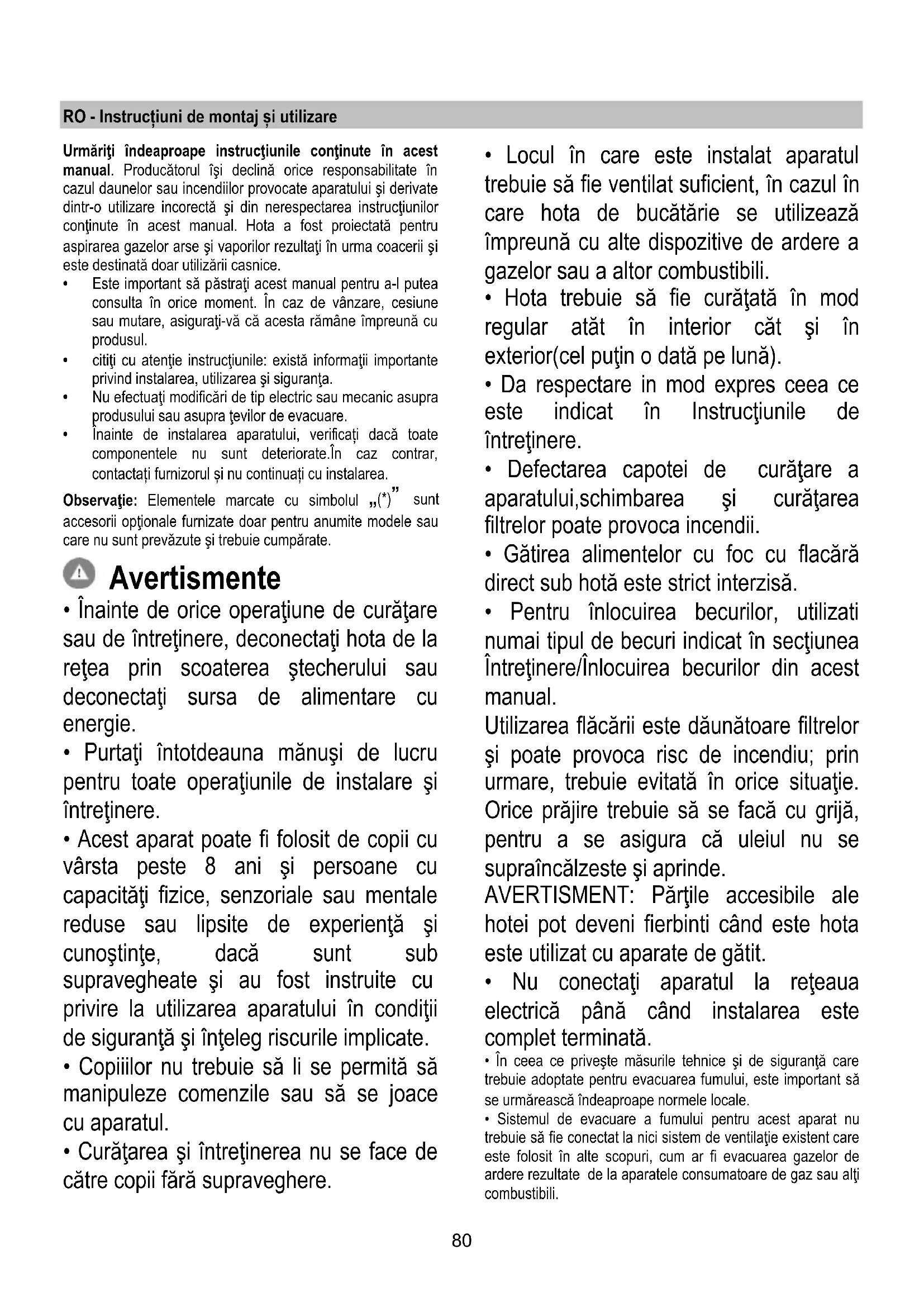 Монтирайте отново решетката. Ако ел. крушките не светят, проверете дали са монтирани правилно преди да потърсите помощта на специалист.80 RO - Instrucțiuni de montaj și utilizare Urmăriţi îndeaproape instrucţiunile conţinute în acest manual. Producătorul îşi declină orice responsabilitate în cazul daunelor sau incendiilor provocate aparatului şi derivate dintr-o utilizare incorectă şi din nerespectarea instrucţiunilor conţinute în acest manual. Hota a fost proiectată pentru aspirarea gazelor arse şi vaporilor rezultaţi în urma coacerii şi este destinată doar utilizării casnice.