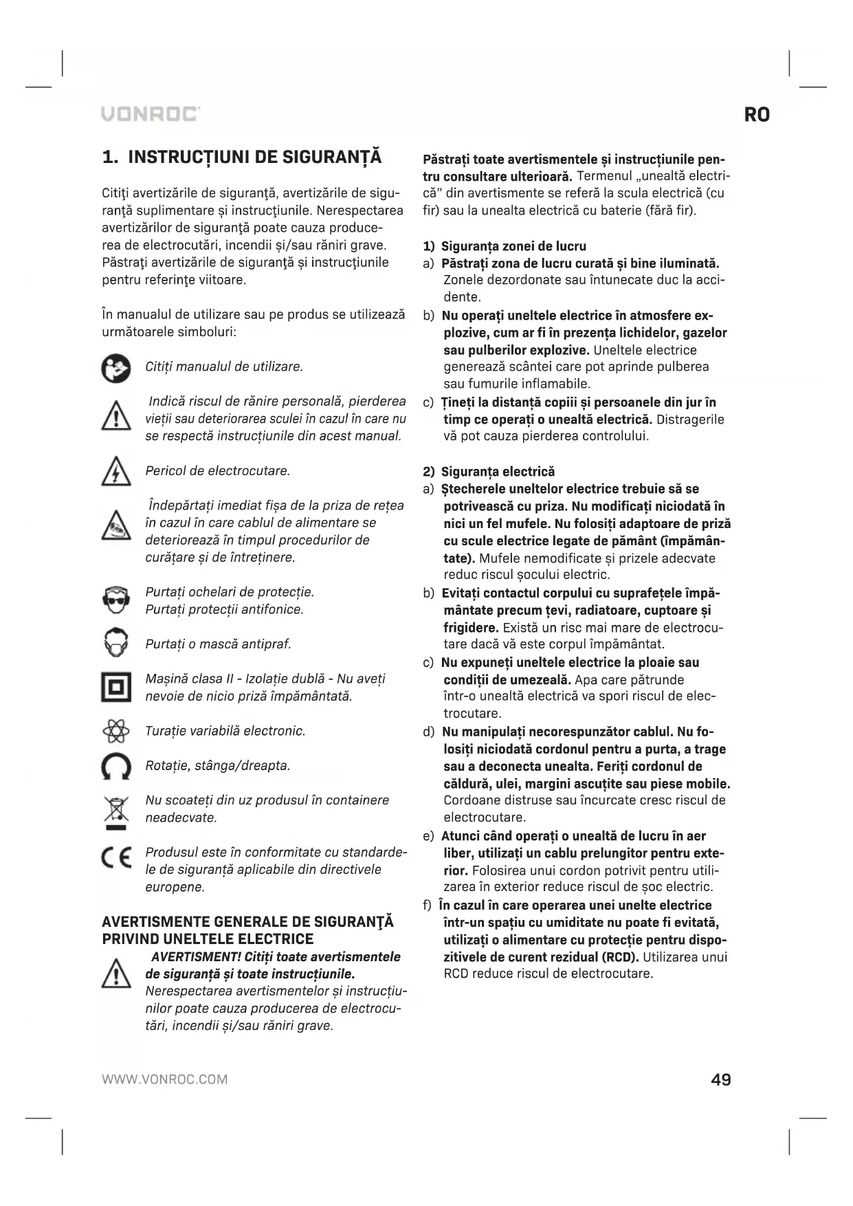 garantièle, vendabilitatea sau adecvarea pentru un anumit scop. In nicio situatae, VONROC nu este responsabil pentru daunele incidentale sau consecventaile. Remedierile dealerilor sunt limitate la repararea sau inlocuirea unitatilor sau pieselor neconforme.