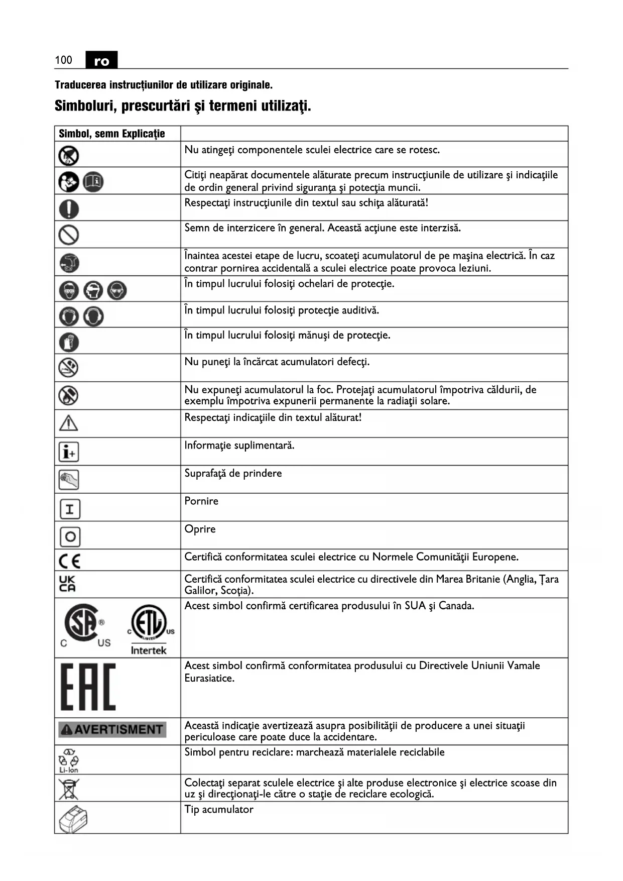 Traducerea instrucțiunilor de utilizare originale. Simboluri, prescurtări şi termeni utilizaţi. Simbol, semn Explicaţie Nu atingeţi componentele sculei electrice care se rotesc. Citiţi neapărat documentele alăturate precum instrucţiunile de utilizare şi indicaţiile de ordin general privind siguranţa şi potecţia muncii. Respectaţi instrucţiunile din textul sau schiţa alăturată! Semn de interzicere în general. Această acţiune este interzisă. Înaintea acestei etape de lucru, scoateţi acumulatorul de pe maşina electrică. În caz contrar pornirea accidentală a sculei electrice poate provoca leziuni. În timpul lucrului folosiţi ochelari de protecţie. În timpul lucrului folosiţi protecţie auditivă. În timpul lucrului folosiţi mănuşi de protecţie. Nu puneţi la încărcat acumulatori defecţi. Nu expuneţi acumulatorul la foc. Protejaţi acumulatorul împotriva căldurii, de exemplu împotriva expunerii permanente la radiaţii solare. Respectaţi indicaţiile din textul alăturat! Informaţie suplimentară. Suprafaţă de prindere Pornire Oprire Certifică conformitatea sculei electrice cu Normele Comunităţii Europene. Certifică conformitatea sculei electrice cu directivele din Marea Britanie (Anglia, Țara Galilor, Scoția). Acest simbol confirmă certificarea produsului în SUA şi Canada. Acest simbol confirmă conformitatea produsului cu Directivele Uniunii Vamale Eurasiatice. Această indicaţie avertizează asupra posibilităţii de producere a unei situaţii periculoase care poate duce la accidentare. Simbol pentru reciclare: marchează materialele reciclabile Colectaţi separat sculele electrice şi alte produse electronice şi electrice scoase din uz şi direcţionaţi-le către o staţie de reciclare ecologică. Tip acumulator101
