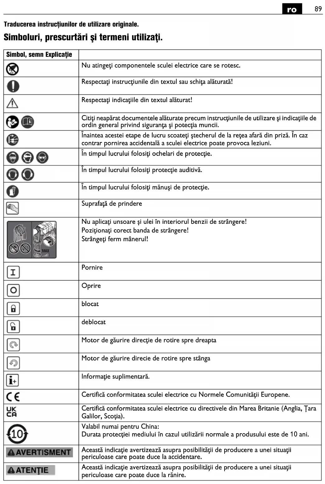 Traducerea instrucțiunilor de utilizare originale. Simboluri, prescurtări şi termeni utilizaţi. Simbol, semn Explicaţie Nu atingeţi componentele sculei electrice care se rotesc. Respectaţi instrucţiunile din textul sau schiţa alăturată! Respectaţi indicaţiile din textul alăturat! Citiţi neapărat documentele alăturate precum instrucţiunile de utilizare şi indicaţiile de ordin general privind siguranţa şi potecţia muncii. Înaintea acestei etape de lucru scoateţi ştecherul de la reţea afară din priză. În caz contrar pornirea accidentală a sculei electrice poate provoca leziuni. În timpul lucrului folosiţi ochelari de protecţie. În timpul lucrului folosiţi protecţie auditivă. În timpul lucrului folosiţi mănuşi de protecţie. Suprafaţă de prindere Nu aplicați unsoare și ulei în interiorul benzii de strângere! Poziționați corect banda de strângere! Strângeți ferm mânerul! Pornire Oprire blocat deblocat Motor de găurire direcție de rotire spre dreapta Motor de găurire direcie de rotire spre stânga Informaţie suplimentară. Certifică conformitatea sculei electrice cu Normele Comunităţii Europene. Certifică conformitatea sculei electrice cu directivele din Marea Britanie (Anglia, Țara Galilor, Scoția). Valabil numai pentru China: Durata protecției mediului în cazul utilizării normale a produsului este de 10 ani. Această indicaţie avertizează asupra posibilităţii de producere a unei situaţii periculoase care poate duce la accidentare. Această indicaţie avertizează asupra posibilităţii de producere a unei situaţii periculoase care poate duce la rănire. MAX90