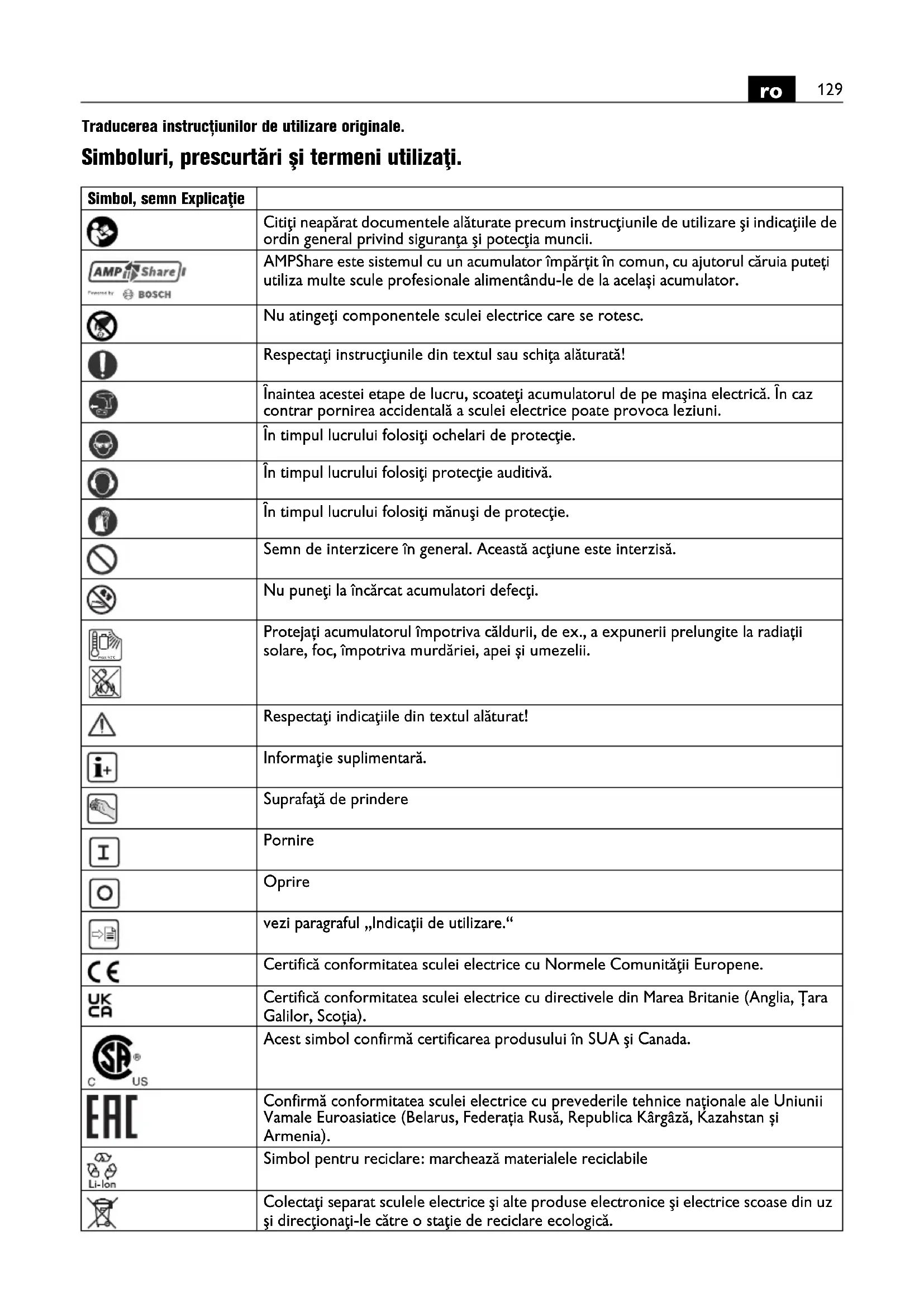 Traducerea instrucțiunilor de utilizare originale. Simboluri, prescurtări şi termeni utilizaţi. Simbol, semn Explicaţie Citiţi neapărat documentele alăturate precum instrucţiunile de utilizare şi indicaţiile de ordin general privind siguranţa şi potecţia muncii. AMPShare este sistemul cu un acumulator împărțit în comun, cu ajutorul căruia puteți utiliza multe scule profesionale alimentându-le de la același acumulator. Nu atingeţi componentele sculei electrice care se rotesc. Respectaţi instrucţiunile din textul sau schiţa alăturată! Înaintea acestei etape de lucru, scoateţi acumulatorul de pe maşina electrică. În caz contrar pornirea accidentală a sculei electrice poate provoca leziuni. În timpul lucrului folosiţi ochelari de protecţie. În timpul lucrului folosiţi protecţie auditivă. În timpul lucrului folosiţi mănuşi de protecţie. Semn de interzicere în general. Această acţiune este interzisă. Nu puneţi la încărcat acumulatori defecţi. Protejați acumulatorul împotriva căldurii, de ex., a expunerii prelungite la radiații solare, foc, împotriva murdăriei, apei și umezelii. Respectaţi indicaţiile din textul alăturat! Informaţie suplimentară. Suprafaţă de prindere Pornire Oprire vezi paragraful „Indicații de utilizare.“ Certifică conformitatea sculei electrice cu Normele Comunităţii Europene. Certifică conformitatea sculei electrice cu directivele din Marea Britanie (Anglia, Țara Galilor, Scoția). Acest simbol confirmă certificarea produsului în SUA şi Canada. Confirmă conformitatea sculei electrice cu prevederile tehnice naționale ale Uniunii Vamale Euroasiatice (Belarus, Federația Rusă, Republica Kârgâză, Kazahstan și Armenia). Simbol pentru reciclare: marchează materialele reciclabile Colectaţi separat sculele electrice şi alte produse electronice şi electrice scoase din uz şi direcţionaţi-le către o staţie de reciclare ecologică. max.50°C130