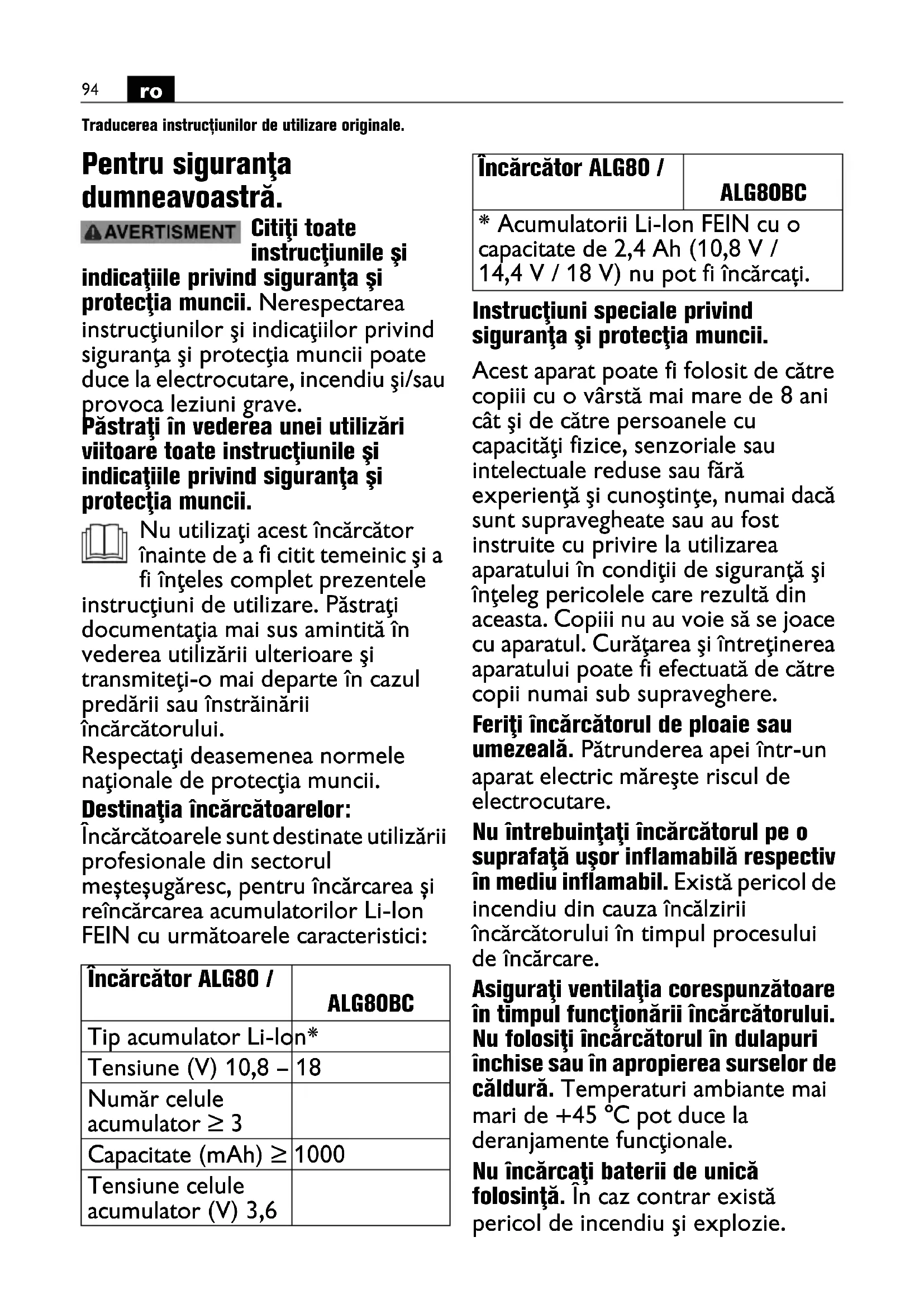 Traducerea instrucțiunilor de utilizare originale. Pentru siguranţa dumneavoastră. Citiţi toate instrucţiunile şi indicaţiile privind siguranţa şi protecţia muncii. Nerespectarea instrucţiunilor şi indicaţiilor privind siguranţa şi protecţia muncii poate duce la electrocutare, incendiu şi/sau provoca leziuni grave. Păstraţi în vederea unei utilizări viitoare toate instrucţiunile şi indicaţiile privind siguranţa şi protecţia muncii. Nu utilizaţi acest încărcător înainte de a fi citit temeinic şi a fi înţeles complet prezentele instrucţiuni de utilizare. Păstraţi documentaţia mai sus amintită în vederea utilizării ulterioare şi transmiteţi-o mai departe în cazul predării sau înstrăinării încărcătorului. Respectaţi deasemenea normele naţionale de protecţia muncii. Destinaţia încărcătoarelor: Încărcătoarele sunt destinate utilizării profesionale din sectorul meșteșugăresc, pentru încărcarea și reîncărcarea acumulatorilor Li-Ion FEIN cu următoarele caracteristici: Instrucţiuni speciale privind siguranţa şi protecţia muncii. Acest aparat poate fi folosit de către copiii cu o vârstă mai mare de 8 ani cât şi de către persoanele cu capacităţi fizice, senzoriale sau intelectuale reduse sau fără experienţă şi cunoştinţe, numai dacă sunt supravegheate sau au fost instruite cu privire la utilizarea aparatului în condiţii de siguranţă şi înţeleg pericolele care rezultă din aceasta. Copiii nu au voie să se joace cu aparatul. Curăţarea şi întreţinerea aparatului poate fi efectuată de către copii numai sub supraveghere. Feriţi încărcătorul de ploaie sau umezeală. Pătrunderea apei într-un aparat electric măreşte riscul de electrocutare. Nu întrebuinţaţi încărcătorul pe o suprafaţă uşor inflamabilă respectiv în mediu inflamabil. Există pericol de incendiu din cauza încălzirii încărcătorului în timpul procesului de încărcare. Asiguraţi ventilaţia corespunzătoare în timpul funcţionării încărcătorului. Nu folosiţi încărcătorul în dulapuri închise sau în apropierea surselor de căldură. Temperaturi ambiante mai mari de +45 °C pot duce la deranjamente funcţionale. Nu încărcaţi baterii de unică folosinţă. În caz contrar există pericol de incendiu şi explozie. Încărcător ALG80 / ALG80BC Tip acumulator Li-Ion* Tensiune (V) 10,8 – 18 Număr celule acumulator ≥ 3 Capacitate (mAh) ≥ 1000 Tensiune celule acumulator (V) 3,6