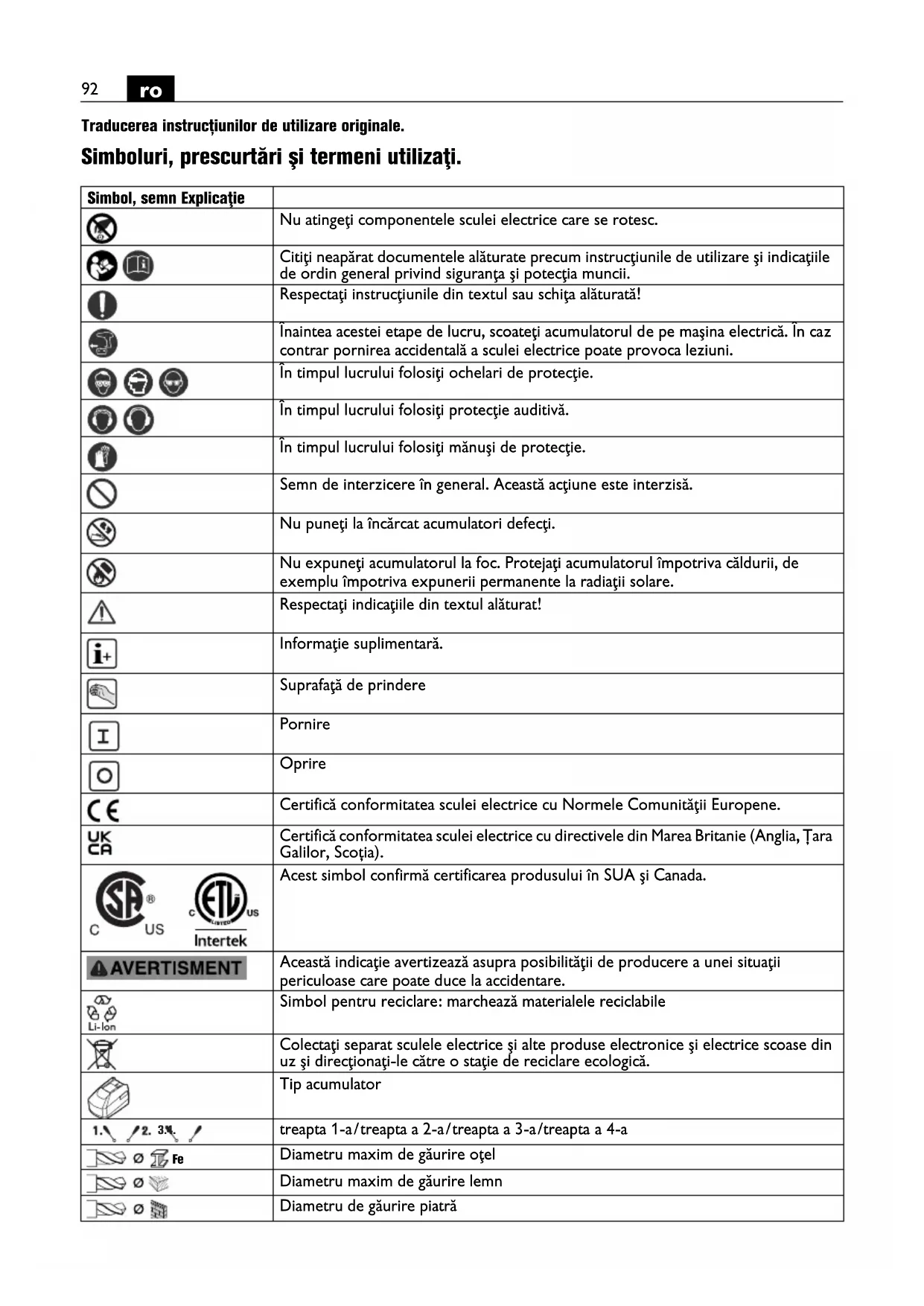 | Certifică conformitatea sculei electrice cu Normele Comunității Europene. | |