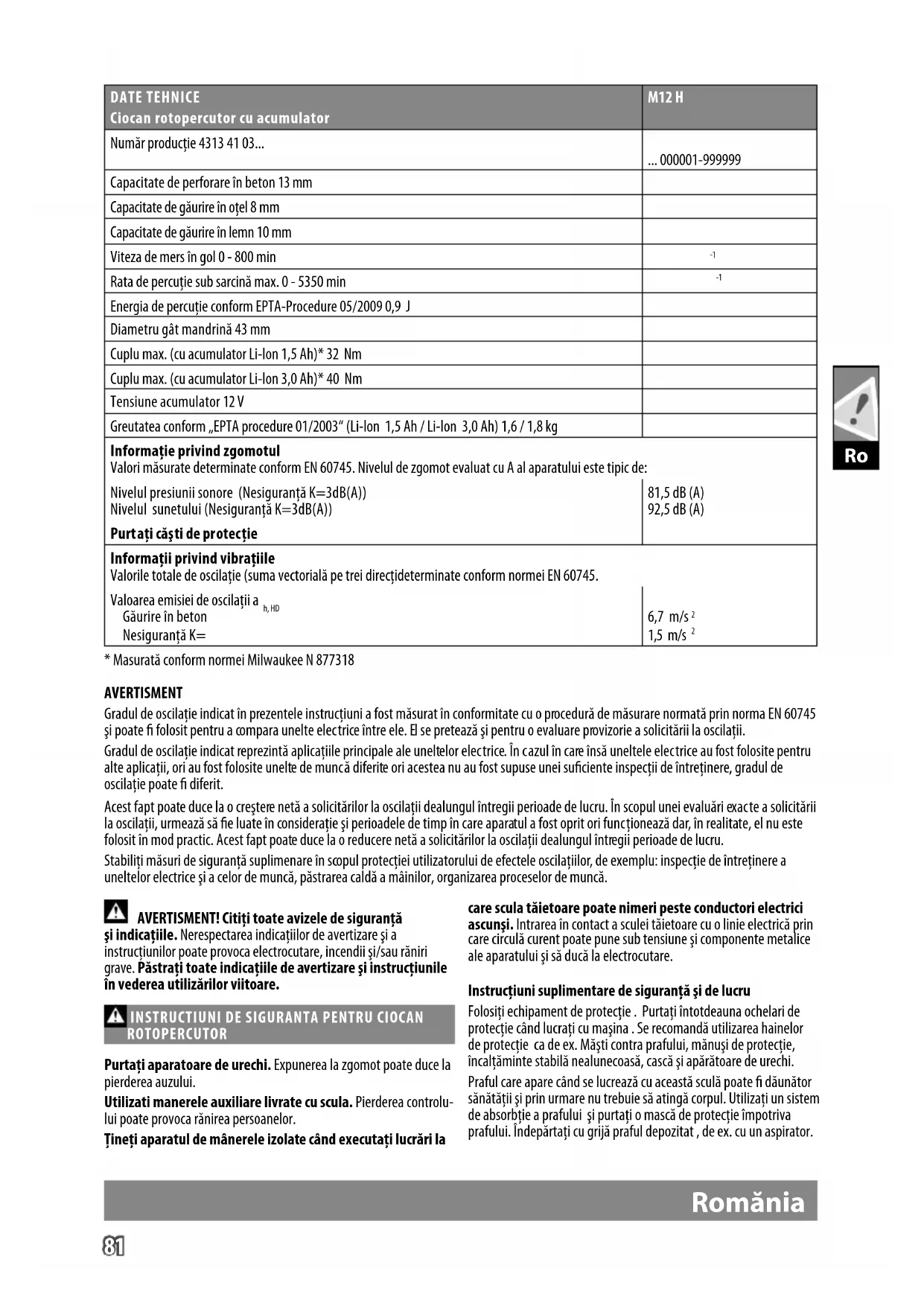 ROTOPERCUTOR Purtaţi aparatoare de urechi. Expunerea la zgomot poate duce la pierderea auzului. Utilizati manerele auxiliare livrate cu scula. Pierderea controlu- lui poate provoca rănirea persoanelor. Ţineţi aparatul de mânerele izolate când executaţi lucrări la care scula tăietoare poate nimeri peste conductori electrici ascunşi. Intrarea în contact a sculei tăietoare cu o linie electrică prin care circulă curent poate pune sub tensiune şi componente metalice ale aparatului şi să ducă la electrocutare. Instrucţiuni suplimentare de siguranţă şi de lucru Folosiţi echipament de protecţie . Purtaţi întotdeauna ochelari de protecţie când lucraţi cu maşina . Se recomandă utilizarea hainelor de protecţie ca de ex. Măşti contra prafului, mănuşi de protecţie, încalţăminte stabilă nealunecoasă, cască şi apărătoare de urechi. Praful care apare când se lucrează cu această sculă poate dăunător sănătăţii şi prin urmare nu trebuie să atingă corpul. Utilizaţi un sistem de absorbţie a prafului şi purtaţi o mască de protecţie împotriva prafului. Îndepărtaţi cu grijă praful depozitat , de ex. cu un aspirator. DATE TEHNICE Ciocan rotopercutor cu acumulator M12 H Număr producţie 4313 41 03... ... 000001-999999 Capacitate de perforare în beton 13 mm Capacitate de găurire în oţel 8 mm Capacitate de găurire în lemn 10 mm Viteza de mers în gol 0 - 800 min