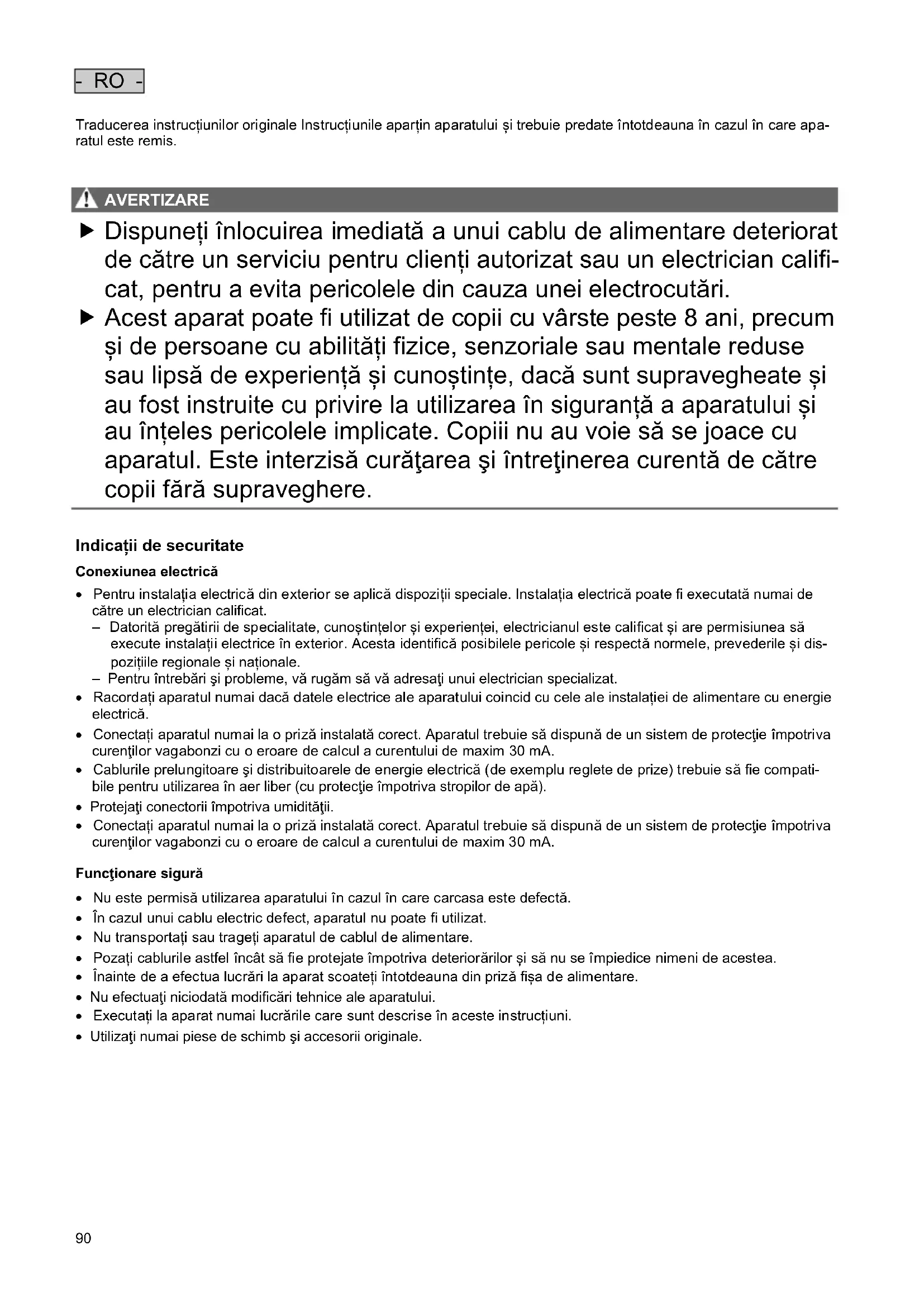 AVERTI ZARE AVERTIZARE Dispuneți înlocuirea imediată a unui cablu de alimentare deteriorat de către un serviciu pentru clienți autorizat sau un electrician califi- cat, pentru a evita pericolele din cauza unei electrocutări. Acest aparat poate fi utilizat de copii cu vârste peste 8 ani, precum și de persoane cu abilități fizice, senzoriale sau mentale reduse sau lipsă de experiență și cunoștințe, dacă sunt supravegheate și au fost instruite cu privire la utilizarea în siguranță a aparatului și au înțeles pericolele implicate. Copiii nu au voie să se joace cu aparatul. Este interzisă curăţarea şi întreţinerea curentă de către copii fără supraveghere.