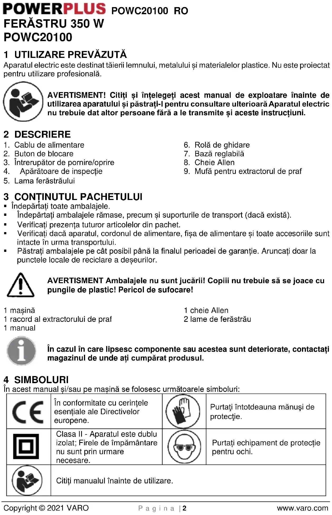 Citiți manualul înainte de utilizare.POWC20100 RO Copyright © 2021 VARO P a g i n a | 3 www.varo.com