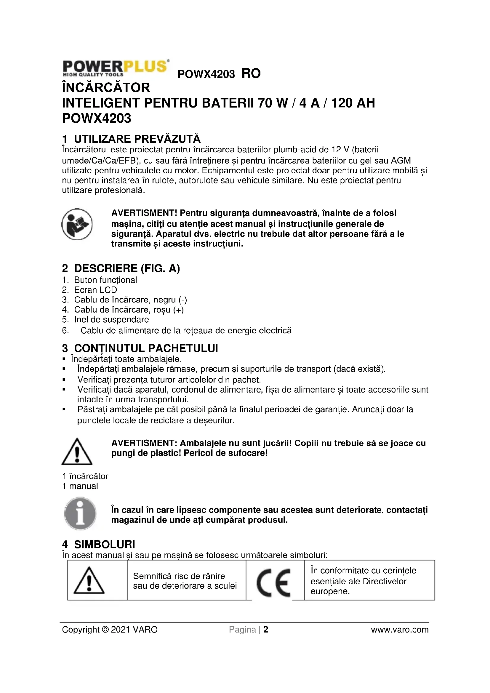 VARO-Vic. Van Rompuy N.V. - Joseph Van Instraat 9 - BE2500 Lier - BELGIA, declară că Produsul: Încărcător inteligent Marcă de comerț: POWERplus Model: POWX4203 este în conformitate cu specificațiile esențiale și alte prevederi relevante ale Directivelor Europene aplicabile, pe baza aplicării standardelor europene armonizate. Orice modificare neautorizată a aparatelor atrage după sine anularea acestei declarații. Directivele europene (inclusiv, dacă este cazul, amendamentele lor, până la data semnăturii): 2011/65/EU 2014/30/EU 2014/35/EU Standardele europene armonizate (inclusiv, dacă este cazul, amendamentele lor, până la data semnăturii): EN60335-1 : 2012 EN60335-2-29 : 2004 EN55014-1 : 2017 EN55014-2 : 2015 EN61000-3-2 : 2014 EN61000-3-3 : 2013 Persoana care păstrează documentația tehnică: Philippe Vankerkhove, VARO – Vic. Van Rompuy N.V. Subsemnatul acționează în numele Directorului general executiv al societății, Philippe Vankerkhove Divizia de reglementare – Director de conformitate Lier, 27/11/2020POWX4203 PL Copyright © 2021 VARO Strona | 1 www.varo.com 1 PRZEZNACZENIE ........................................................................... 2
