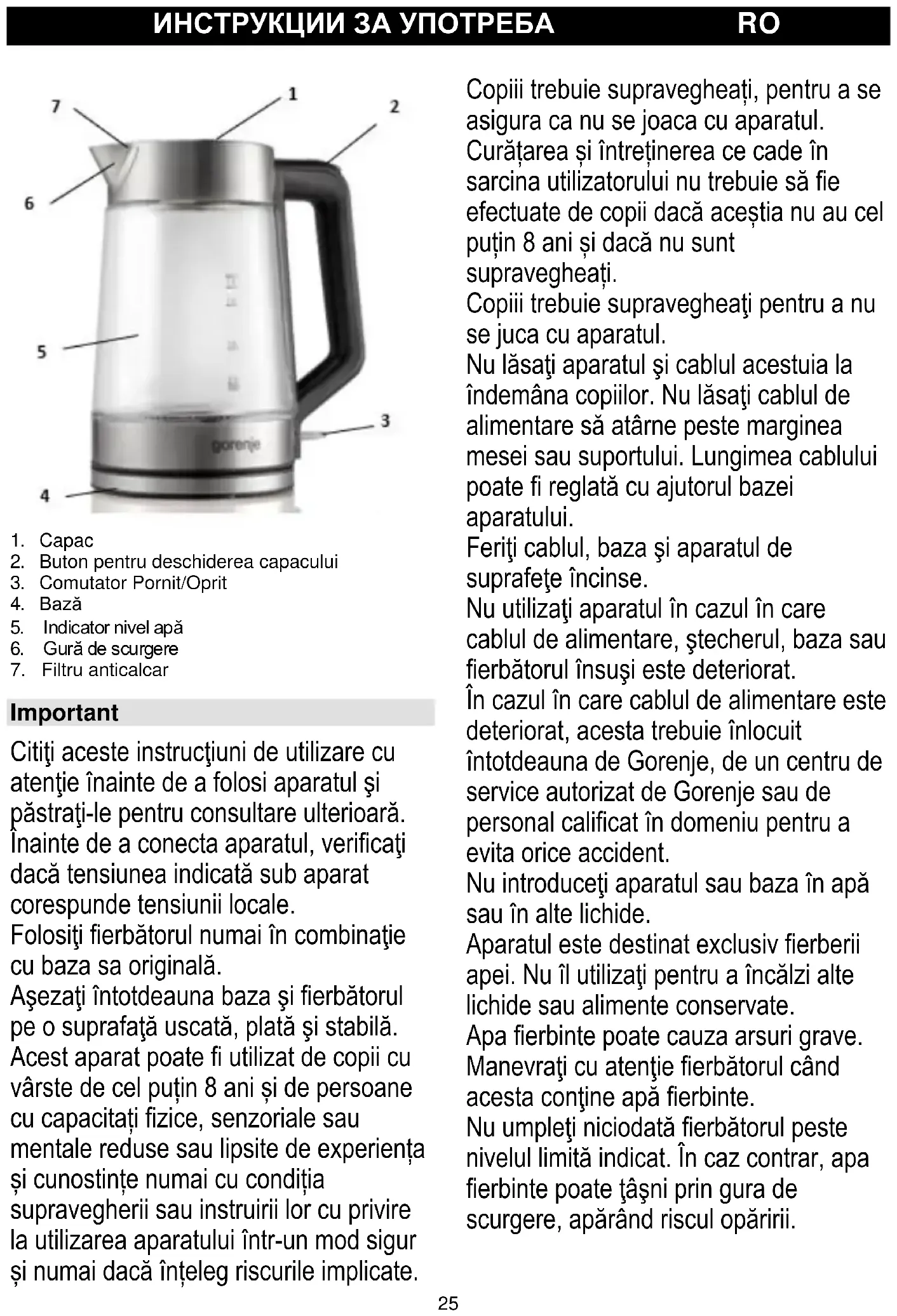 Important Citiţi aceste instrucţiuni de utilizare cu atenţie înainte de a folosi aparatul şi păstraţi-le pentru consultare ulterioară. Înainte de a conecta aparatul, verificaţi dacă tensiunea indicată sub aparat corespunde tensiunii locale. Folosiţi fierbătorul numai în combinaţie cu baza sa originală. Aşezaţi întotdeauna baza şi fierbătorul pe o suprafaţă uscată, plată şi stabilă. Acest aparat poate fi utilizat de copii cu vârste de cel puțin 8 ani și de persoane cu capacitați fizice, senzoriale sau mentale reduse sau lipsite de experiența și cunostințe numai cu condiția supravegherii sau instruirii lor cu privire la utilizarea aparatului într-un mod sigur și numai dacă înțeleg riscurile implicate. Copiii trebuie supravegheați, pentru a se asigura ca nu se joaca cu aparatul. Curățarea și întreținerea ce cade în sarcina utilizatorului nu trebuie să fie efectuate de copii dacă aceștia nu au cel puțin 8 ani și dacă nu sunt supravegheați. Copiii trebuie supravegheaţi pentru a nu se juca cu aparatul. Nu lăsaţi aparatul şi cablul acestuia la îndemâna copiilor. Nu lăsaţi cablul de alimentare să atârne peste marginea mesei sau suportului. Lungimea cablului poate fi reglată cu ajutorul bazei aparatului. Feriţi cablul, baza şi aparatul de suprafeţe încinse. Nu utilizaţi aparatul în cazul în care cablul de alimentare, ştecherul, baza sau fierbătorul însuşi este deteriorat. În cazul în care cablul de alimentare este deteriorat, acesta trebuie înlocuit întotdeauna de Gorenje, de un centru de service autorizat de Gorenje sau de personal calificat în domeniu pentru a evita orice accident. Nu introduceţi aparatul sau baza în apă sau în alte lichide. Aparatul este destinat exclusiv fierberii apei. Nu îl utilizaţi pentru a încălzi alte lichide sau alimente conservate. Apa fierbinte poate cauza arsuri grave. Manevraţi cu atenţie fierbătorul când acesta conţine apă fierbinte. Nu umpleţi niciodată fierbătorul peste nivelul limită indicat. În caz contrar, apa fierbinte poate ţâşni prin gura de scurgere, apărând riscul opăririi.26 Nu ridicaţi capacul în timp ce fierbe apa. Procedaţi cu atenţie când ridicaţi capacul imediat după ce a fiert apa: aburul rezultat este foarte fierbinte. Evitaţi să atingeţi corpul fierbătorului, deoarece în timpul funcţionării devine foarte fierbinte. Ridicaţi întotdeauna fierbătorul ţinându-l de mâner. Asiguraţi-vă întotdeauna că apa din fierbător acoperă cel puţin fundul vasului, pentru a preveni încălzirea în gol. Este posibil ca la baza fierbătorului să se producă condens. Acest lucru este normal şi nu înseamnă că fierbătorul este defect. În funcţie de duritatea apei din zona dvs., este posibil ca la utilizare să apară mici pete pe elementul de încălzire. Acest fenomen este rezultatul acumulării în timp a depunerilor pe elementul de încălzire şi în interiorul fierbătorului. Cu cât apa este mai dură, cu atât se acumulează mai repede depunerile. Depunerile pot fi de diverse culori. Deşi depunerile sunt inofensive, excesul acestora poate afecta performanţele fierbătorului. Curăţaţi depunerile în mod regulat urmând instrucţiunile din capitolul ‘Îndepărtarea depunerilor’.