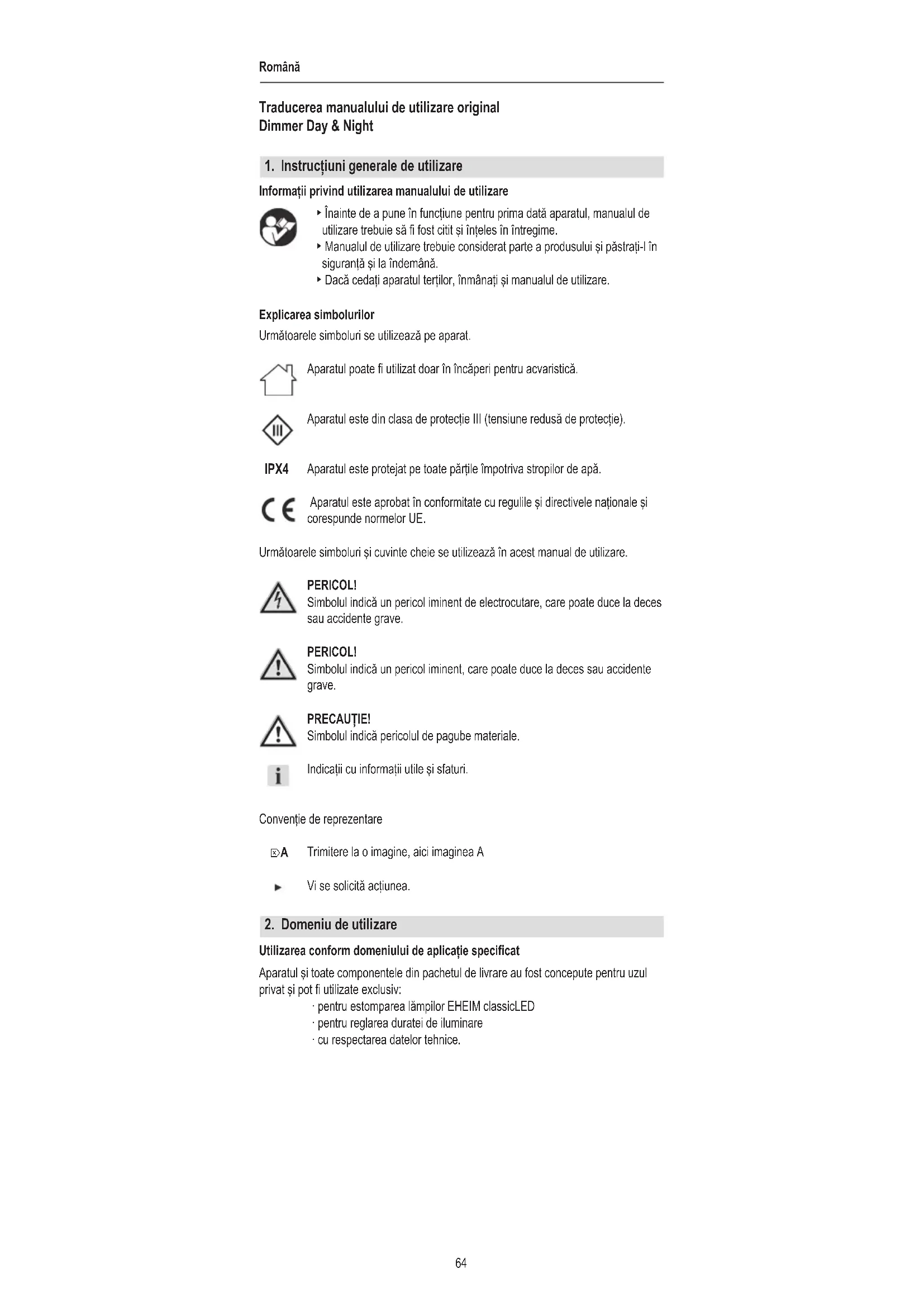 Utilizarea conform domeniului de aplicaţie specicat Aparatul şi toate componentele din pachetul de livrare au fost concepute pentru uzul privat şi pot utilizate exclusiv: ‧ pentru estomparea lămpilor EHEIM classicLED ‧ pentru reglarea duratei de iluminare ‧ cu respectarea datelor tehnice. IPX4 ⌦ARomână