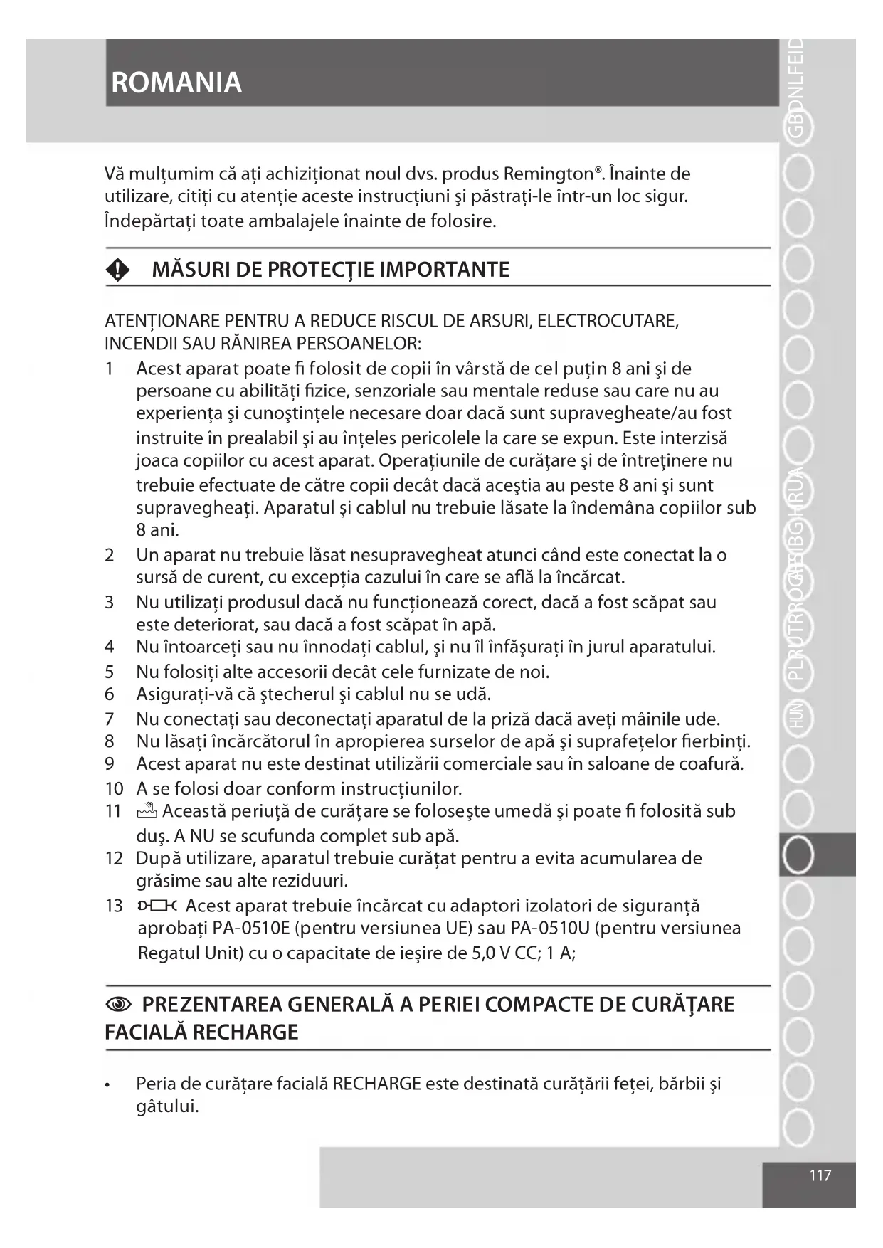 Elektrikli ve elektronik ürünlerdeki tehlikeli maddeler nedeniyle çevre ve sağlık sorunları oluşmasını önlemek için, bu simgeyle işaretlenmiş cihazlar olağan çöplerle birlikte atılmamalı ve geri kazanılmalı, yeniden kullanıma sokulmalı veya geri dönüştürülmelidir.117 ROMANIA GBDNLFEIDKSFINPSKCZ HUN PLRUTRROGRSIBG HRUAAE Vă mulţumim că aţi achiziţionat noul dvs. produs Remington®. Înainte de utilizare, citiţi cu atenţie aceste instrucţiuni şi păstraţi-le într-un loc sigur. Îndepărtaţi toate ambalajele înainte de folosire. F MĂSURI DE PROTECŢIE IMPORTANTE ATENȚIONARE PENTRU A REDUCE RISCUL DE ARSURI, ELECTROCUTARE, INCENDII SAU RĂNIREA PERSOANELOR: 1 Acest aparat poate fi folosit de copii în vârstă de cel puţin 8 ani şi de persoane cu abilităţi fizice, senzoriale sau mentale reduse sau care nu au experienţa şi cunoştinţele necesare doar dacă sunt supravegheate/au fost instruite în prealabil şi au înţeles pericolele la care se expun. Este interzisă joaca copiilor cu acest aparat. Operaţiunile de curăţare şi de întreţinere nu trebuie efectuate de către copii decât dacă aceştia au peste 8 ani şi sunt supravegheaţi. Aparatul şi cablul nu trebuie lăsate la îndemâna copiilor sub 8 ani. 2 Un aparat nu trebuie lăsat nesupravegheat atunci când este conectat la o sursă de curent, cu excepţia cazului în care se află la încărcat. 3 Nu utilizaţi produsul dacă nu funcţionează corect, dacă a fost scăpat sau este deteriorat, sau dacă a fost scăpat în apă. 4 Nu întoarceţi sau nu înnodaţi cablul, şi nu îl înfăşuraţi în jurul aparatului. 5 Nu folosiţi alte accesorii decât cele furnizate de noi. 6 Asiguraţi-vă că ştecherul şi cablul nu se udă. 7 Nu conectaţi sau deconectaţi aparatul de la priză dacă aveţi mâinile ude. 8 Nu lăsaţi încărcătorul în apropierea surselor de apă şi suprafeţelor fierbinţi. 9 Acest aparat nu este destinat utilizării comerciale sau în saloane de coafură. 10 A se folosi doar conform instrucţiunilor. 11 E Această periuţă de curăţare se foloseşte umedă şi poate fi folosită sub duş. A NU se scufunda complet sub apă. 12 După utilizare, aparatul trebuie curăţat pentru a evita acumularea de grăsime sau alte reziduuri.