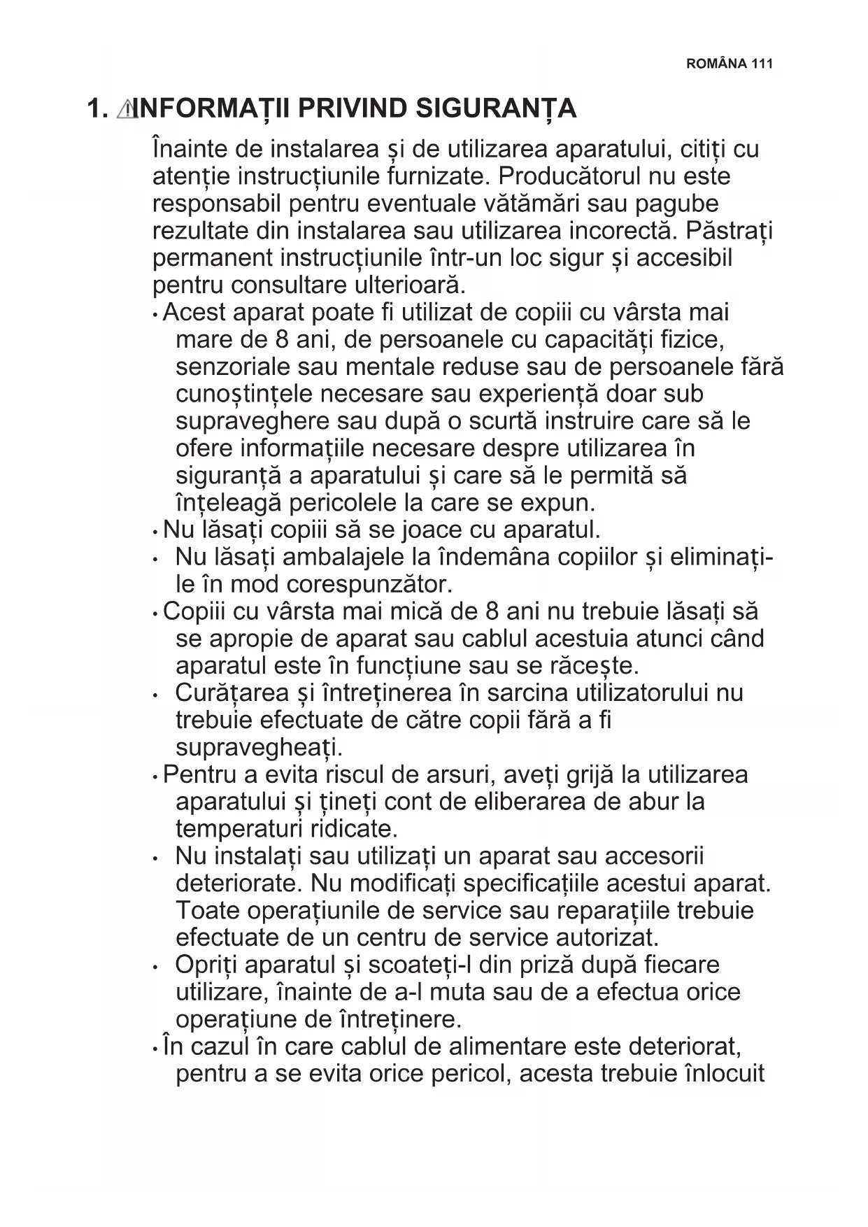 - În cazul în care cablul de alimentare este deteriorat, pentru a se evita orice pericol, acesta trebuie înlocuit ROMÂNA 111de producător, reprezentantul de service sau de persoane cu o calificare similară.