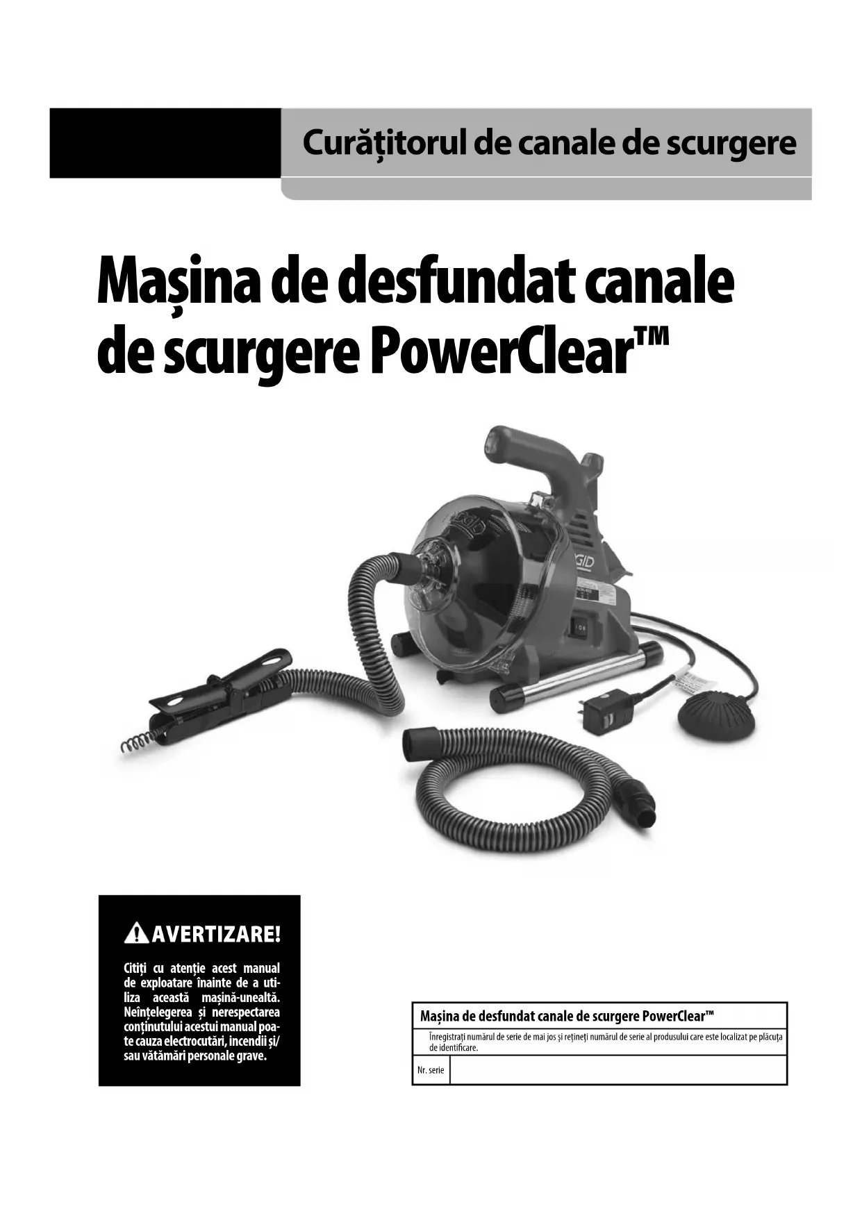 Čistička odtokov PowerClear™Mașina de desfundat canale de scurgere PowerClear™ Curățitorul de canale de scurgere Mașina de desfundat canale de scurgere PowerClear™ Înregistrați numărul de serie de mai jos și rețineți numărul de serie al produsului care este localizat pe plăcuța de identicare.Nr. serie AVERTIZARE! Citiți cu atenție acest manual de exploatare înainte de a uti- liza această mașină-unealtă. Neînțelegerea și nerespectarea conținutului acestui manual poa- te cauza electrocutări, incendii și/ sau vătămări personale grave.999-995-082.09_REV D Cuprins Formular de înregistrare pentru numărul de serie al mașinii 233 Declarație de conformitate CE Interior copertă spate Garanție pe viață Coperta din spate *Traducerea instrucțiunilor originale Simboluri de siguranță