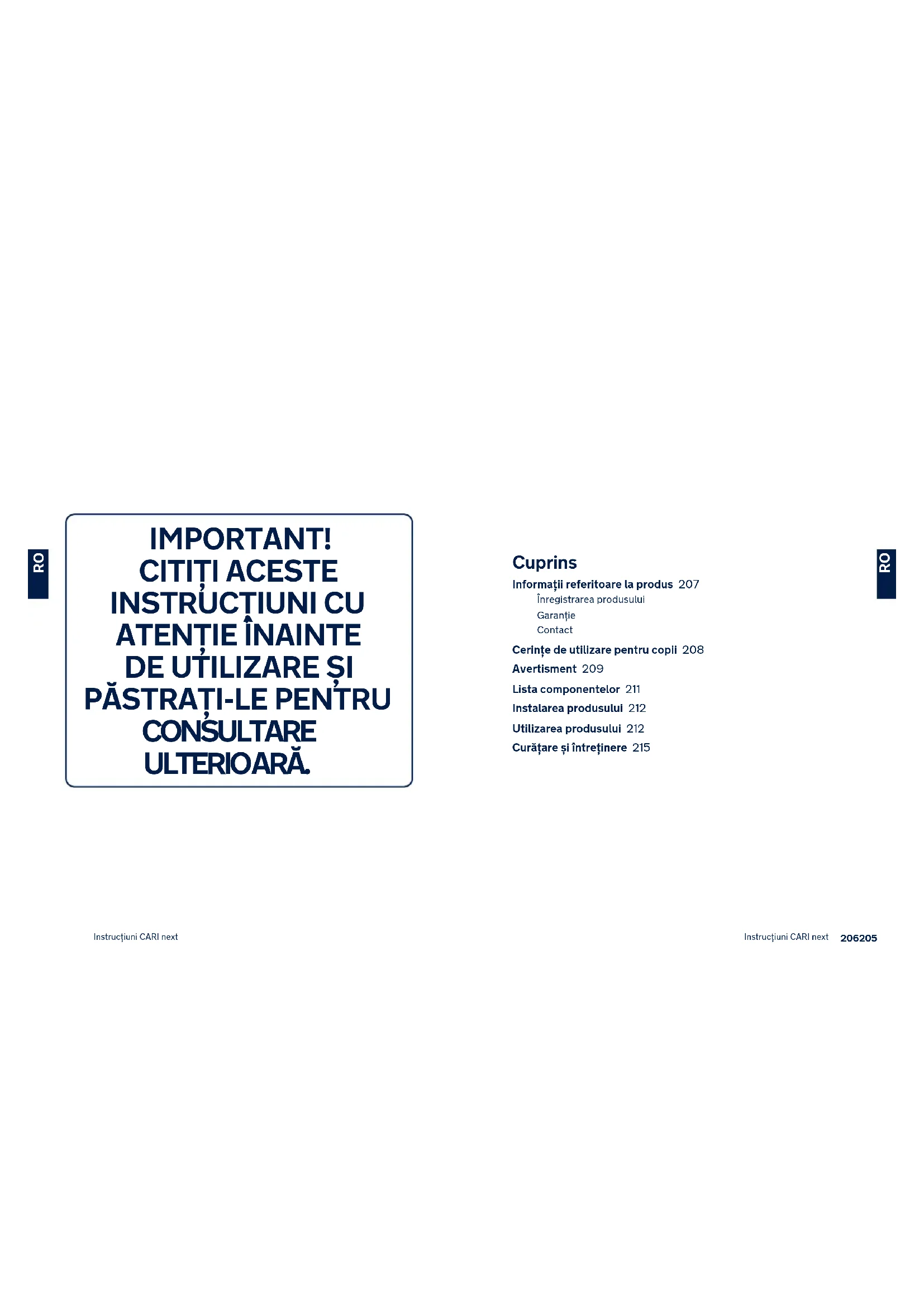 Cuprins Informații referitoare la produs 207 Înregistrarea produsului Garanție Contact Cerințe de utilizare pentru copii 208 Avertisment 209 Lista componentelor 211 Instalarea produsului 212 Utilizarea produsului 212 Curățare și întreținere 215 IMPORTANT﹗