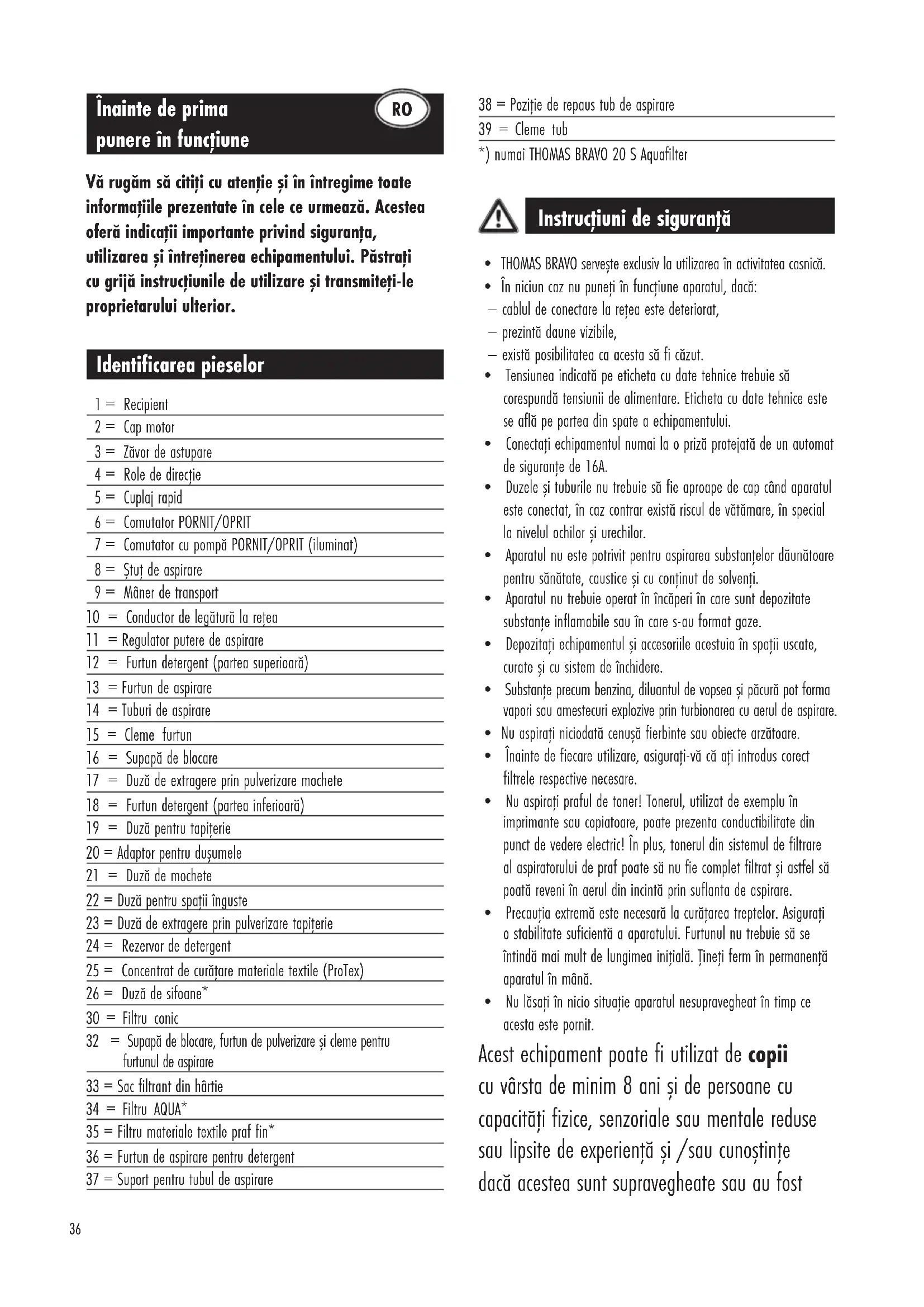 Utilizaţi filtrul conic (30) suplimentar de la sacul de filtru din hârtie. Astfel, obţineţi cea mai bună capacitate de reţinere a prafului. Așezaţi filtrul conic (30) pe partea inferioară a capului motorului (2). În funcţie de model, blocaţi poz. 1 sau 2, cu clemele rotative. În cazul unei murdăriri puternice sau unei puteri de aspirare reduse, filtrul conic (30) poate fi spălat cu apă limpede, fără detergenţi și agenţi de curăţare. Asiguraţi-vă că filtrul este complet uscat la următoarea utilizare.38 D Apăsaţi ferm sacul filtrant pe ștuţul de aspirare și atașaţi-l pe peretele recipientului. G Împingeţi furtunul de aspirare pentru detergent la partea inferioară a capului motorului. H Așezaţi capul motorului și închideţi zăvorul de astupare. J Racordaţi furtunul de aspirare. Pentru detașare, rotiţi racordul de aspirare în lateral și extrageţi-l. Montaţi accesoriul dorit. Introduceţi ștecherul în priză. N Porniţi aparatul cu comutatorul PORNIT/OPRIT (6). Recipientul cu pompă (7) nu trebuie să se aprindă. Forţa de aspirare se modifică cu regulatorul puterii de aspirare (11 fig. P). – Clapeta pentru aer secundar închisă = forţă maximă de aspirare – Clapeta pentru aer secundar deschisă = forţă redusă de aspirare THOMAS BRAVO 20S Aquafilter Nu utilizaţi niciodată aparatul dumneavoastră AQUAFILTER în regimul de aspirare uscată fără filtrul Aqua, filtrul de praf fin și umplerea corespunzătoare cu apă. Nu aspiraţi cantităţi mari de praf fin, de ex. făină, pudră de cacao, ciment etc. K Extrageţi rezervorul de detergent. E Asamblaţi printr-un cuplaj tip fișă filtrul AQUA din 2 părţi până la opritor și împingeţi ferm pe ștuţul de aspirare. Acordaţi atenţie marcajelor. Filtrul AQUA trebuie să se fixeze în poziţie pe fundul butoiului de aspirare și să fie așezat uniform pe sol. Umpleţi 2 litri de apă limpede în recipientul de aspirare. F Atașaţi filtrul pentru materiale textile praf fin prin întoarcerea marginii de sus în recipientul de aspirare. G Împingeţi furtunul de aspirare pentru detergent la partea inferioară a capului motorului. C Utilizaţi filtrul conic (30) suplimentar de la sacul de filtru din hârtie. Astfel, obţineţi cea mai bună capacitate de reţinere a prafului. Așezaţi filtrul conic (30) pe partea inferioară a capului motorului (2). În funcţie de model, blocaţi poz. 1 sau 2, cu clemele rotative. În cazul unei murdăriri puternice sau unei puteri de aspirare reduse, filtrul conic (30) poate fi spălat cu apă limpede, fără detergenţi și agenţi de curăţare. Asiguraţi-vă că filtrul este complet uscat la următoarea utilizare. H Așezaţi capul motorului și închideţi zăvorul de astupare. J Racordaţi furtunul de aspirare. Pentru detașare, rotiţi racordul de aspirare în lateral și extrageţi-l. Montaţi accesoriul dorit. Introduceţi ștecherul în priză. N Porniţi aparatul cu comutatorul PORNIT/OPRIT (6). Recipientul cu pompă (7) nu trebuie să se aprindă. Forţa de aspirare se modifică cu regulatorul puterii de aspirare (11 fig. P). – Clapeta pentru aer secundar închisă = forţă maximă de aspirare – Clapeta pentru aer secundar deschisă = forţă redusă de aspirare Curăţarea și îngrijirea sistemului de filtrare AQUA Din motive de igienă, sistemul AQUAFILTER și recipientul de aspirare trebuie golite, curăţate și uscate după fiecare utilizare. Apa murdară și piesele umede favorizează înmulţirea bacteriilor și a ciupercilor. În funcţie de murdărie, ștergeţi filtrul pentru materiale textile de praf fin cu o cârpă uscată sau umedă. În caz de murdărire puternică, spălaţi cu apă limpede fără detergenţi de curăţare. Asiguraţi-vă că filtrul este complet uscat la următoarea utilizare.39 Aspirare umedă Păstraţi supapa cu plutitor (40 fig. S) în permanenţă curată și accesibilă. Acesta întrerupe automat procesul de aspirare dacă recipientul de aspirare este plin. La aspirarea din recipiente ale căror nivel de lichid este mai mare decât marginea superioară a recipientului de aspirare