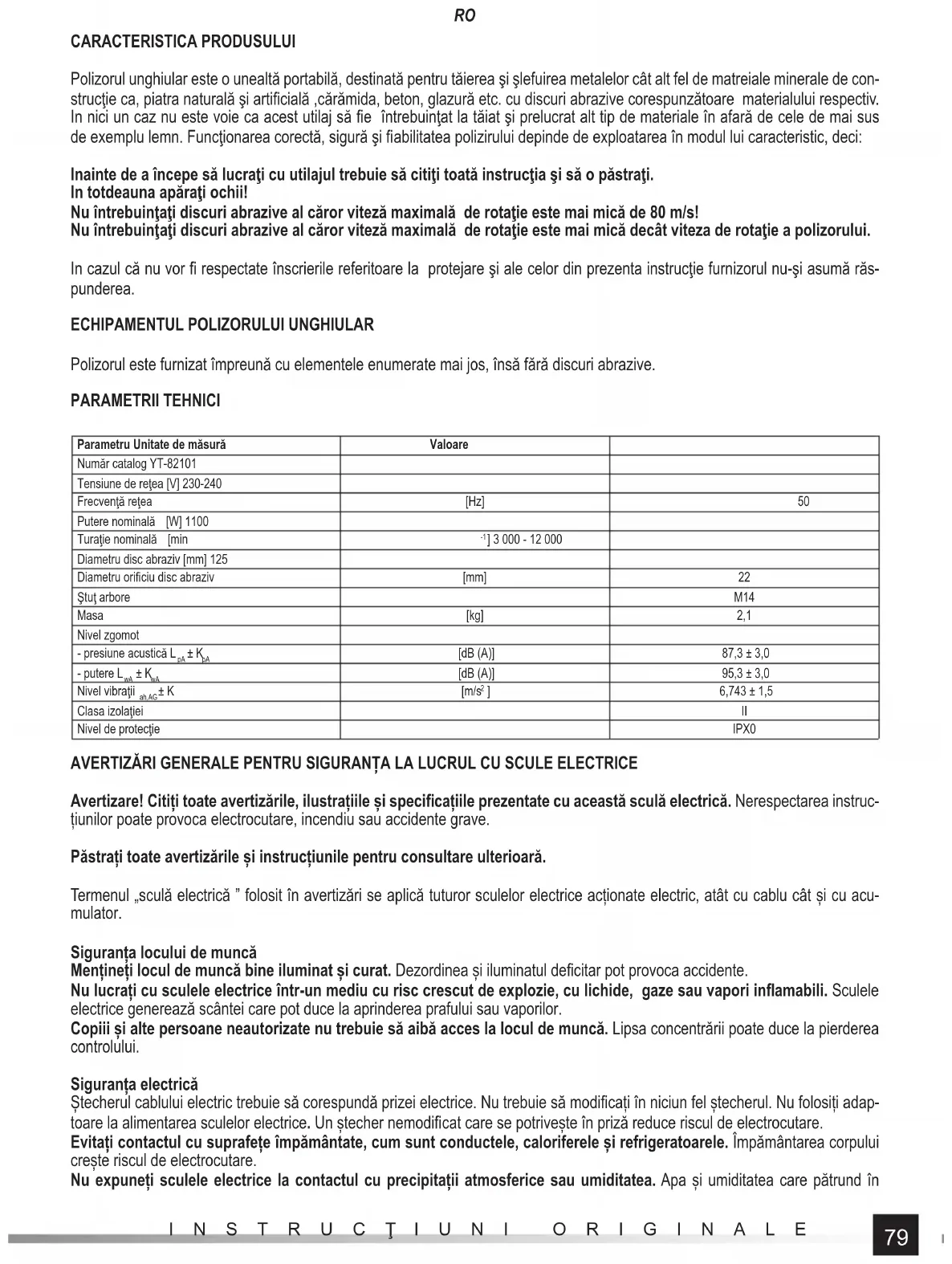 ] 6,743 ± 1,5 Clasa izolaţiei II Nivel de protecţie IPX0 AVERTIZĂRI GENERALE PENTRU SIGURANȚA LA LUCRUL CU SCULE ELECTRICE Avertizare! Citiți toate avertizările, ilustrațiile și specifi cațiile prezentate cu această sculă electrică. Nerespectarea instruc- țiunilor poate provoca electrocutare, incendiu sau accidente grave. Păstrați toate avertizările și instrucțiunile pentru consultare ulterioară. Termenul „sculă electrică ” folosit în avertizări se aplică tuturor sculelor electrice acționate electric, atât cu cablu cât și cu acu- mulator. Siguranța locului de muncă Mențineți locul de muncă bine iluminat și curat. Dezordinea și iluminatul defi citar pot provoca accidente. Nu lucrați cu sculele electrice într-un mediu cu risc crescut de explozie, cu lichide, gaze sau vapori infl amabili. Sculele electrice generează scântei care pot duce la aprinderea prafului sau vaporilor. Copiii și alte persoane neautorizate nu trebuie să aibă acces la locul de muncă. Lipsa concentrării poate duce la pierderea controlului. Siguranța electrică Ștecherul cablului electric trebuie să corespundă prizei electrice. Nu trebuie să modifi cați în niciun fel ștecherul. Nu folosiți adap- toare la alimentarea sculelor electrice. Un ștecher nemodifi cat care se potrivește în priză reduce riscul de electrocutare. Evitați contactul cu suprafețe împământate, cum sunt conductele, caloriferele și refrigeratoarele. Împământarea corpului crește riscul de electrocutare. Nu expuneți sculele electrice la contactul cu precipitații atmosferice sau umiditatea. Apa și umiditatea care pătrund în80