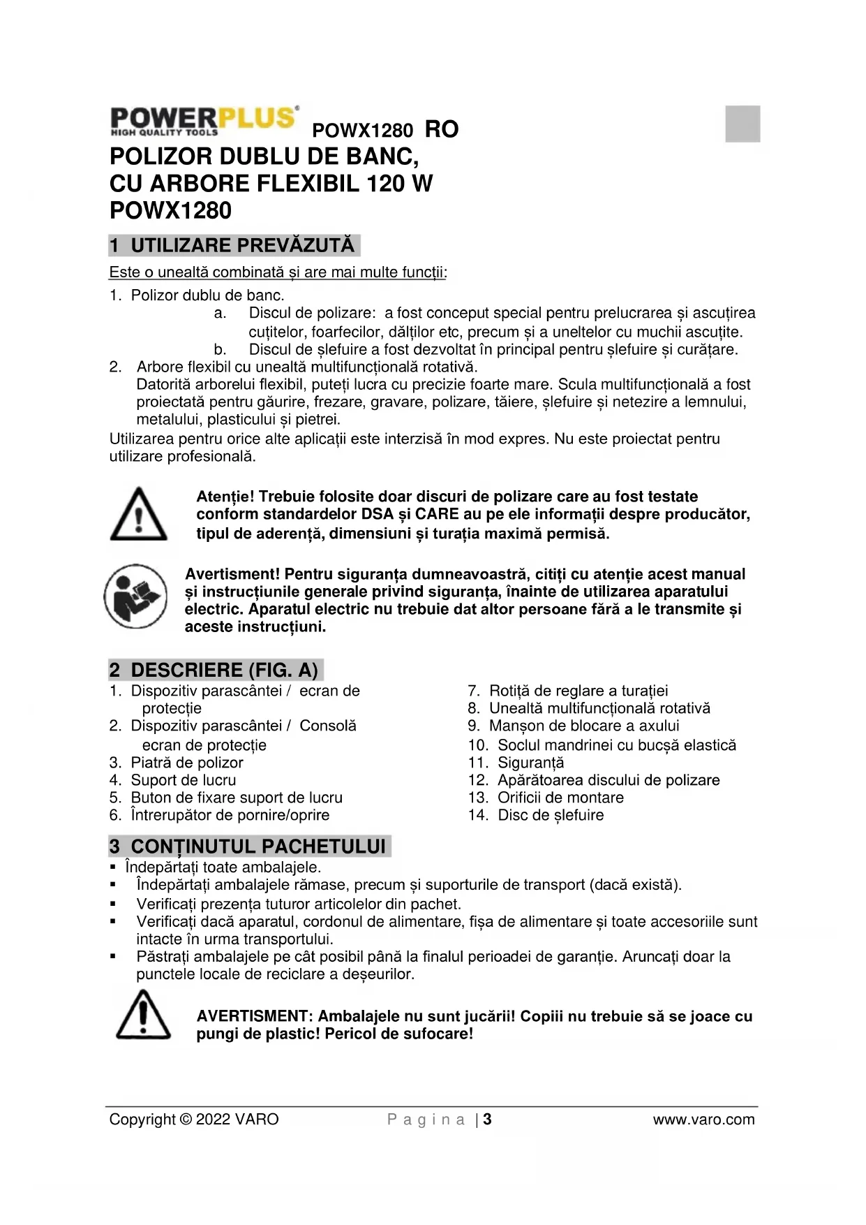 - Păstrați ambalajele pe cât posibil până la finalul perioadei de garanție. Aruncați doar la punctele locale de reciclare a deșeurilor. AVERTISMENT: Ambalajele nu sunt jucării! Copiii nu trebuie să se joace cu pungi de plastic! Pericol de sufocare!POWX1280 RO Copyright © 2022 VARO P a g i n a | 4 www.varo.com