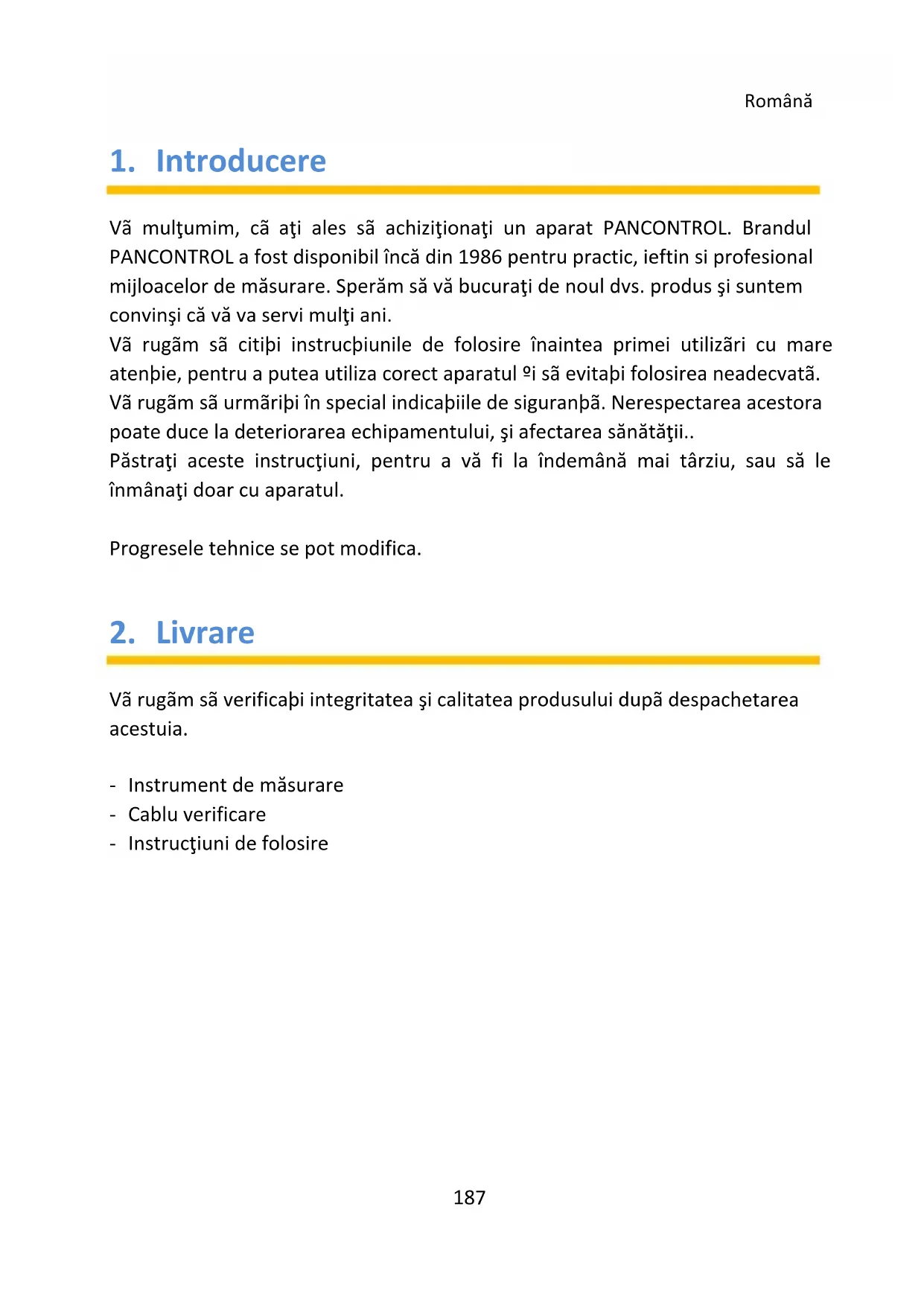 Vã mulţumim, cã aţi ales sã achiziţionaţi un aparat PANCONTROL. Brandul PANCONTROL a fost disponibil încă din 1986 pentru practic, ieftin si profesional mijloacelor de măsurare. Sperăm să vă bucuraţi de noul dvs. produs şi suntem convinşi că vă va servi mulţi ani. Vã rugãm sã citiþi instrucþiunile de folosire înaintea primei utilizãri cu mare atenþie, pentru a putea utiliza corect aparatul ºi sã evitaþi folosirea neadecvatã. Vã rugãm sã urmãriþi în special indicaþiile de siguranþã. Nerespectarea acestora poate duce la deteriorarea echipamentului, şi afectarea sănătăţii.. Păstraţi aceste instrucţiuni, pentru a vă fi la îndemână mai târziu, sau să le înmânaţi doar cu aparatul. Progresele tehnice se pot modifica.