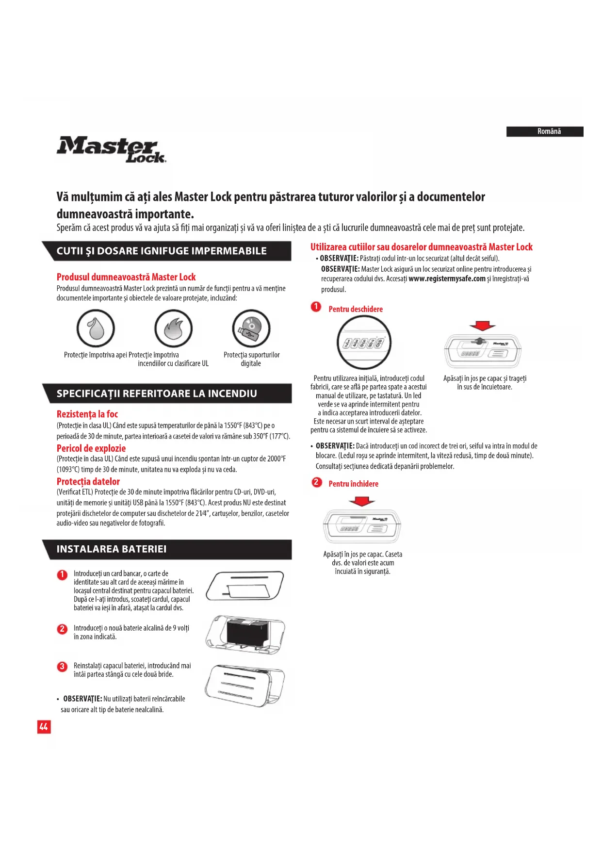 Vă multțumim că ați alees Master Lock pentru păstrarea tuturor valorilorși a documentelor dumneavoastră importante.