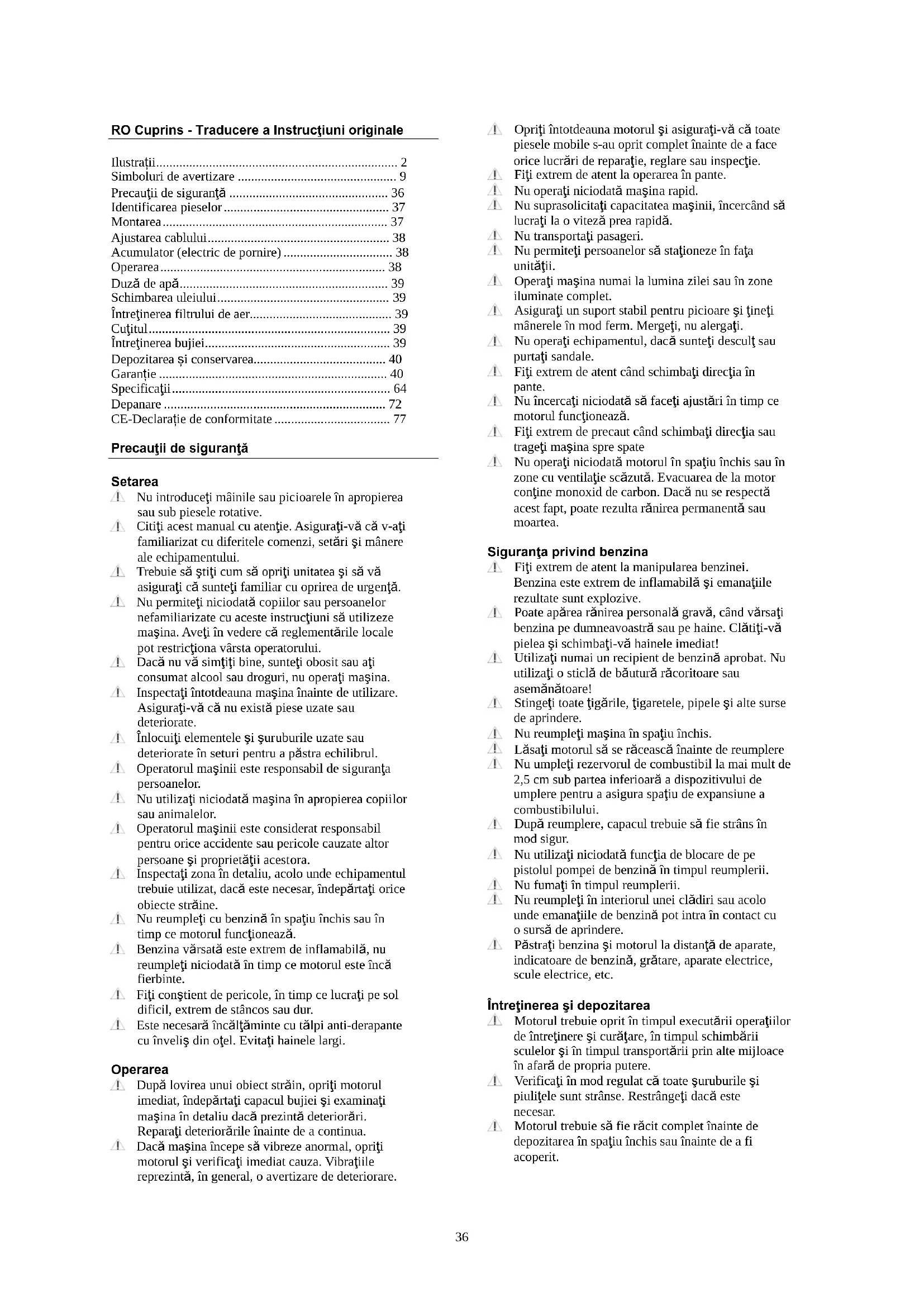 - CE-Declarație de conformitate Precauţii de siguranţă Setarea Nu introduceţi mâinile sau picioarele în apropierea sau sub piesele rotative. Citiţi acest manual cu atenţie. Asiguraţi-vă că v-aţi familiarizat cu diferitele comenzi, setări şi mânere ale echipamentului. Trebuie să ştiţi cum să opriţi unitatea şi să vă asiguraţi că sunteţi familiar cu oprirea de urgenţă. Nu permiteţi niciodată copiilor sau persoanelor nefamiliarizate cu aceste instrucţiuni să utilizeze maşina. Aveţi în vedere că reglementările locale pot restricţiona vârsta operatorului. Dacă nu vă simţiţi bine, sunteţi obosit sau aţi consumat alcool sau droguri, nu operaţi maşina. Inspectaţi întotdeauna maşina înainte de utilizare. Asiguraţi-vă că nu există piese uzate sau deteriorate. Înlocuiţi elementele şi şuruburile uzate sau deteriorate în seturi pentru a păstra echilibrul. Operatorul maşinii este responsabil de siguranţa persoanelor. Nu utilizaţi niciodată maşina în apropierea copiilor sau animalelor. Operatorul maşinii este considerat responsabil pentru orice accidente sau pericole cauzate altor persoane şi proprietăţii acestora. Inspectaţi zona în detaliu, acolo unde echipamentul trebuie utilizat, dacă este necesar, îndepărtaţi orice obiecte străine. Nu reumpleţi cu benzină în spaţiu închis sau în timp ce motorul funcţionează. Benzina vărsată este extrem de inflamabilă, nu reumpleţi niciodată în timp ce motorul este încă fierbinte. Fiţi conştient de pericole, în timp ce lucraţi pe sol dificil, extrem de stâncos sau dur. Este necesară încălţăminte cu tălpi anti-derapante cu înveliş din oţel. Evitaţi hainele largi. Operarea După lovirea unui obiect străin, opriţi motorul imediat, îndepărtaţi capacul bujiei şi examinaţi maşina în detaliu dacă prezintă deteriorări. Reparaţi deteriorările înainte de a continua. Dacă maşina începe să vibreze anormal, opriţi motorul şi verificaţi imediat cauza. Vibraţiile reprezintă, în general, o avertizare de deteriorare. Opriţi întotdeauna motorul şi asiguraţi-vă că toate piesele mobile s-au oprit complet înainte de a face orice lucrări de reparaţie, reglare sau inspecţie. Fiţi extrem de atent la operarea în pante. Nu operaţi niciodată maşina rapid. Nu suprasolicitaţi capacitatea maşinii, încercând să lucraţi la o viteză prea rapidă. Nu transportaţi pasageri. Nu permiteţi persoanelor să staţioneze în faţa unităţii. Operaţi maşina numai la lumina zilei sau în zone iluminate complet. Asiguraţi un suport stabil pentru picioare şi ţineţi mânerele în mod ferm. Mergeţi, nu alergaţi. Nu operaţi echipamentul, dacă sunteţi desculţ sau purtaţi sandale. Fiţi extrem de atent când schimbaţi direcţia în pante. Nu încercaţi niciodată să faceţi ajustări în timp ce motorul funcţionează. Fiţi extrem de precaut când schimbaţi direcţia sau trageţi maşina spre spate Nu operaţi niciodată motorul în spaţiu închis sau în zone cu ventilaţie scăzută. Evacuarea de la motor conţine monoxid de carbon. Dacă nu se respectă acest fapt, poate rezulta rănirea permanentă sau moartea. Siguranţa privind benzina Fiţi extrem de atent la manipularea benzinei. Benzina este extrem de inflamabilă şi emanaţiile rezultate sunt explozive. Poate apărea rănirea personală gravă, când vărsaţi benzina pe dumneavoastră sau pe haine. Clătiţi-vă pielea şi schimbaţi-vă hainele imediat! Utilizaţi numai un recipient de benzină aprobat. Nu utilizaţi o sticlă de băutură răcoritoare sau asemănătoare! Stingeţi toate ţigările, ţigaretele, pipele şi alte surse de aprindere. Nu reumpleţi maşina în spaţiu închis. Lăsaţi motorul să se răcească înainte de reumplere Nu umpleţi rezervorul de combustibil la mai mult de 2,5 cm sub partea inferioară a dispozitivului de umplere pentru a asigura spaţiu de expansiune a combustibilului. După reumplere, capacul trebuie să fie strâns în mod sigur. Nu utilizaţi niciodată funcţia de blocare de pe pistolul pompei de benzină în timpul reumplerii. Nu fumaţi în timpul reumplerii. Nu reumpleţi în interiorul unei clădiri sau acolo unde emanaţiile de benzină pot intra în contact cu o sursă de aprindere. Păstraţi benzina şi motorul la distanţă de aparate, indicatoare de benzină, grătare, aparate electrice, scule electrice, etc. Întreţinerea şi depozitarea Motorul trebuie oprit în timpul executării operaţiilor de întreţinere şi curăţare, în timpul schimbării sculelor şi în timpul transportării prin alte mijloace în afară de propria putere. Verificaţi în mod regulat că toate şuruburile şi piuliţele sunt strânse. Restrângeţi dacă este necesar. Motorul trebuie să fie răcit complet înainte de depozitarea în spaţiu închis sau înainte de a fi acoperit.37 Dacă maşina este neutilizată o anumită perioadă de timp, vă rugăm să consultaţi instrucţiunile din acest manual. Întreţineţi sau înlocuiţi etichetele de siguranţă şi cu instrucţiuni, dacă este necesar. Utilizaţi numai piese de schimb şi accesorii originale. Dacă nu se utilizează piese sau accesorii originale, răspunderea nu se mai aplică. Diverse Motorul nu este pre-umplut cu ulei. Dispozitivele de control montate din fabrică, precum cablul de ambreiaj montat pe mâner, nu trebuie îndepărtat sau expus. Goliţi rezervorul de combustibil numai în aer liber. Benzina este extrem de inflamabilă şi emanaţiile rezultate sunt explozive. Asiguraţi-vă că maşina este asigurată corect când este transportată pe o platformă etc. Produsele electrice uzate nu trebuie aruncate la gunoiul menajer. Acest dispozitiv trebuie predat la un centru de reciclare pentru procesarea sigură. Maşina de tuns iarba a fost fabricată conform celor mai recente cerinţe de siguranţă. Acestea includ o frână a cuţitului care opreşte motorul şi cuţit