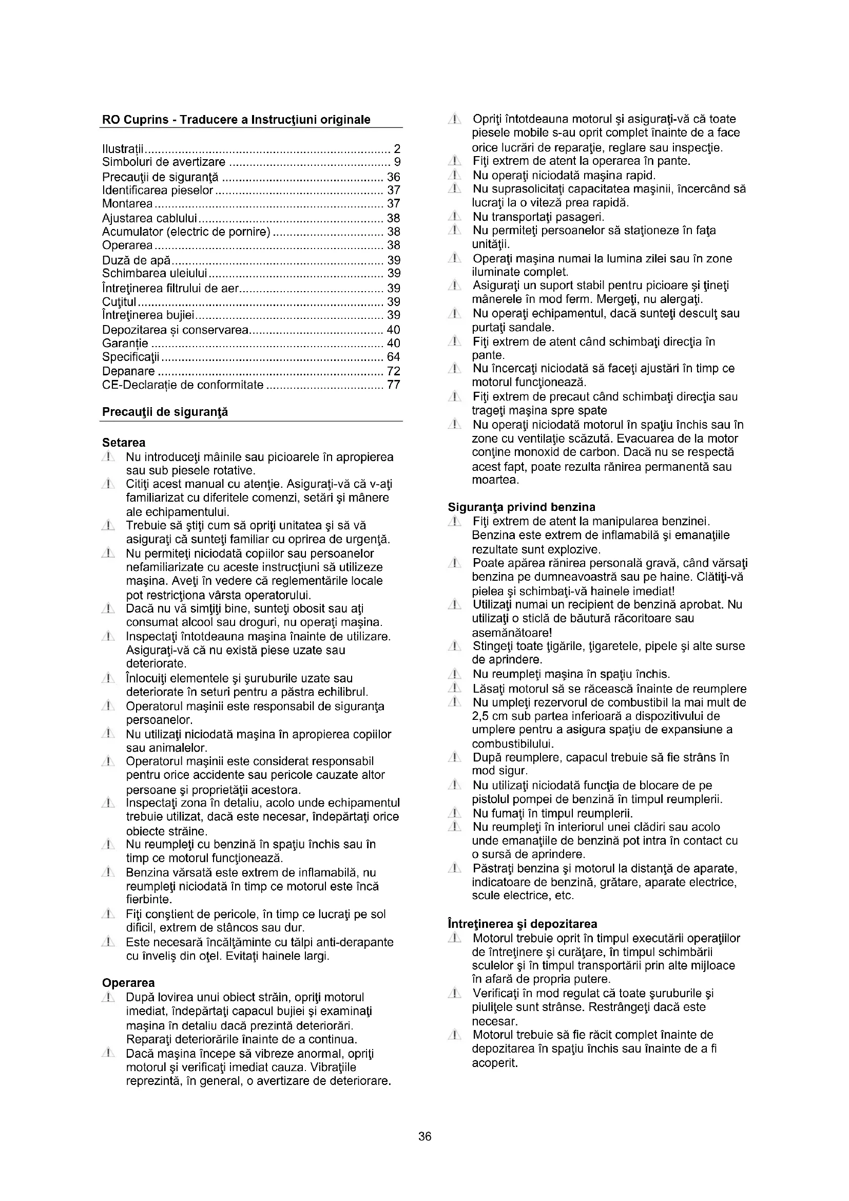 - CE-Declarație de conformitate Precauţii de siguranţă Setarea Nu introduceţi mâinile sau picioarele în apropierea sau sub piesele rotative. Citiţi acest manual cu atenţie. Asiguraţi-vă că v-aţi familiarizat cu diferitele comenzi, setări şi mânere ale echipamentului. Trebuie să ştiţi cum să opriţi unitatea şi să vă asiguraţi că sunteţi familiar cu oprirea de urgenţă. Nu permiteţi niciodată copiilor sau persoanelor nefamiliarizate cu aceste instrucţiuni să utilizeze maşina. Aveţi în vedere că reglementările locale pot restricţiona vârsta operatorului. Dacă nu vă simţiţi bine, sunteţi obosit sau aţi consumat alcool sau droguri, nu operaţi maşina. Inspectaţi întotdeauna maşina înainte de utilizare. Asiguraţi-vă că nu există piese uzate sau deteriorate. Înlocuiţi elementele şi şuruburile uzate sau deteriorate în seturi pentru a păstra echilibrul. Operatorul maşinii este responsabil de siguranţa persoanelor. Nu utilizaţi niciodată maşina în apropierea copiilor sau animalelor. Operatorul maşinii este considerat responsabil pentru orice accidente sau pericole cauzate altor persoane şi proprietăţii acestora. Inspectaţi zona în detaliu, acolo unde echipamentul trebuie utilizat, dacă este necesar, îndepărtaţi orice obiecte străine. Nu reumpleţi cu benzină în spaţiu închis sau în timp ce motorul funcţionează. Benzina vărsată este extrem de inflamabilă, nu reumpleţi niciodată în timp ce motorul este încă fierbinte. Fiţi conştient de pericole, în timp ce lucraţi pe sol dificil, extrem de stâncos sau dur. Este necesară încălţăminte cu tălpi anti-derapante cu înveliş din oţel. Evitaţi hainele largi. Operarea După lovirea unui obiect străin, opriţi motorul imediat, îndepărtaţi capacul bujiei şi examinaţi maşina în detaliu dacă prezintă deteriorări. Reparaţi deteriorările înainte de a continua. Dacă maşina începe să vibreze anormal, opriţi motorul şi verificaţi imediat cauza. Vibraţiile reprezintă, în general, o avertizare de deteriorare. Opriţi întotdeauna motorul şi asiguraţi-vă că toate piesele mobile s-au oprit complet înainte de a face orice lucrări de reparaţie, reglare sau inspecţie. Fiţi extrem de atent la operarea în pante. Nu operaţi niciodată maşina rapid. Nu suprasolicitaţi capacitatea maşinii, încercând să lucraţi la o viteză prea rapidă. Nu transportaţi pasageri. Nu permiteţi persoanelor să staţioneze în faţa unităţii. Operaţi maşina numai la lumina zilei sau în zone iluminate complet. Asiguraţi un suport stabil pentru picioare şi ţineţi mânerele în mod ferm. Mergeţi, nu alergaţi. Nu operaţi echipamentul, dacă sunteţi desculţ sau purtaţi sandale. Fiţi extrem de atent când schimbaţi direcţia în pante. Nu încercaţi niciodată să faceţi ajustări în timp ce motorul funcţionează. Fiţi extrem de precaut când schimbaţi direcţia sau trageţi maşina spre spate Nu operaţi niciodată motorul în spaţiu închis sau în zone cu ventilaţie scăzută. Evacuarea de la motor conţine monoxid de carbon. Dacă nu se respectă acest fapt, poate rezulta rănirea permanentă sau moartea. Siguranţa privind benzina Fiţi extrem de atent la manipularea benzinei. Benzina este extrem de inflamabilă şi emanaţiile rezultate sunt explozive. Poate apărea rănirea personală gravă, când vărsaţi benzina pe dumneavoastră sau pe haine. Clătiţi-vă pielea şi schimbaţi-vă hainele imediat! Utilizaţi numai un recipient de benzină aprobat. Nu utilizaţi o sticlă de băutură răcoritoare sau asemănătoare! Stingeţi toate ţigările, ţigaretele, pipele şi alte surse de aprindere. Nu reumpleţi maşina în spaţiu închis. Lăsaţi motorul să se răcească înainte de reumplere Nu umpleţi rezervorul de combustibil la mai mult de 2,5 cm sub partea inferioară a dispozitivului de umplere pentru a asigura spaţiu de expansiune a combustibilului. După reumplere, capacul trebuie să fie strâns în mod sigur. Nu utilizaţi niciodată funcţia de blocare de pe pistolul pompei de benzină în timpul reumplerii. Nu fumaţi în timpul reumplerii. Nu reumpleţi în interiorul unei clădiri sau acolo unde emanaţiile de benzină pot intra în contact cu o sursă de aprindere. Păstraţi benzina şi motorul la distanţă de aparate, indicatoare de benzină, grătare, aparate electrice, scule electrice, etc. Întreţinerea şi depozitarea Motorul trebuie oprit în timpul executării operaţiilor de întreţinere şi curăţare, în timpul schimbării sculelor şi în timpul transportării prin alte mijloace în afară de propria putere. Verificaţi în mod regulat că toate şuruburile şi piuliţele sunt strânse. Restrângeţi dacă este necesar. Motorul trebuie să fie răcit complet înainte de depozitarea în spaţiu închis sau înainte de a fi acoperit.37 Dacă maşina este neutilizată o anumită perioadă de timp, vă rugăm să consultaţi instrucţiunile din acest manual. Întreţineţi sau înlocuiţi etichetele de siguranţă şi cu instrucţiuni, dacă este necesar. Utilizaţi numai piese de schimb şi accesorii originale. Dacă nu se utilizează piese sau accesorii originale, răspunderea nu se mai aplică. Diverse Motorul nu este pre-umplut cu ulei. Dispozitivele de control montate din fabrică, precum cablul de ambreiaj montat pe mâner, nu trebuie îndepărtat sau expus. Goliţi rezervorul de combustibil numai în aer liber. Benzina este extrem de inflamabilă şi emanaţiile rezultate sunt explozive. Asiguraţi-vă că maşina este asigurată corect când este transportată pe o platformă etc. Produsele electrice uzate nu trebuie aruncate la gunoiul menajer. Acest dispozitiv trebuie predat la un centru de reciclare pentru procesarea sigură. Maşina de tuns iarba a fost fabricată conform celor mai recente cerinţe de siguranţă. Acestea includ o frână a cuţitului care opreşte motorul şi cuţit