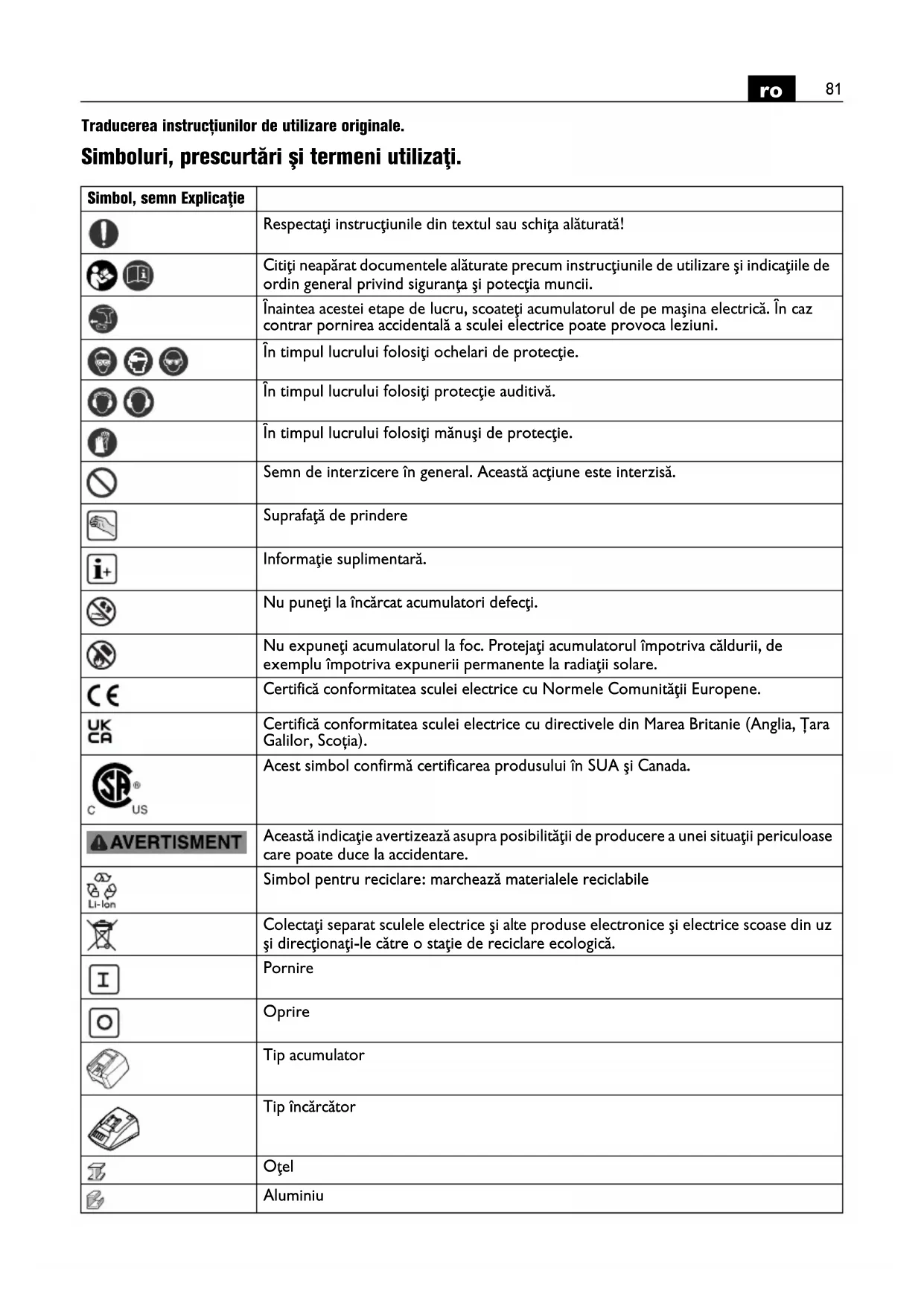 Traducerea instrucțiunilor de utilizare originale. Simboluri, prescurtări şi termeni utilizaţi. Simbol, semn Explicaţie Respectaţi instrucţiunile din textul sau schiţa alăturată! Citiţi neapărat documentele alăturate precum instrucţiunile de utilizare şi indicaţiile de ordin general privind siguranţa şi potecţia muncii. Înaintea acestei etape de lucru, scoateţi acumulatorul de pe maşina electrică. În caz contrar pornirea accidentală a sculei electrice poate provoca leziuni. În timpul lucrului folosiţi ochelari de protecţie. În timpul lucrului folosiţi protecţie auditivă. În timpul lucrului folosiţi mănuşi de protecţie. Semn de interzicere în general. Această acţiune este interzisă. Suprafaţă de prindere Informaţie suplimentară. Nu puneţi la încărcat acumulatori defecţi. Nu expuneţi acumulatorul la foc. Protejaţi acumulatorul împotriva căldurii, de exemplu împotriva expunerii permanente la radiaţii solare. Certifică conformitatea sculei electrice cu Normele Comunităţii Europene. Certifică conformitatea sculei electrice cu directivele din Marea Britanie (Anglia, Țara Galilor, Scoția). Acest simbol confirmă certificarea produsului în SUA şi Canada. Această indicaţie avertizează asupra posibilităţii de producere a unei situaţii periculoase care poate duce la accidentare. Simbol pentru reciclare: marchează materialele reciclabile Colectaţi separat sculele electrice şi alte produse electronice şi electrice scoase din uz şi direcţionaţi-le către o staţie de reciclare ecologică. Pornire Oprire Tip acumulator Tip încărcător Oţel Aluminiu82