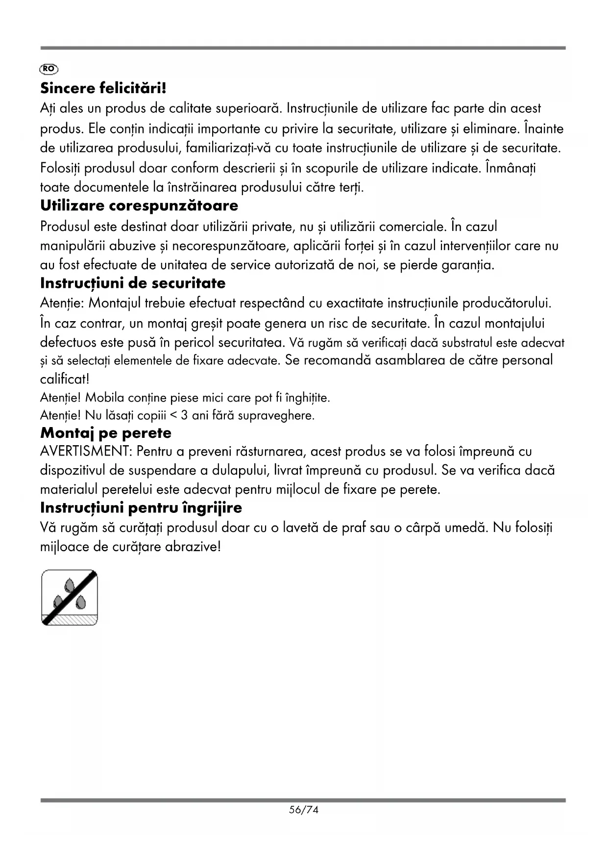 53/74LV Apsveicam! Jūs esat izvēlējies augstas kvalitātes produktu. Lietošanas instrukcija ir šī produkta sastāvdaļa. Tajā ir svarīga informācija par drošību, lietošanu un iznīcināšanu. Pirms produkta lietošanas iepazīstieties ar visiem lietošanas un drošības norādījumiem. Izmantojiet produktu tikai tā, kā aprakstīts, un norādītajām lietošanas jomām. Nododiet visus dokumentus līdzi ja produkts tiek nodots trešajām personām. Paredzētais lietojums Produkts ir paredzēts tikai privātām vajadzībām, nevis komerciālai lietošanai. Garantijas termiņš beidzas nepareizas un neatbilstošas apstrādes, nepareizas izmantošanas un iejaukšanās gadījumā, ko nav veikusi mūsu pilnvarotā servisa filiāle. Drošības norādījumi Uzmanību: Montāža jāveic precīzi saskaņā ar ražotāja norādījumiem - pretējā gadījumā nepareiza montāža var radīt drošības riskus. Nepareiza montāža rada risku drošībai. Lūdzu, pārbaudiet pamatnes piemērotību un izvēlieties piemērotus stiprinājumus. Montāžu iesaka kompetents personāls! Bīstami! Mēbeles satur mazas daļas, kuras var norīt. Bīstami! Neatstājiet bērnus, kas jaunāki par 3 gadiem, bez uzraudzības. Montāža pie sienas BRĪDINĀJUMS: Lai pasargātu to no apgāšanās, šis produkts jālieto kopā ar komplektā esošo skapīša pakaramo. Attiecībā uz stiprinājumiem, kas paredzēti piestiprināšanai pie sienas, jāpārbauda nesēja materiāla piemērotība. Apkopes instrukcija Lūdzu, tīriet tikai ar putekļu sūcēju vai mitru drānu. Nelietojiet abrazīvus tīrīšanas līdzekļus! 54/74LV Garantijas periods un likumā noteiktās prasības par defektiem. Garantija nepagarina garantijas periodu. Tas attiecas arī uz nomainītām un salabotām detaļām. Par visiem bojājumiem vai defektiem, kas jau ir iegādes brīdī, jāziņo tūlīt pēc izpakošanas. Remonts, kas veikts pēc garantijas perioda beigām, ir jāmaksā. Garantijas darbības joma Produkts tika rūpīgi ražots saskaņā ar stingrām kvalitātes vadlīnijām un pirms piegādes atbilstoši pārbaudīts. Garantija attiecas uz materiālu vai ražošanas defektiem. Šī garantija neattiecas uz produkta daļām, kuras normāli nolietojas, un tāpēc tās var uzskatīt par lietojamām vai par trauslu daļu bojājumiem, piemēram, slēdži vai daļas, kas izgatavotas no stikla. Šī garantija nav spēkā, ja produkts ir bojāts, nepareizi izmantots vai tiek apkopts. Pareizai produkta lietošanai ir stingri jāievēro visi lietošanas instrukcijā sniegtie norādījumi. Par katru cenu ir jāizvairās no lietošanas un darbībām, kuras ekspluatācijas instrukcijā nav ieteiktas vai par kurām nav brīdināts. Garantija Cienījamā kliente, cienījamais klient, jūs saņemat 3 gadu garantiju šim produktam sākot no pirkuma datuma. Šī produkta defektu gadījumā jums ir likumīgas tiesības pret produkta pārdevēju. Šīs likumīgās tiesības neierobežo mūsu garantija, kā norādīts zemāk. Garantijas nosacījumi Garantijas periods sākas pirkuma dienā. Lūdzu, glabājiet kvīti oriģinālu drošā vietā. Tas ir nepieciešams kā pirkuma apliecinājums. Stājas spēkā trīs gadu laikā no šī produkta, materiāla vai produkta iegādes dienas vai ja ir ražošanas defekti, mēs - pēc mūsu izvēles - jums bez maksas salabosim, nomainīsim vai pirkuma cena tiks atmaksāta. Šī garantija nosaka, ka produkts ar trūkumiem un pirkuma čeks (kvīts) tiek uzrādīti trīs gadu laikā un rakstiski īsi aprakstīti, no kā sastāv defekts un kad tas radies. Ja defektu sedz mūsu garantija, jūs saņemsit labotu vai jaunu produktu atpakaļ. Neviens jauns garantijas periods nesākas ar produkta remontu vai nomaiņu. Iznīcināšana Lūdzu, pēc lietošanas iznīciniet iepakojumu un produktu videi draudzīgā veidā. 55/74RO Sincere felicitări! Ați ales un produs de calitate superioară. Instrucțiunile de utilizare fac parte din acest produs. Ele conțin indicații importante cu privire la securitate, utilizare și eliminare. Înainte de utilizarea produsului, familiarizați-vă cu toate instrucțiunile de utilizare și de securitate. Folosiți produsul doar conform descrierii și în scopurile de utilizare indicate. Înmânați toate documentele la înstrăinarea produsului către terți. Utilizare corespunzătoare Produsul este destinat doar utilizării private, nu și utilizării comerciale. În cazul manipulării abuzive și necorespunzătoare, aplicării forței și în cazul intervențiilor care nu au fost efectuate de unitatea de service autorizată de noi, se pierde garanția. Instrucțiuni de securitate Atenţie: Montajul trebuie efectuat respectând cu exactitate instrucțiunile producătorului. În caz contrar, un montaj greșit poate genera un risc de securitate. În cazul montajului defectuos este pusă în pericol securitatea. Vă rugăm să verificați dacă substratul este adecvat și să selectați elementele de fixare adecvate. Se recomandă asamblarea de către personal calificat! Atenție! Mobila conține piese mici care pot fi înghițite. Atenție! Nu lăsați copiii < 3 ani fără supraveghere. Montaj pe perete AVERTISMENT: Pentru a preveni răsturnarea, acest produs se va folosi împreună cu dispozitivul de suspendare a dulapului, livrat împreună cu produsul. Se va verifica dacă materialul peretelui este adecvat pentru mijlocul de fixare pe perete. Instrucțiuni pentru îngrijire Vă rugăm să curățați produsul doar cu o lavetă de praf sau o cârpă umedă. Nu folosiți mijloace de curățare abrazive! 56/74RO Perioada de garanție și pretențiile legale de neconformitate Perioada de garanție nu se prelungește cu perioada de intervenție pe parcursul garanției. Această prevedere este valabilă și pentru piesele înlocuite respectiv reparate. Eventualele daune și defecțiuni prezente în momentul achiziționării trebuie notificate imediat după despachetare. Reparațiile nece