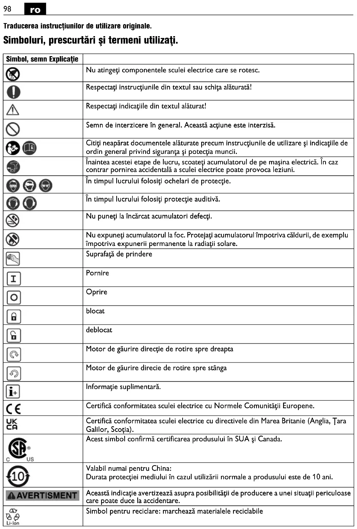 Traducerea instrucțiunilor de utilizare originale. Simboluri, prescurtări şi termeni utilizaţi. Simbol, semn Explicaţie Nu atingeţi componentele sculei electrice care se rotesc. Respectaţi instrucţiunile din textul sau schiţa alăturată! Respectaţi indicaţiile din textul alăturat! Semn de interzicere în general. Această acţiune este interzisă. Citiţi neapărat documentele alăturate precum instrucţiunile de utilizare şi indicaţiile de ordin general privind siguranţa şi potecţia muncii. Înaintea acestei etape de lucru, scoateţi acumulatorul de pe maşina electrică. În caz contrar pornirea accidentală a sculei electrice poate provoca leziuni. În timpul lucrului folosiţi ochelari de protecţie. În timpul lucrului folosiţi protecţie auditivă. Nu puneţi la încărcat acumulatori defecţi. Nu expuneţi acumulatorul la foc. Protejaţi acumulatorul împotriva căldurii, de exemplu împotriva expunerii permanente la radiaţii solare. Suprafaţă de prindere Pornire Oprire blocat deblocat Motor de găurire direcție de rotire spre dreapta Motor de găurire direcie de rotire spre stânga Informaţie suplimentară. Certifică conformitatea sculei electrice cu Normele Comunităţii Europene. Certifică conformitatea sculei electrice cu directivele din Marea Britanie (Anglia, Țara Galilor, Scoția). Acest simbol confirmă certificarea produsului în SUA şi Canada. Valabil numai pentru China: Durata protecției mediului în cazul utilizării normale a produsului este de 10 ani. Această indicaţie avertizează asupra posibilităţii de producere a unei situaţii periculoase care poate duce la accidentare. Simbol pentru reciclare: marchează materialele reciclabile99