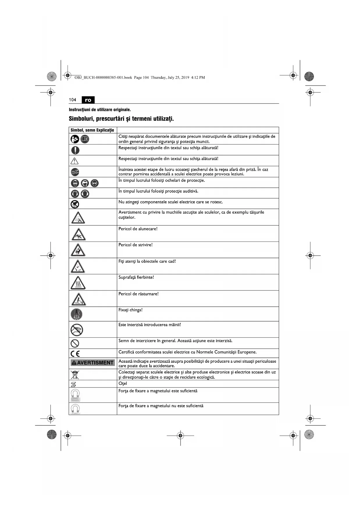 Instrucţiuni de utilizare originale. Simboluri, prescurtări şi termeni utilizaţi. Simbol, semn Explicaţie Citiţi neapărat documentele alăturate precum instrucţiunile de utilizare şi indicaţiile de ordin general privind siguranţa şi potecţia muncii. Respectaţi instrucţiunile din textul sau schiţa alăturată! Respectaţi instrucţiunile din textul sau schiţa alăturată! Înaintea acestei etape de lucru scoateţi ştecherul de la reţea afară din priză. În caz contrar pornirea accidentală a sculei electrice poate provoca leziuni. În timpul lucrului folosiţi ochelari de protecţie. În timpul lucrului folosiţi protecţie auditivă. Nu atingeţi componentele sculei electrice care se rotesc. Avertisment cu privire la muchiile ascuţite ale sculelor, ca de exemplu tăişurile cuţitelor. Pericol de alunecare! Pericol de strivire! Fiţi atenţi la obiectele care cad! Suprafaţă fierbinte! Pericol de răsturnare! Fixaţi chinga! Este interzisă introducerea mâinii! Semn de interzicere în general. Această acţiune este interzisă. Certifică conformitatea sculei electrice cu Normele Comunităţii Europene. Această indicaţie avertizează asupra posibilităţii de producere a unei situaţii periculoase care poate duce la accidentare. Colectaţi separat sculele electrice şi alte produse electronice şi electrice scoase din uz şi direcţionaţi-le către o staţie de reciclare ecologică. Oţel Forţa de fixare a magnetului este suficientă Forţa de fixare a magnetului nu este suficientă OBJ_BUCH-0000000385-001.book Page 104 Thursday, July 25, 2019 4:12 PM105