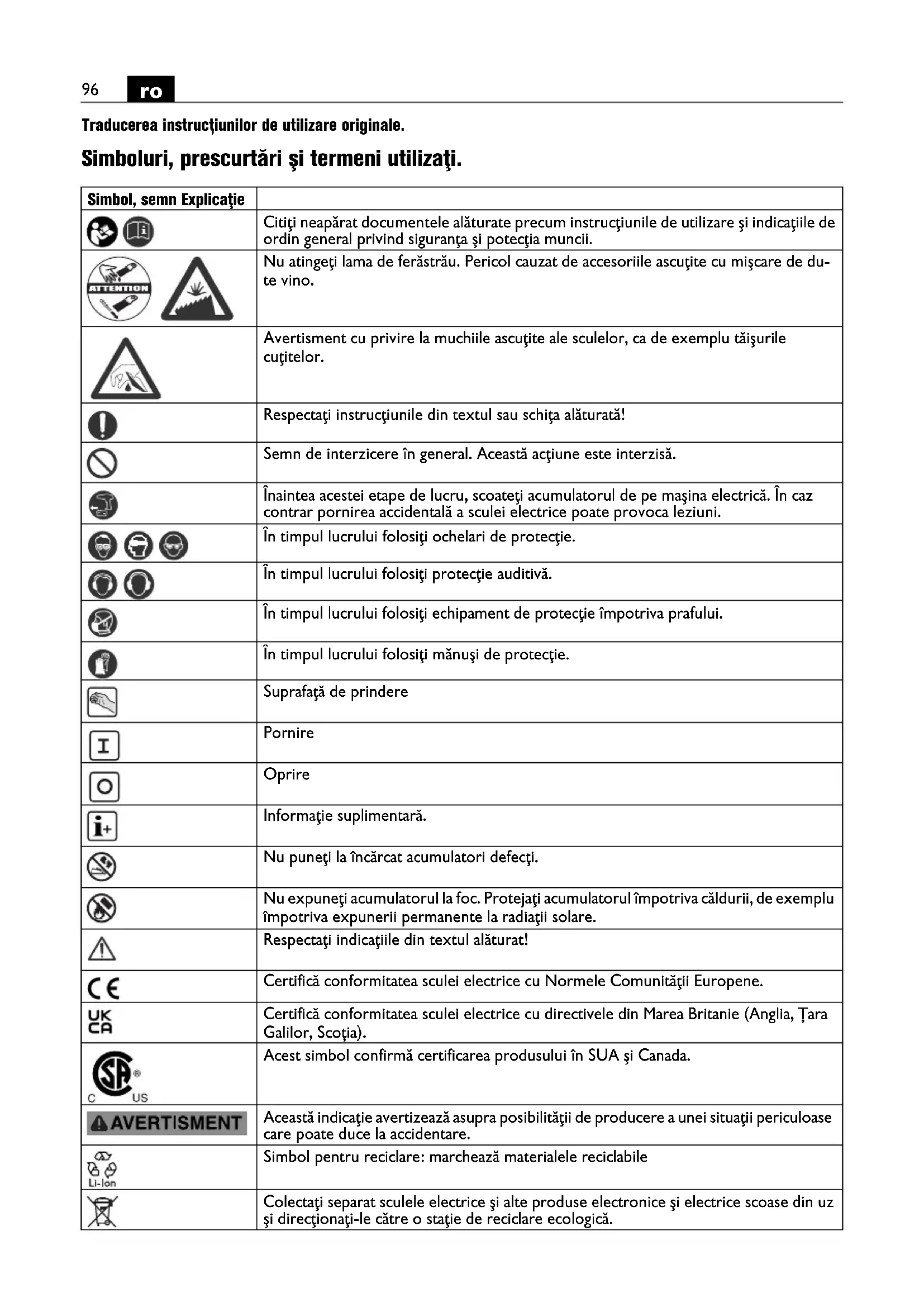 Traducerea instrucțiunilor de utilizare originale. Simboluri, prescurtări şi termeni utilizaţi. Simbol, semn Explicaţie Citiţi neapărat documentele alăturate precum instrucţiunile de utilizare şi indicaţiile de ordin general privind siguranţa şi potecţia muncii. Nu atingeţi lama de ferăstrău. Pericol cauzat de accesoriile ascuţite cu mişcare de du- te vino. Avertisment cu privire la muchiile ascuţite ale sculelor, ca de exemplu tăişurile cuţitelor. Respectaţi instrucţiunile din textul sau schiţa alăturată! Semn de interzicere în general. Această acţiune este interzisă. Înaintea acestei etape de lucru, scoateţi acumulatorul de pe maşina electrică. În caz contrar pornirea accidentală a sculei electrice poate provoca leziuni. În timpul lucrului folosiţi ochelari de protecţie. În timpul lucrului folosiţi protecţie auditivă. În timpul lucrului folosiţi echipament de protecţie împotriva prafului. În timpul lucrului folosiţi mănuşi de protecţie. Suprafaţă de prindere Pornire Oprire Informaţie suplimentară. Nu puneţi la încărcat acumulatori defecţi. Nu expuneţi acumulatorul la foc. Protejaţi acumulatorul împotriva căldurii, de exemplu împotriva expunerii permanente la radiaţii solare. Respectaţi indicaţiile din textul alăturat! Certifică conformitatea sculei electrice cu Normele Comunităţii Europene. Certifică conformitatea sculei electrice cu directivele din Marea Britanie (Anglia, Țara Galilor, Scoția). Acest simbol confirmă certificarea produsului în SUA şi Canada. Această indicaţie avertizează asupra posibilităţii de producere a unei situaţii periculoase care poate duce la accidentare. Simbol pentru reciclare: marchează materialele reciclabile Colectaţi separat sculele electrice şi alte produse electronice şi electrice scoase din uz şi direcţionaţi-le către o staţie de reciclare ecologică.97