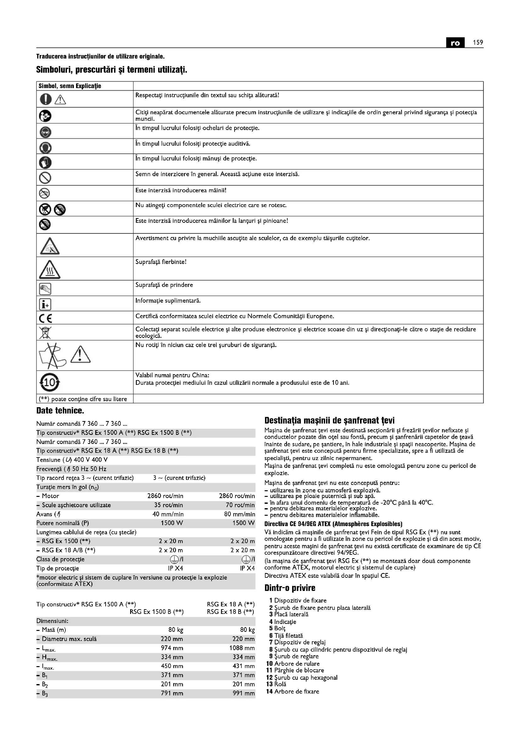 Và indicam cà masinile de sanfrenat tevi Fein de tipul RSG Ex (^**) nu sunt omologate pentru a fi utilizez in zone cu pericol de exploze si cà din acest motiv, pentru aceste masini de sanfrenat tevi nu exista certificate de examinare de tip CE corespunzatoare directivei 94/9EG.