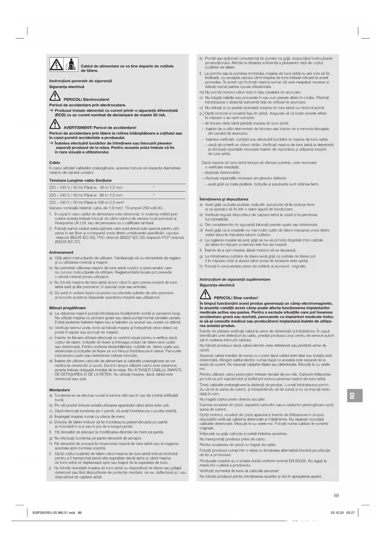 ) Opriţi motorul și scoateţi fișa din priză. Asiguraţi-vă că toate piesele aflate în mișcare s-au oprit complet: – de fiecare dată când părăsiţi mașina de tuns iarbă; – înainte de a slăbi elementele de blocare sau înainte de a remedia blocajele din canalul de aruncare; – înaintea verificării, curăţării sau efectuării lucrărilor la mașina de tuns iarbă; – dacă aţi nimerit un obiect străin. Verificaţi mașina de tuns iarbă la deteriorări și efectuaţi reparaţiile necesare înainte de repornirea și utilizarea mașinii de tuns iarbă. Dacă mașina de tuns iarbă începe să vibreze puternic, este necesară o verificare imediată: – depistaţi deteriorările; – efectuaţi reparaţiile necesare ale pieselor defecte; – aveţi grijă ca toate piuliţele, bolţurile și șuruburile sunt strânse ferm. Întreţinerea şi depozitarea a) Aveţi grijă ca toate piuliţele, bolţurile, șuruburile să fie strânse ferm și ca aparatul să fie într-o stare sigură de funcţionare. b) Verificaţi regulat dispozitivul de captare iarbă la uzură și la pierderea funcţionalităţii. c) Din considerente de siguranţă înlocuiţi piesele uzate sau deteriorate. d) Aveţi grijă că la mașinile cu mai multe cuţite de tăiere mișcarea uneia dintre cuţite duce la mișcarea tuturor cuţitelor. e) La reglarea mașinii să aveţi grijă să nu vă prindeţi degetele între cuţitele de tăiere în mișcare și elemen tele fixe ale mașinii. f) Înainte de a opri mașina, lăsaţi motorul să se răcească. g) La întreţinerea cuţitelor de tăiere aveţi grijă ca cuţitele de tăiere pot fi în mișcare chiar și atunci când sursa de tensiune este oprită. h) Folosiţi în exclusivitate piese de schimb și accesorii originale. Instrucţiuni de siguranţă suplimentare Siguranţa electrică PERICOL! Stop cardiac! În timpul funcţionării acest produs generează un câmp electromagnetic. În anumite condiţii acest câmp poate afecta funcţionarea implanturilor medicale active sau pasive. Pentru a exclude situaţiile care pot însemna accidentare gravă sau mortală, persoanele cu implanturi medicale trebu- ie să-și consulte medicul sau producătorul implantului înainte de utiliza- rea acestui produs. Înainte de utilizare verificaţi cablul la urme de deteriorări și îmbătrânire. În cazul identificării unei defecțiuni la cablu, predați produsul unui centru de service autori- zat în vederea înlocuirii cablului. Nu folosiţi produsul dacă cablul electric este deteriorat sau prezintă urme de uzură. Separaţi cablul imediat de sursa cu curent dacă cablul este tăiat sau izolaţia este deteriorată. Atingeţi cablul electric numai după ce aceasta este separat de la sursa de curent. Nu reparaţi cablurile tăiate sau deteriorate. Înlocuiţi-le cu unele noi. Pentru utilizare cablul prelungitor trebuie derulat de pe rolă. Cablurile înfășurate pe rolă se pot supraîncălzi și astfel pot reduce puterea mașinii de tuns iarbă. Ţineţi cablurile prelungitoare la distanţă de produs. Lucraţi întotdeauna pornin- du-vă de la sursa de curent, și îndepărtându-vă de sursă și nu vă mișcaţi nicio- dată în cerc. Nu trageţi cablul peste obiecte ascuţite. Înaintea scoaterii din priză, separării cablurilor sau a cablurilor prelungitoare opriţi sursa de curent. Opriţi motorul, scoateţi din priză aparatul și înainte de înfășurarea în scopul depozitării verificaţi cablul la deteriorări și îmbătrânire. Nu reparaţi niciodată cablurile deteriorate. Înlocuiţi-le cu unele noi. Folosiţi numai cabluri de schimb originale. Înfășuraţi cu grijă cablurile și evitaţi îndoirea acestora. Nu transportaţi produsul prins de cablu. Pentru scoaterea din priză nu trageţi de cablu. Folosiţi produsul numai într-o reţea cu tensiunea alterna tivă înscrisă pe plăcuţa de tip a produsului. Produsele noastre au o izolare dublă conform normei EN 60335. Nu legaţi la masă nici o piesă a produsului. Verificaţi domeniul de lucru la cablurile ascunse! Nu folosiţi produsul pentru întreţinerea iazurilor și nici în apropierea apelor. EGP300VEU-20.960.01.indd 89 23.10.20 09:27RO