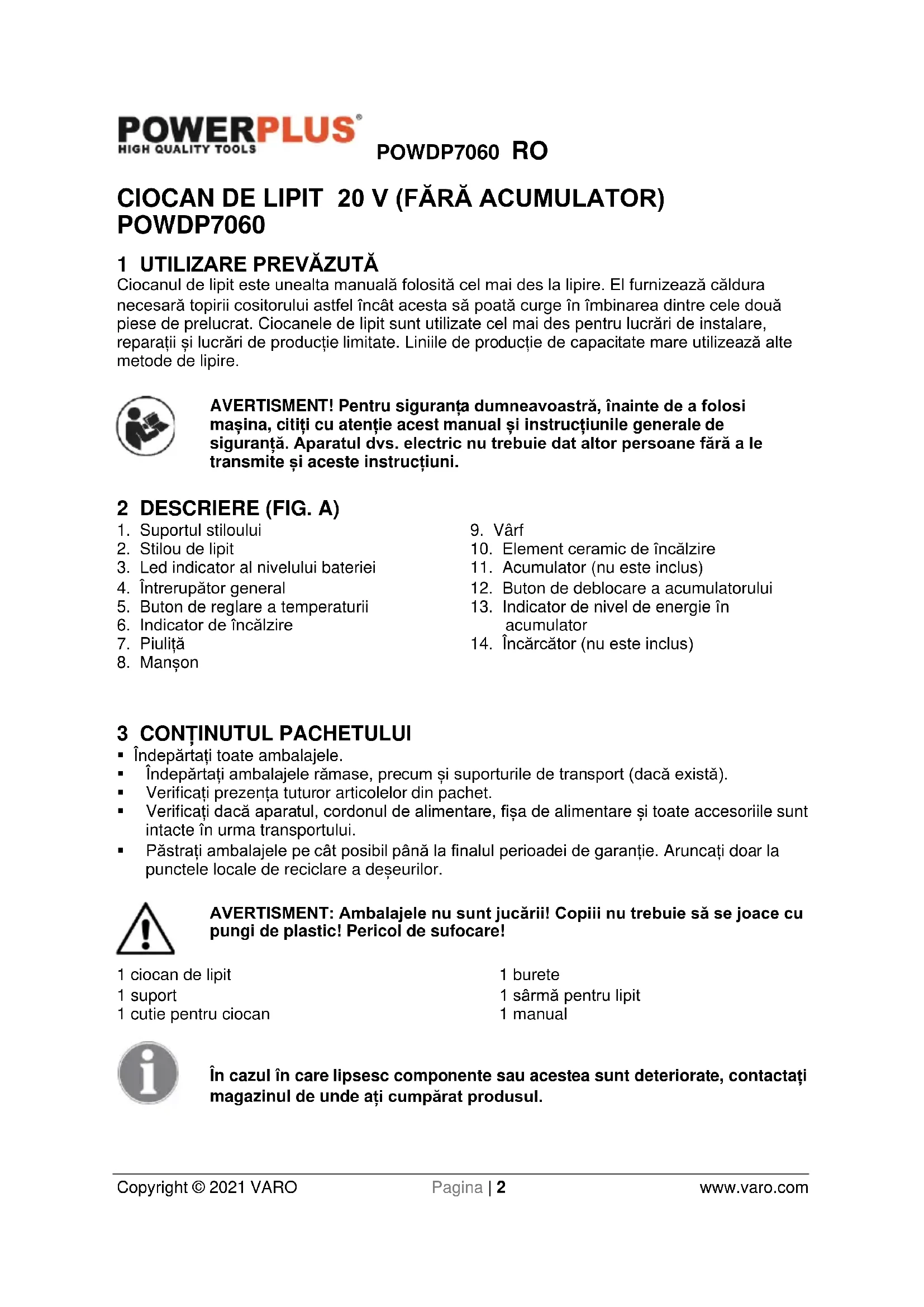 - Păstrați ambalajele pe cât posibil până la finalul perioadei de garanție. Aruncați doar la punctele locale de reciclare a deșeurilor. AVERTISMENT: Ambalajele nu sunt jucării! Copiii nu trebuie să se joace cu pungi de plastic! Pericol de sufocare! 1 ciocan de lipit 1 suport 1 cutie pentru ciocan 1 burete 1 sârmă pentru lipit 1 manual În cazul în care lipsesc componente sau acestea sunt deteriorate, contactați magazinul de unde ați cumpărat produsul.POWDP7060 RO Copyright © 2021 VARO Pagina | 3 www.varo.com 4 SIMBOLURI În acest manual și sau pe mașină se folosesc următoarele simboluri: