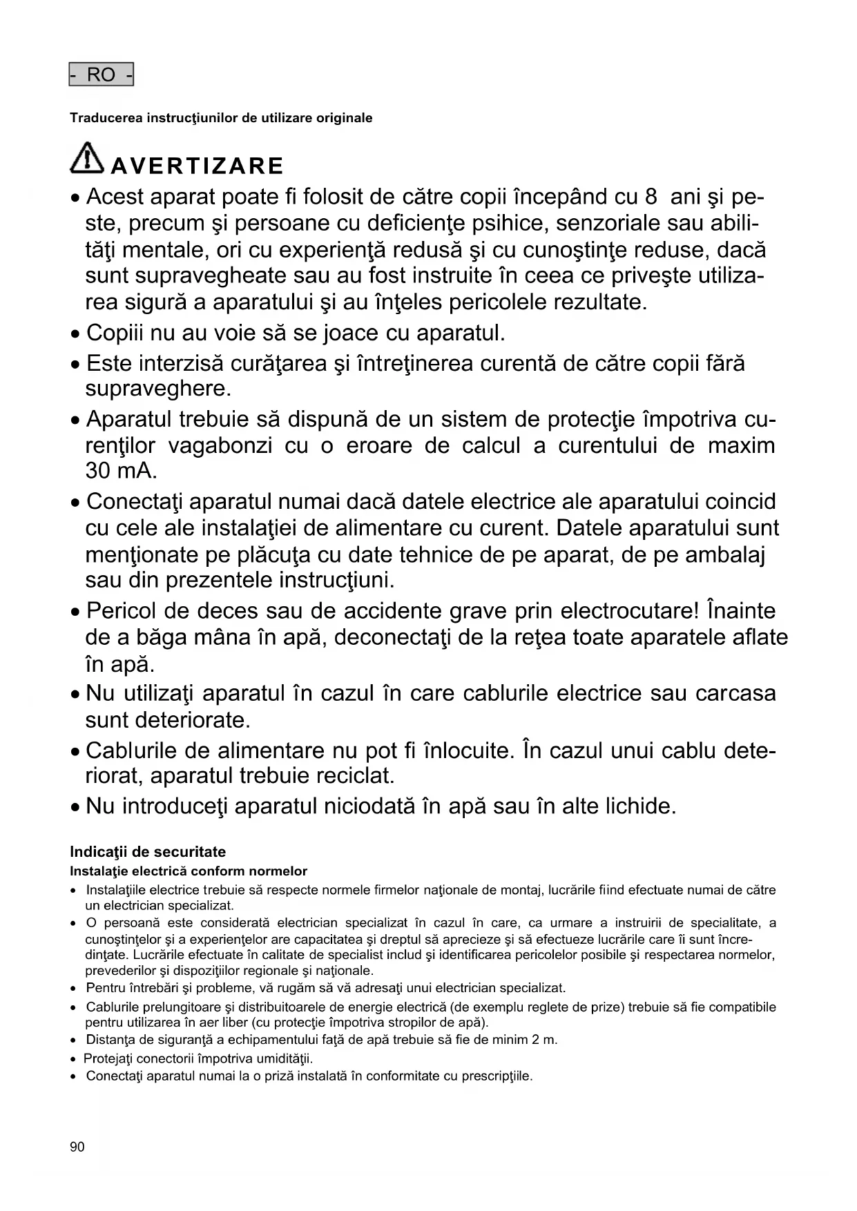 - Pericol de deces sau de accidente grave prin electrocutare! Inainte de a bagamana in apă, deconnectați de la rețea allapte aparatele aflate in apă.
