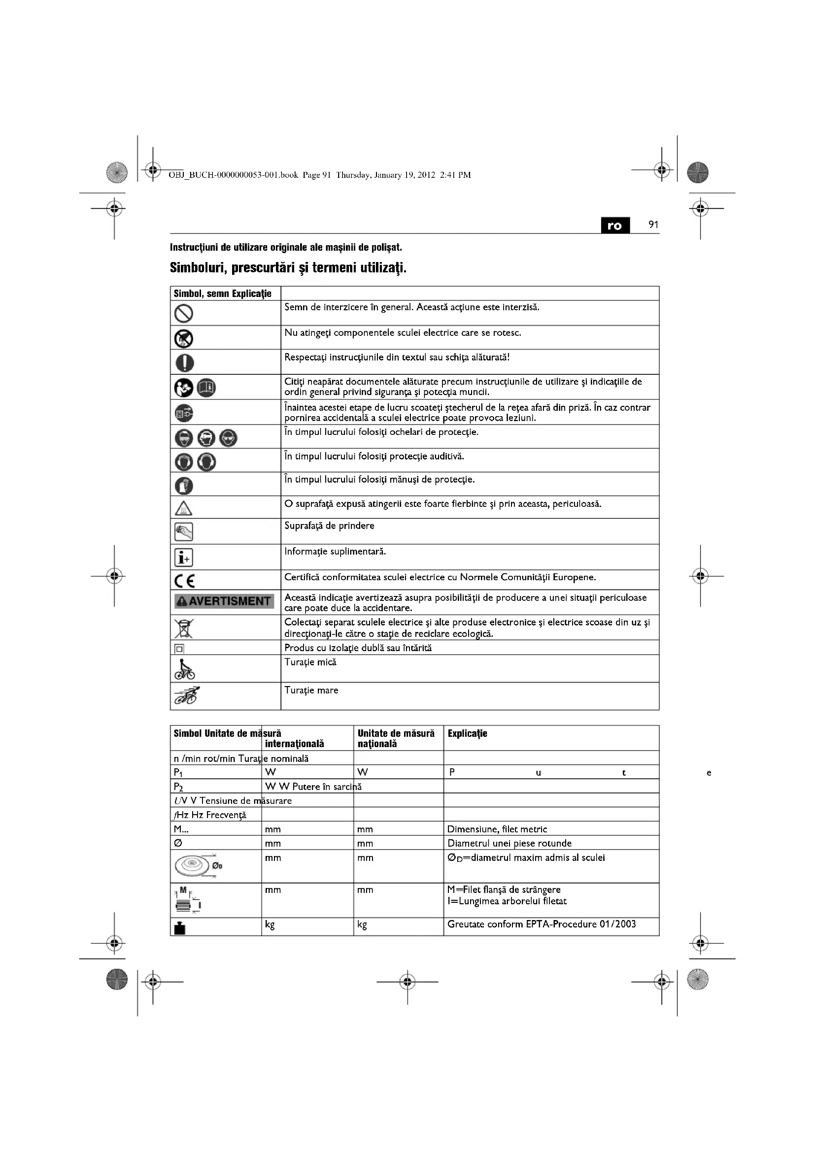 | Simbol Unitate de măsură internatională | Unitate de măsură natională | Explicație |