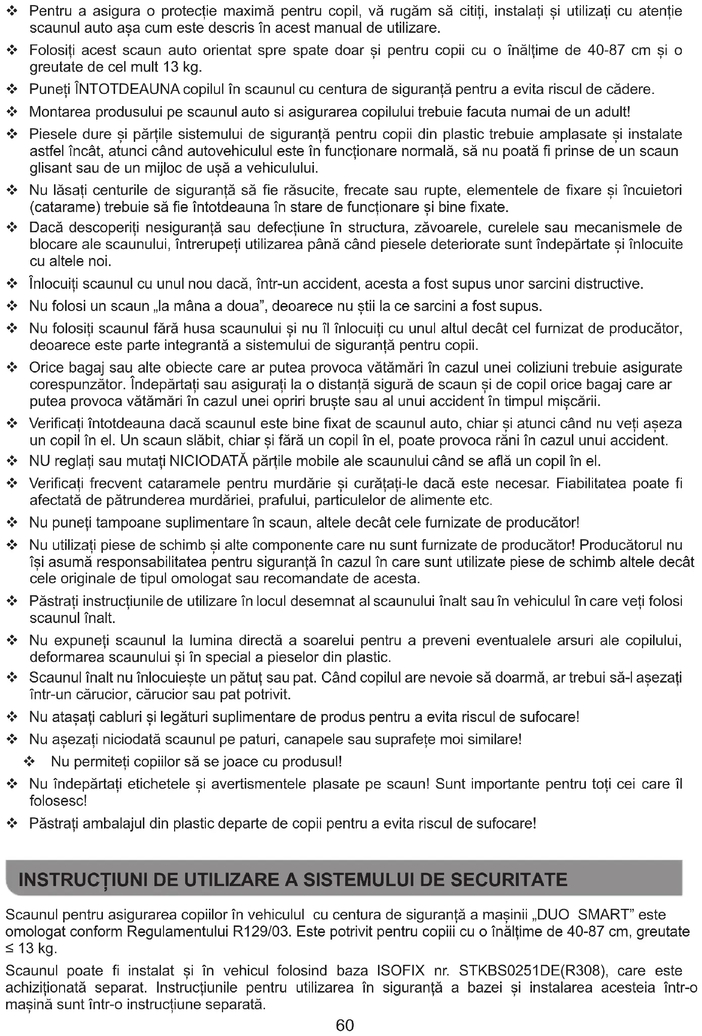 Instalați pe acest scaun numai dacă este echipat cu o centură de siguranță în 3 puncte. ATENŢIE! AVERTIZARE! AVERTISMENT! NU LĂSAȚI NICIODATĂ COPILUL NESUPRAVEGHERE! AVERTISMENT! NU UTILIZAȚI ALTE PUNCTE DE CONTACT DECÂT CELE DESCRIS ÎN INSTRUCȚIUNI ȘI MARCATE PE SCAUNUL AUTO! AVERTISMENT! NU AMPLASATI NICIODATĂ SCAUNUL AUTO PE UN SCAUN DE PASager ECHIPAT CU UN AIRBAG ACTIV! ACEASTA POATE RESULTE LA MOARTE SAU RĂNIRE GRAVĂ! AVERTISMENT! CENTURILE DE SIGURANȚĂ A VEHICULULUI CARE ȚIN SCAUNUL DE SCAUNUL AUTO TREBUIE SĂ FIE STRÂNSE ȘI Strânse! AVERTISMENT! CENTURILE DE SIGURANȚĂ CARE ȚIN COPILUL TREBUIE SĂ FIE STRÂNSE ȘI ÎNCHISE BINE, AJUSTATE ÎN FUNCȚIE DE CORP ȘI DIMENSIUNILE COPILULUI, ÎN CĂ LE ACOPEREA BINE. AVERTISMENT! CUREA BUZELOR TREBUIE SĂ FIE POZIZAȚĂ JOS ȘI FIECARE BARIERĂ DE PROTECȚIE TREBUIE INSTALATĂ CORECT, PENTRU PELVISUL COPILULUI SĂ FĂ SUPINIȚI CORRECTOR FĂRĂ PRESIUNE. AVERTISMENT! NU FACEȚI SCHIMBĂRI, ADULTĂRI SAU MODIFICĂRI SCAUNULUI AUTO FĂRĂ APROBAREA AUTORITĂȚII NOTIFICATE! ESTE PERICOL SĂ NU RESPECȚI EXACT INSTRUCȚIUNILE DE UTILIZARE FURNIZATE DE PRODUCĂTOR! AVERTISMENT! FERĂ DE FOC! 59 Pentru a asigura o protecție maximă pentru copil, vă rugăm să citiți, instalați și utilizați cu atenție scaunul auto așa cum este descris în acest manual de utilizare. Folosiți acest scaun auto orientat spre spate doar și pentru copii cu o înălțime de 40-87 cm și o greutate de cel mult 13 kg. Puneți ÎNTOTDEAUNA copilul în scaunul cu centura de siguranță pentru a evita riscul de cădere. Montarea produsului pe scaunul auto si asigurarea copilului trebuie facuta numai de un adult! Piesele dure și părțile sistemului de siguranță pentru copii din plastic trebuie amplasate și instalate astfel încât, atunci când autovehiculul este în funcționare normală, să nu poată prinse de un scaun glisant sau de un mijloc de ușă a vehiculului. Nu lăsați centurile de siguranță să e răsucite, frecate sau rupte, elementele de xare și încuietori (catarame) trebuie să e întotdeauna în stare de funcționare și bine xate. Dacă descoperiți nesiguranță sau defecțiune în structura, zăvoarele, curelele sau mecanismele de blocare ale scaunului, întrerupeți utilizarea până când piesele deteriorate sunt îndepărtate și înlocuite cu altele noi. Înlocuiți scaunul cu unul nou dacă, într-un accident, acesta a fost supus unor sarcini distructive. Nu folosi un scaun „la mâna a doua”, deoarece nu știi la ce sarcini a fost supus. Nu folosiți scaunul fără husa scaunului și nu îl înlocuiți cu unul altul decât cel furnizat de producător, deoarece este parte integrantă a sistemului de siguranță pentru copii. Orice bagaj sau alte obiecte care ar putea provoca vătămări în cazul unei coliziuni trebuie asigurate corespunzător. Îndepărtați sau asigurați la o distanță sigură de scaun și de copil orice bagaj care ar putea provoca vătămări în cazul unei opriri bruște sau al unui accident în timpul mișcării. Vericați întotdeauna dacă scaunul este bine xat de scaunul auto, chiar și atunci când nu veți așeza un copil în el. Un scaun slăbit, chiar și fără un copil în el, poate provoca răni în cazul unui accident. NU reglați sau mutați NICIODATĂ părțile mobile ale scaunului când se aă un copil în el. Vericați frecvent cataramele pentru murdărie și curățați-le dacă este necesar. Fiabilitatea poate afectată de pătrunderea murdăriei, prafului, particulelor de alimente etc. Nu puneți tampoane suplimentare în scaun, altele decât cele furnizate de producător! Nu utilizați piese de schimb și alte componente care nu sunt furnizate de producător! Producătorul nu își asumă responsabilitatea pentru siguranță în cazul în care sunt utilizate piese de schimb altele decât cele originale de tipul omologat sau recomandate de acesta. Păstrați instrucțiunile de utilizare în locul desemnat al scaunului înalt sau în vehiculul în care veți folosi scaunul înalt. Nu expuneți scaunul la lumina directă a soarelui pentru a preveni eventualele arsuri ale copilului, deformarea scaunului și în special a pieselor din plastic. Scaunul înalt nu înlocuiește un pătuț sau pat. Când copilul are nevoie să doarmă, ar trebui să-l așezați într-un cărucior, cărucior sau pat potrivit. Nu atașați cabluri și legături suplimentare de produs pentru a evita riscul de sufocare! Nu așezați niciodată scaunul pe paturi, canapele sau suprafețe moi similare! Nu permiteți copiilor să se joace cu produsul! Nu îndepărtați etichetele și avertismentele plasate pe scaun! Sunt importante pentru toți cei care îl folosesc! Păstrați ambalajul din plastic departe de copii pentru a evita riscul de sufocare! INSTRUCȚIUNI DE UTILIZARE A SISTEMULUI DE SECURITATE Scaunul pentru asigurarea copiilor în vehiculul cu centura de siguranță a mașinii „DUO SMART” este omologat conform Regulamentului R129/03. Este potrivit pentru copiii cu o înălțime de 40-87 cm, greutate ≤ 13 kg. Scaunul poate fi instalat și în vehicul folosind baza ISOFIX nr. STKBS0251DE(R308), care este achiziționată separat. Instrucțiunile pentru utilizarea în siguranță a bazei și instalarea acesteia într-o mașină sunt într-o instrucțiune separată. 60AVERTISMENT! BAZA DE MONTARE SCAUN DUO SMART (R308) NU FACE PARTEA DIN ACEST KIT ȘI TREBUIE CUMPĂRĂTĂ SEPARAT! IMPORTANT! Urmați exact instrucțiunile și secvența de instalare și utilizare a produsului din textul și ilustrațiile atașate manualului. Verificați siguranța fixării după efectuarea fiecărei operații! VERIFICAȚI ÎNTOTDEAUNA SIGURANȚA ÎNCHIDERII CENTRULUI! După fiecare instalare, asigurați-vă că centurile de siguranță ale mașinii nu sunt răsucite și sunt în poziția corectă.