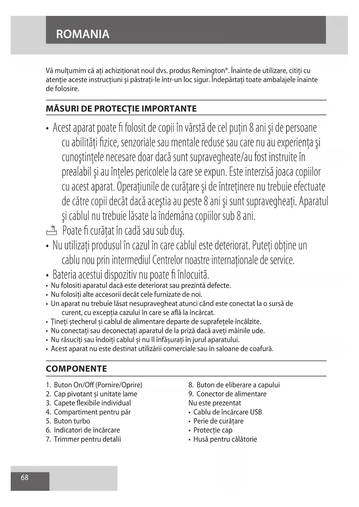 AE68 Vă mulţumim că aţi achiziţionat noul dvs. produs Remington®. Înainte de utilizare, citiţi cu atenţie aceste instrucţiuni şi păstraţi-le într-un loc sigur. Îndepărtaţi toate ambalajele înainte de folosire.