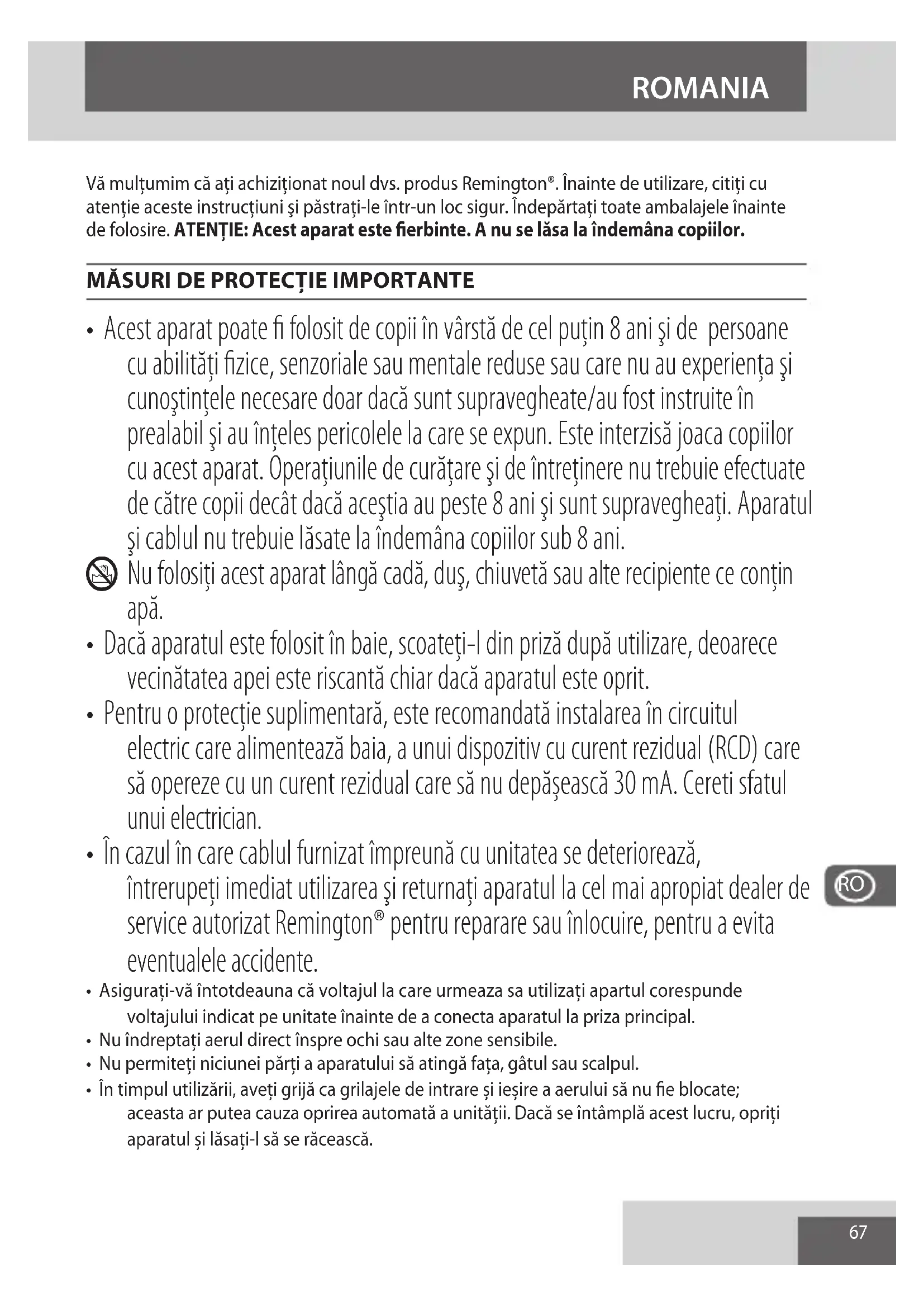- În cazul în care cablul furnizat împreună cu unitatea se deteriorează, întrerupeţi imediat utilizarea şi returnaţi aparatul la cel mai apropiat dealer de service autorizat Remington® pentru reparare sau înlocuire, pentru a evita eventualele accidente.