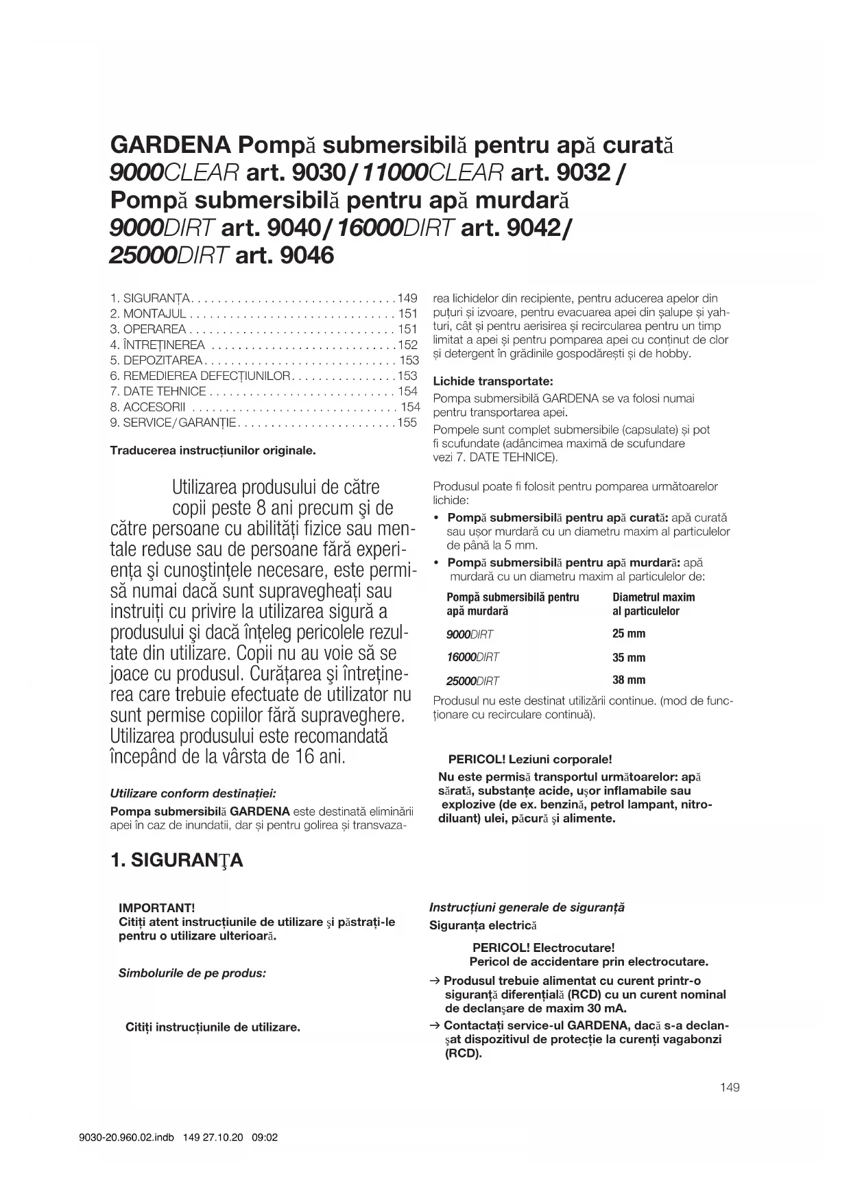 IMPORTANT! Citiţi atent instrucţiunile de utilizare şi păstraţi-le pentru o utilizare ulterioară. Simbolurile de pe produs: Citiţi instrucţiunile de utilizare. Instrucţiuni generale de siguranţă Siguranţa electrică PERICOL! Electrocutare! Pericol de accidentare prin electrocutare. v Produsul trebuie alimentat cu curent printr-o siguranţă diferenţială (RCD) cu un curent nominal de declanşare de maxim 30 mA. v Contactaţi service-ul GARDENA, dacă s-a declan- şat dispozitivul de protecţie la curenţi vagabonzi (RCD). GARDENA Pompă submersibilă pentru apă curată 9000CLEAR art. 9030 / 11000CLEAR art. 9032 / Pompă submersibilă pentru apă murdară 9000DIRT art. 9040 / 16000DIRT art. 9042 / 25000DIRT art. 9046