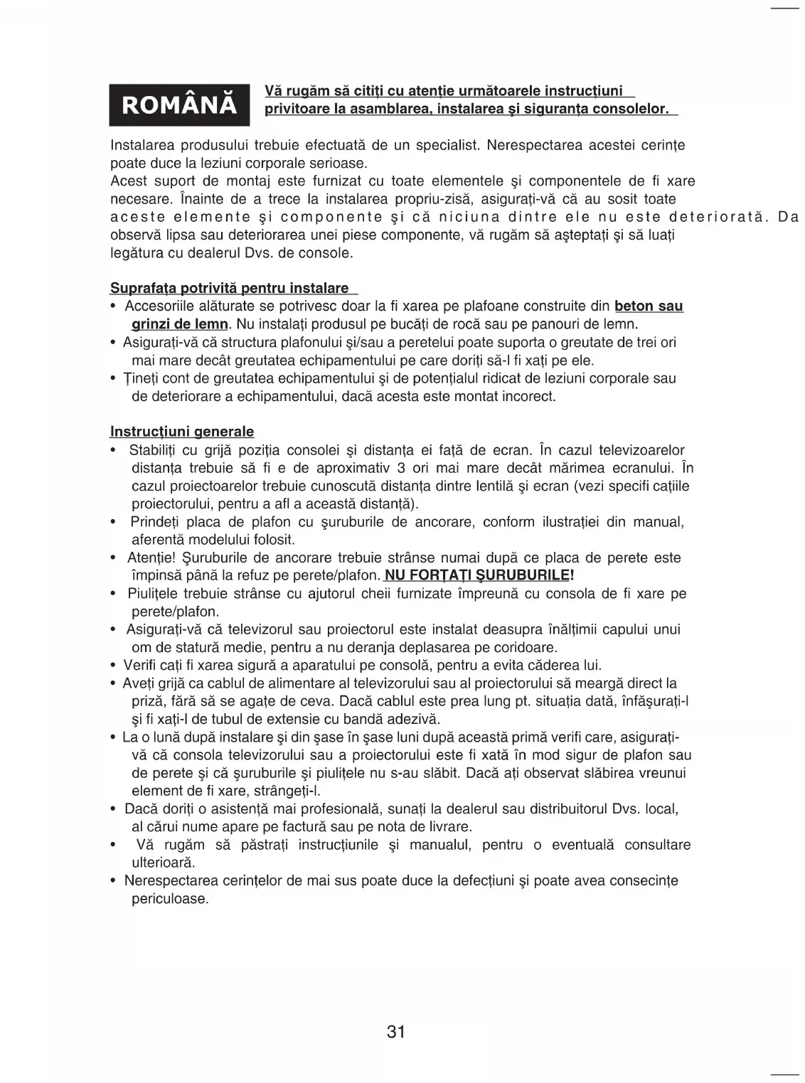 - Všechna loga a názvy výrobků jsou obchodní značky nebo registrované obchodní značky příslušných vlastníků a jsou chráněny příslušnými zákony.31 Vă rugăm să citiţi cu atenţie următoarele instrucţiuni privitoare la asamblarea, instalarea şi siguranţa consolelor. Instalarea produsului trebuie efectuată de un specialist. Nerespectarea acestei cerinţe poate duce la leziuni corporale serioase. Acest suport de montaj este furnizat cu toate elementele şi componentele de fi xare necesare. Înainte de a trece la instalarea propriu-zisă, asiguraţi-vă că au sosit toate aceste elemente şi componente şi că niciuna dintre ele nu este deteriorată. Dacă se observă lipsa sau deteriorarea unei piese componente, vă rugăm să aşteptaţi şi să luaţi legătura cu dealerul Dvs. de console. Suprafaţa potrivită pentru instalare