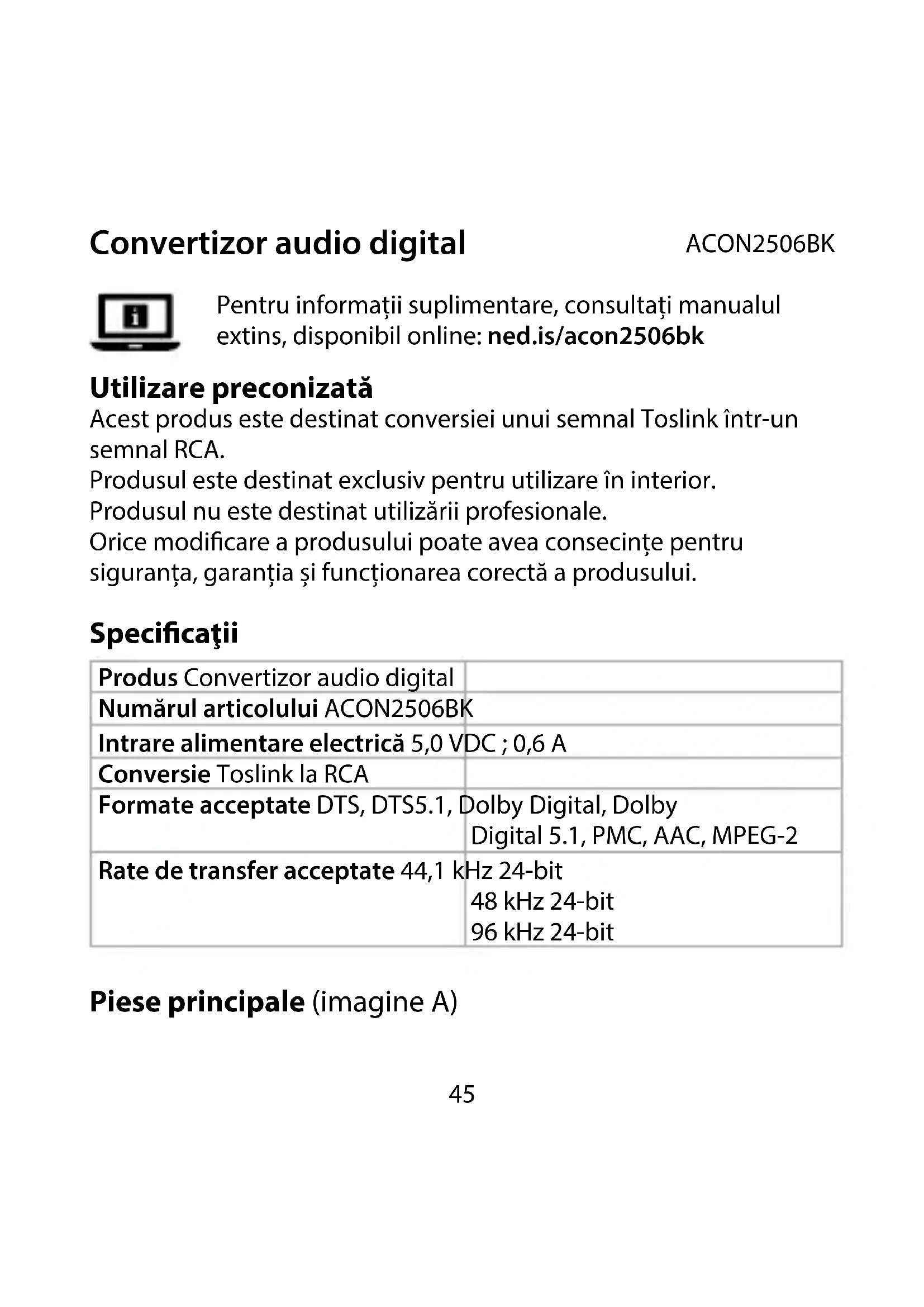 Ghid rapid de inițiere45 Convertizor audio digital ACON2506BK Pentru informații suplimentare, consultați manualul extins, disponibil online: ned.is/acon2506bk Utilizare preconizată Acest produs este destinat conversiei unui semnal Toslink într-un semnal RCA. Produsul este destinat exclusiv pentru utilizare în interior. Produsul nu este destinat utilizării profesionale. Orice modicare a produsului poate avea consecințe pentru siguranța, garanția și funcționarea corectă a produsului. Specicaţii Produs Convertizor audio digital Numărul articolului ACON2506BK Intrare alimentare electrică 5,0 VDC ; 0,6 A Conversie Toslink la RCA Formate acceptate DTS, DTS5.1, Dolby Digital, Dolby Digital 5.1, PMC, AAC, MPEG-2 Rate de transfer acceptate 44,1 kHz 24-bit 48 kHz 24-bit 96 kHz 24-bit Piese principale (imagine A)46