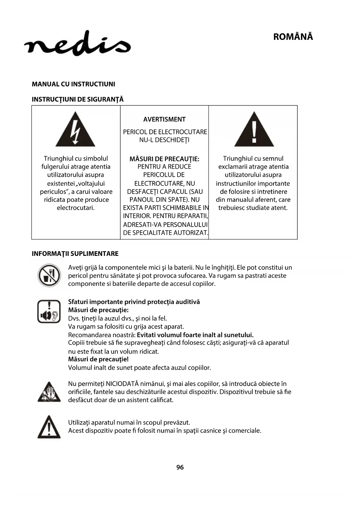 Aveţi grijă la componentele mici şi la baterii. Nu le înghiţiţi. Ele pot constitui un pericol pentru sănătate şi pot provoca sufocarea. Va rugam sa pastrati aceste componente si bateriile departe de accesul copiilor. Sfaturi importante privind protecţia auditivă Măsuri de precauţie: Dvs. ţineţi la auzul dvs., şi noi la fel. Va rugam sa folositi cu grija acest aparat. Recomandarea noastră: Evitati volumul foarte inalt al sunetului. Copiii trebuie să e supravegheaţi când folosesc căşti; asiguraţi-vă că aparatul nu este xat la un volum ridicat. Măsuri de precauţie! Volumul inalt de sunet poate afecta auzul copiilor. Nu permiteţi NICIODATĂ nimănui, şi mai ales copiilor, să introducă obiecte în oriciile, fantele sau deschizăturile acestui dispozitiv. Dispozitivul trebuie să e desfăcut doar de un asistent calicat. Utilizaţi aparatul numai în scopul prevăzut. Acest dispozitiv poate folosit numai în spaţii casnice şi comerciale.97 ROMÂNĂ Păstraţi acest manual de instrucţiuni pentru consultări ulterioare. Instrucţiuni privind protecţia mediului Nu eliminaţi acest produs odată cu gunoiul menajer la sfârşitul vieţii sale utile; predaţi-l la un punct de colectare pentru reciclarea aparatelor electrice şi electronice. Simbolul de pe produs, de pe instrucţiunile de utilizare sau de pe ambalaj vă va informa asupra metodelor de eliminare. Materialele sunt reciclabile, aşa cum menţionează marcajele aferente. Prin reciclare, reciclare materială sau alte forme de reutilizare a aparatelor vechi realizaţi o contribuţie importantă la protecţia mediului nostru înconjurător. Întrebaţi autorităţile locale care sunt punctele autorizate de eliminare. Nu obstrucţionaţi ventilaţia dispozitivului. Asiguraţi-vă că sistemul de ventilaţie al aparatului nu este blocat de perdele, ziare, mobilă sau alte tipuri de obiecte. Sistemul de ventilaţie nu trebuie să e niciodată obstrucţionat de obiecte străine! Prin supraîncălzire, dispozitivul se poate deteriora grav şi îşi poate reduce performanţele şi viaţa utilă. Căldura Nu expuneți aparatul la lumina directă a soarelui. Asiguraţi-vă că aparatul nu este expus surselor de căldură directă precum caloriferele sau focul deschis. Nu acoperiţi fantele de ventila ale aparatului. Umiditatea şi curăţarea Acest aparat nu este impermeabil! Nu scufundaţi aparatul în apă. Nu îi permiteţi aparatului să intre în contact cu apa. Dacă în aparat intră apă, ea poate provoca daune grave. Nu utilizaţi agenţi de curăţare ce conţin alcool, amoniac, benzen sau abrazivi, deoarece pot deteriora aparatul. Pentru curăţare, folosiţi o cârpă moale şi umezită. Reciclare profesională Bateriile si ambalajul nu trebuie aruncate la gunoiul menajer. Bateriile trebuie trimise unui punct special de colectare a baterii vechi. Separarea ambalajelor ce sunt eliminate este o metodă de protejare a mediului.