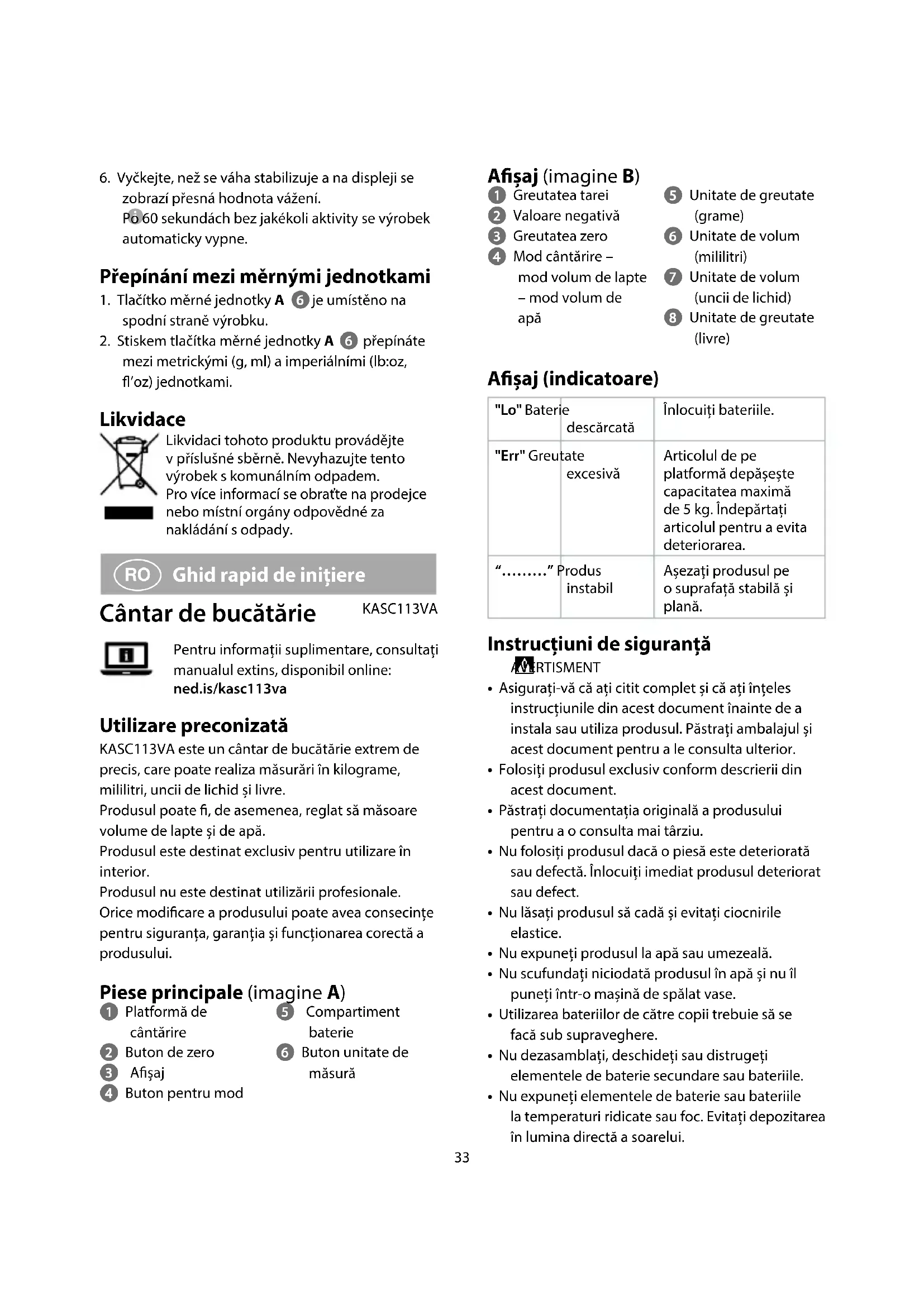 Ghid rapid de inițiere Cântar de bucătărie KASC113VAPentru informații suplimentare, consultați manualul extins, disponibil online: ned.is/kasc113va Utilizare preconizată KASC113VA este un cântar de bucătărie extrem de precis, care poate realiza măsurări în kilograme, mililitri, uncii de lichid și livre.Produsul poate , de asemenea, reglat să măsoare volume de lapte și de apă.Produsul este destinat exclusiv pentru utilizare în interior.Produsul nu este destinat utilizării profesionale.Orice modicare a produsului poate avea consecințe pentru siguranța, garanția și funcționarea corectă a produsului. Piese principale (imagine A) 1 Platformă de cântărire2 Buton de zero3 Așaj4 Buton pentru mod5 Compartiment baterie6 Buton unitate de măsură34