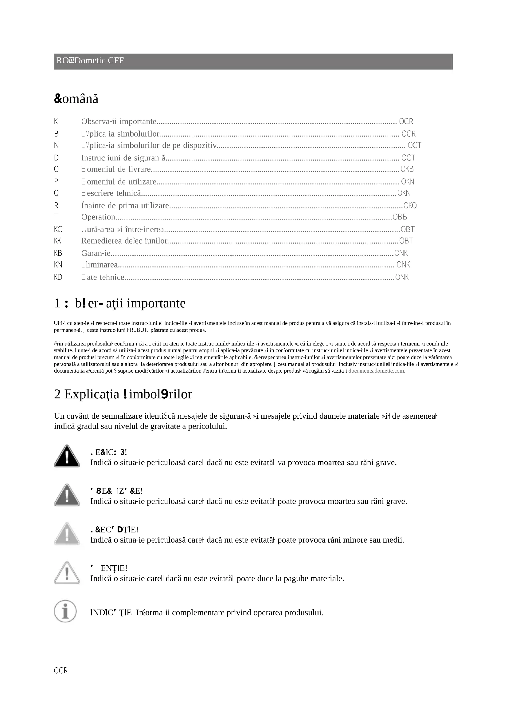 - 14 Date tehnice 1 Observaţii importante Citiţi cu atenţie şi respectaţi toate instrucţiunile, indicaţiile şi avertismentele incluse în acest manual de produs pentru a vă asigura că instalaţi, utilizaţi şi întreţineţi produsul în permanenţă. Aceste instrucţiuni TREBUIE păstrate cu acest produs. Prin utilizarea produsului, confirmaţi că aţi citit cu atenţie toate instrucţiunile, indicaţiile şi avertismentele şi că înţelegeţi şi sunteţi de acord să respectaţi termenii şi condiţiile stabilite. Sunteţi de acord să utilizaţi acest produs numai pentru scopul şi aplicaţia prevăzute şi în conformitate cu instrucţiunile, indicaţiile şi avertismentele prezentate în acest manual de produs, precum şi în conformitate cu toate legile şi reglementările aplicabile. Nerespectarea instrucţiunilor şi avertismentelor prezentate aici poate duce la vătămarea personală a utilizatorului sau a altora, la deteriorarea produsului sau a altor bunuri din apropiere. Acest manual al produsului, inclusiv instrucţiunile, indicaţiile şi avertismentele şi documentaţia aferentă pot fi supuse modificărilor şi actualizărilor. Pentru informaţii actualizate despre produs, vă rugăm să vizitaţi documents.dometic.com. 2 Explicaţia simbolurilor Un cuvânt de semnalizare identifică mesajele de siguranţă şi mesajele privind daunele materiale şi, de asemenea, indică gradul sau nivelul de gravitate a pericolului. PERICOL! Indică o situaţie periculoasă care, dacă nu este evitată, va provoca moartea sau răni grave. AVERTIZARE! Indică o situaţie periculoasă care, dacă nu este evitată, poate provoca moartea sau răni grave. PRECAUŢIE! Indică o situaţie periculoasă care, dacă nu este evitată, poate provoca răni minore sau medii. ATENŢIE! Indică o situaţie care, dacă nu este evitată, poate duce la pagube materiale. INDICAŢIE Informaţii complementare privind operarea produsului. 508Dometic CFFRO 3 Explicaţia simbolurilor de pe dispozitiv Atenţie! Risc de incendiu. Materiale inflamabile. 4 Instrucţiuni de siguranţă PERICOL! Pericol de electrocutare Pe bărci: În cazul în care aparatul este alimentat de la reţeua de alimentare, asiguraţi-vă că alimentarea cu curent are un dispozitiv de curent rezidual (RCD), întrerupător de curent rezidual (RCCB) sau un întreruptor pentru lipsa circuitului de împământare (GFCI). Instalarea, în special în zonele potenţial umede, trebuie să fie în conformitate cu toate reglementările de instalare aplicabile. Nu atingeţi cablurile expuse cu mâinile goale. Acest lucru se aplică în special atunci când dispozitivul este utilizat de la reţeaua de curent alternativ. Înainte de a porni aparatul, asiguraţi-vă că linia de alimentare şi ştecherul sunt uscate. AVERTIZARE! Pericol de explozie Nu depozitaţi substanţe explozive, cum ar fi tuburile de vopsea cu un propulsor inflamabil în dispozitivul de răcire. AVERTIZARE! Pericol de electrocutare Nu folosiţi aparatul de răcire dacă este deteriorat în mod vizibil. În cazul în care cablul de alimentare al acestui dispozitiv de răcire este deteriorat, acesta trebuie înlocuit cu un cablu de alimentare adecvat sau ansamblu disponibil la producător sau la agentul de service pentru a preveni afectarea siguranţei. Acest aparat de răcire poate fi reparat numai de personal calificat. Reparaţiile necorespunzătoare pot duce la riscuri considerabile. Conectaţi dispozitivul la prize pentru a asigura o conexiune adecvată, în special atunci când dispozitivul trebuie să fie legat la pământ. AVERTIZARE! Pericol de incendiu Când poziţionaţi dispozitivul de răcire, asiguraţi-vă că nu este prins sau deteriorat cablul de alimentare. Nu dispuneţi mai multe prize portabile sau surse de alimentare portabile în partea din spate a dispozitivului. În caz de defectare a circuitului frigorific: p. 531