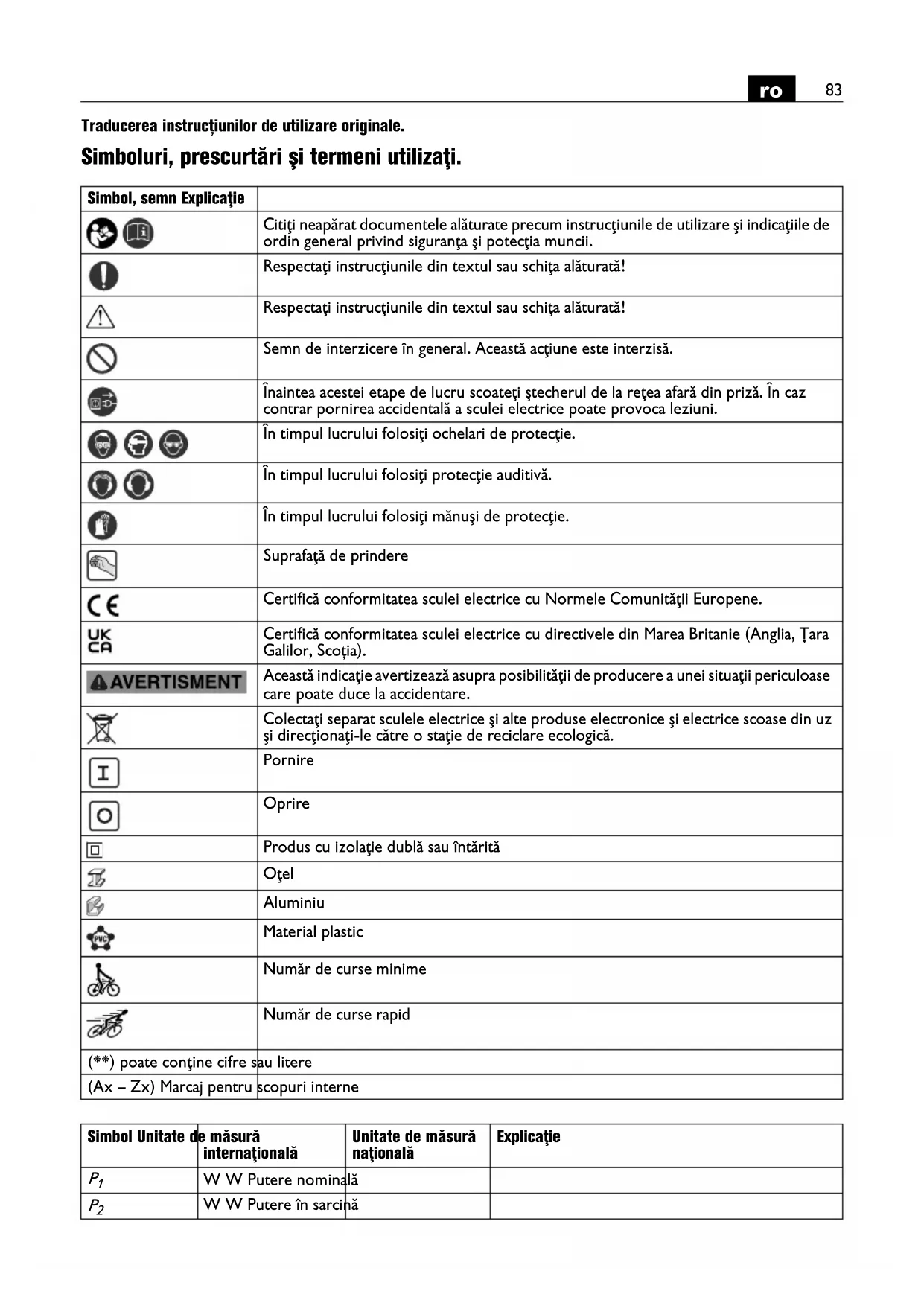 Traducerea instrucțiunilor de utilizare originale. Simboluri, prescurtări şi termeni utilizaţi. Simbol, semn Explicaţie Citiţi neapărat documentele alăturate precum instrucţiunile de utilizare şi indicaţiile de ordin general privind siguranţa şi potecţia muncii. Respectaţi instrucţiunile din textul sau schiţa alăturată! Respectaţi instrucţiunile din textul sau schiţa alăturată! Semn de interzicere în general. Această acţiune este interzisă. Înaintea acestei etape de lucru scoateţi ştecherul de la reţea afară din priză. În caz contrar pornirea accidentală a sculei electrice poate provoca leziuni. În timpul lucrului folosiţi ochelari de protecţie. În timpul lucrului folosiţi protecţie auditivă. În timpul lucrului folosiţi mănuşi de protecţie. Suprafaţă de prindere Certifică conformitatea sculei electrice cu Normele Comunităţii Europene. Certifică conformitatea sculei electrice cu directivele din Marea Britanie (Anglia, Țara Galilor, Scoția). Această indicaţie avertizează asupra posibilităţii de producere a unei situaţii periculoase care poate duce la accidentare. Colectaţi separat sculele electrice şi alte produse electronice şi electrice scoase din uz şi direcţionaţi-le către o staţie de reciclare ecologică. Pornire Oprire Produs cu izolaţie dublă sau întărită Oţel Aluminiu Material plastic Număr de curse minime Număr de curse rapid (**) poate conţine cifre sau litere (Ax – Zx) Marcaj pentru scopuri interne Simbol Unitate de măsură internaţională Unitate de măsură naţională Explicaţie